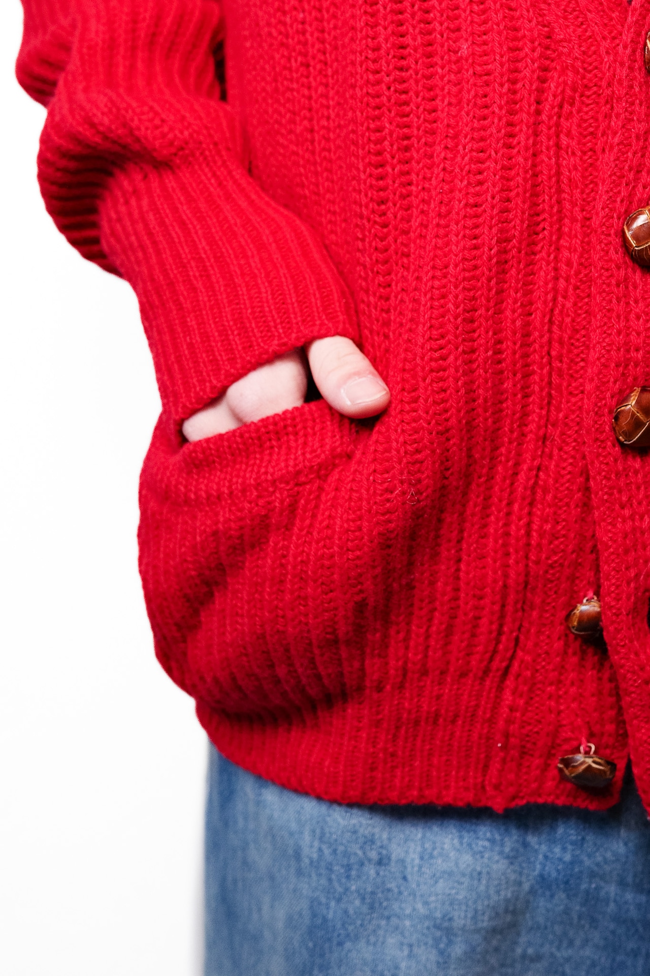 フロントに配されたレザーノット調のボタンは、イタリアのニットウェアにしばしば見られる意匠で、上品なアクセントとして機能しています。ポケットや裾のリブも丁寧に編まれ、全体を自然に引き締める役割を担っています。