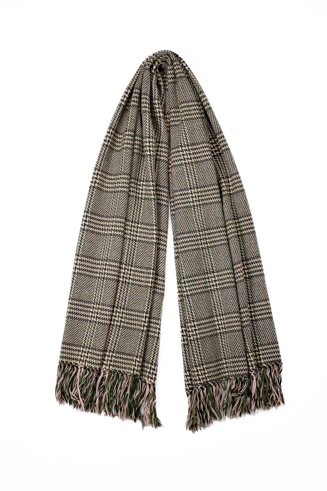 緑・ベージュ・黒・ピンク・オレンジといった複数の糸を織り込むことで、チェックが“平面”ではなく“多層的な表情”を見せる設計。