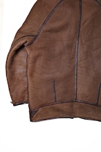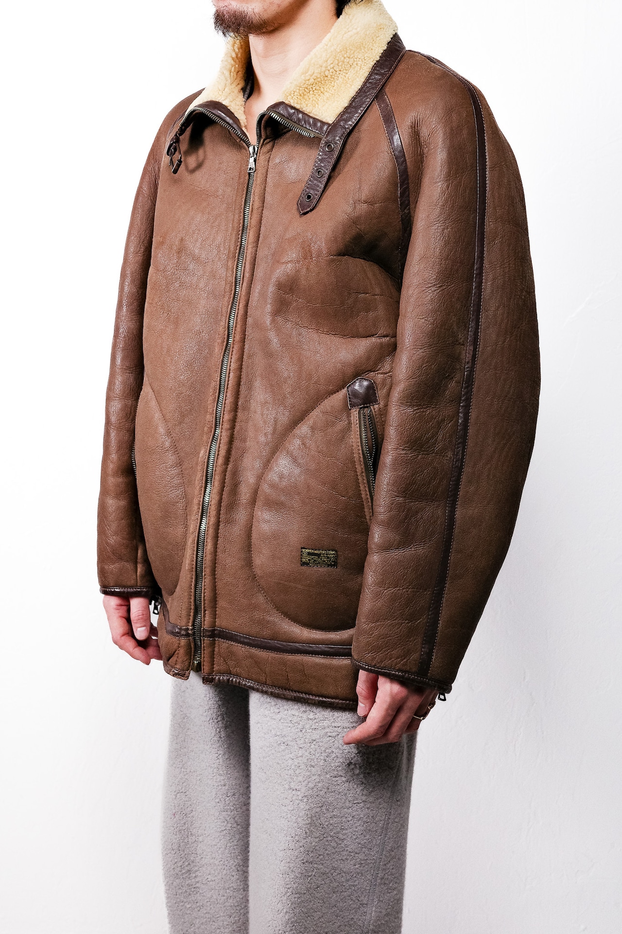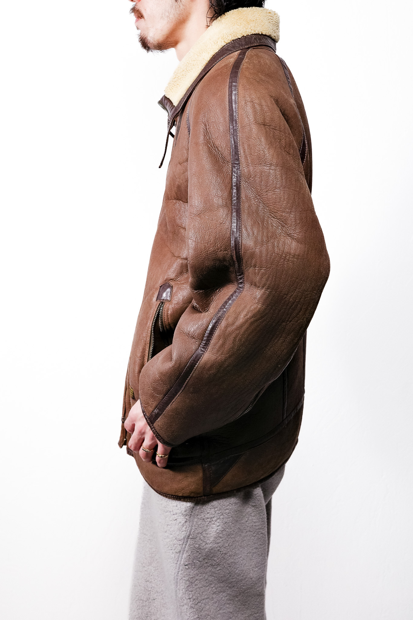 全体のシルエットはゆったりとしたオーバーサイズ。1980〜90年代のムートンアウターらしい迫力があり、厚手のニットの上からでも自然に羽織れます。重量はしっかりありますが、その質量こそがこのジャケットの魅力であり、冬の装いの中心となる力を持っています。