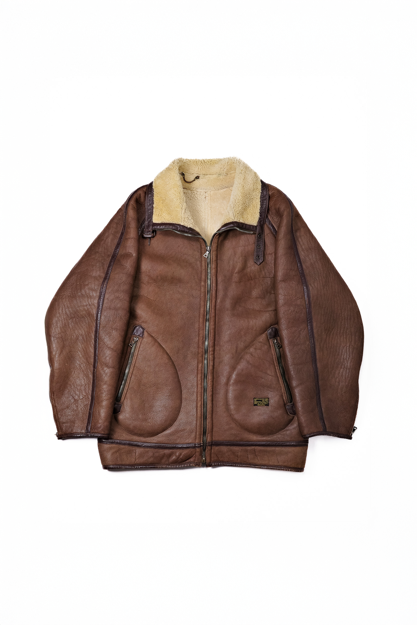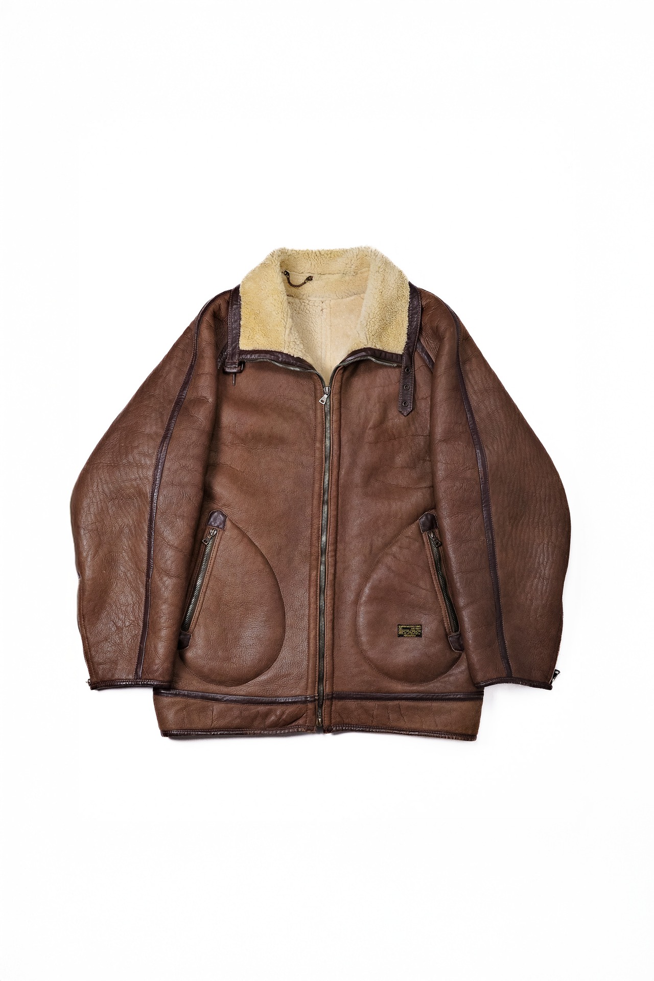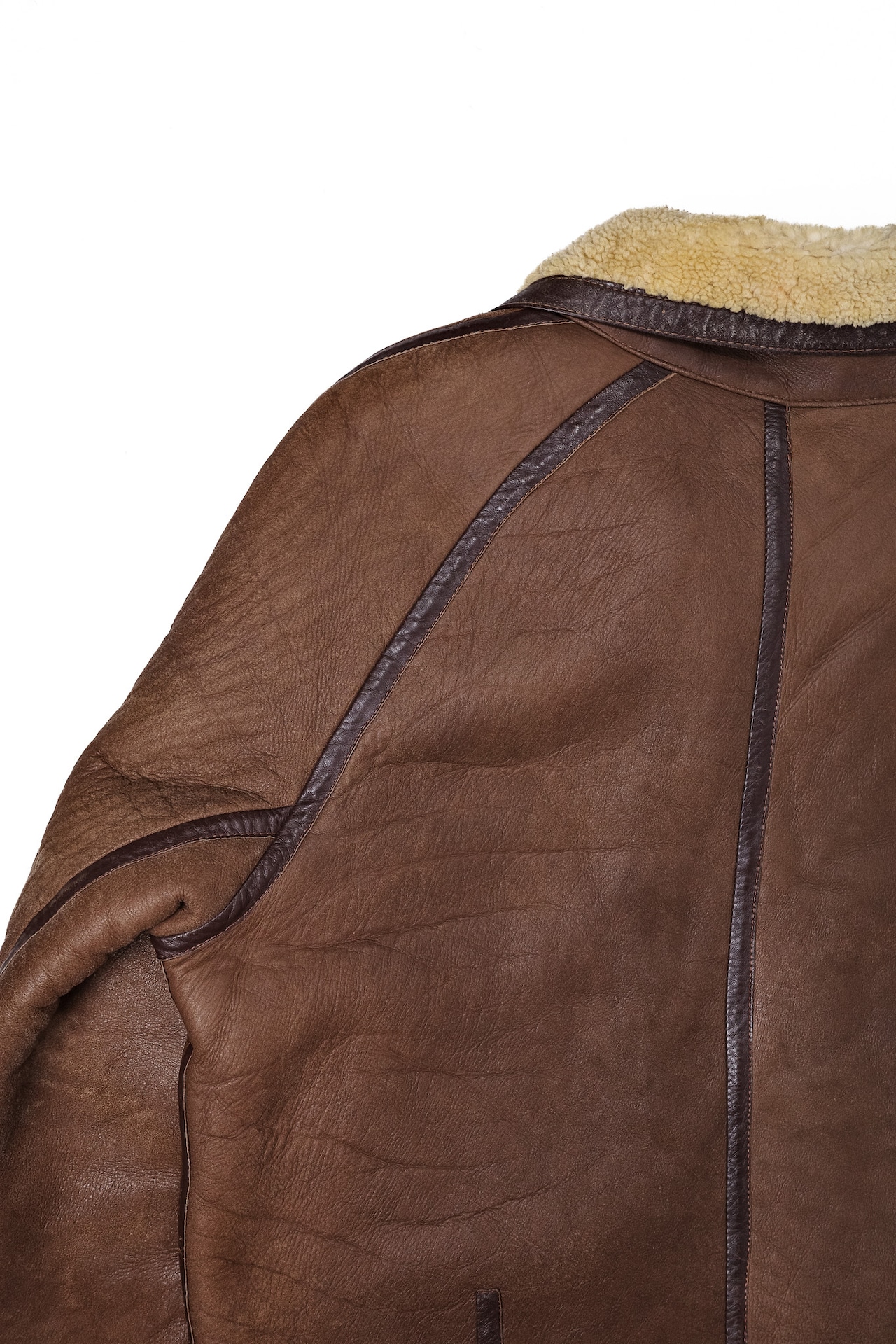 肩から袖にかけての丸みのある一枚革取り、厚いムートンを縫い割るための大きめのパネル配置、襟のストームフラップとベルト構造。