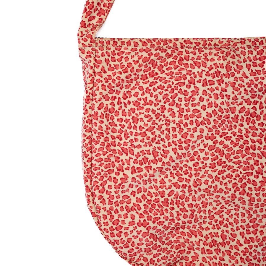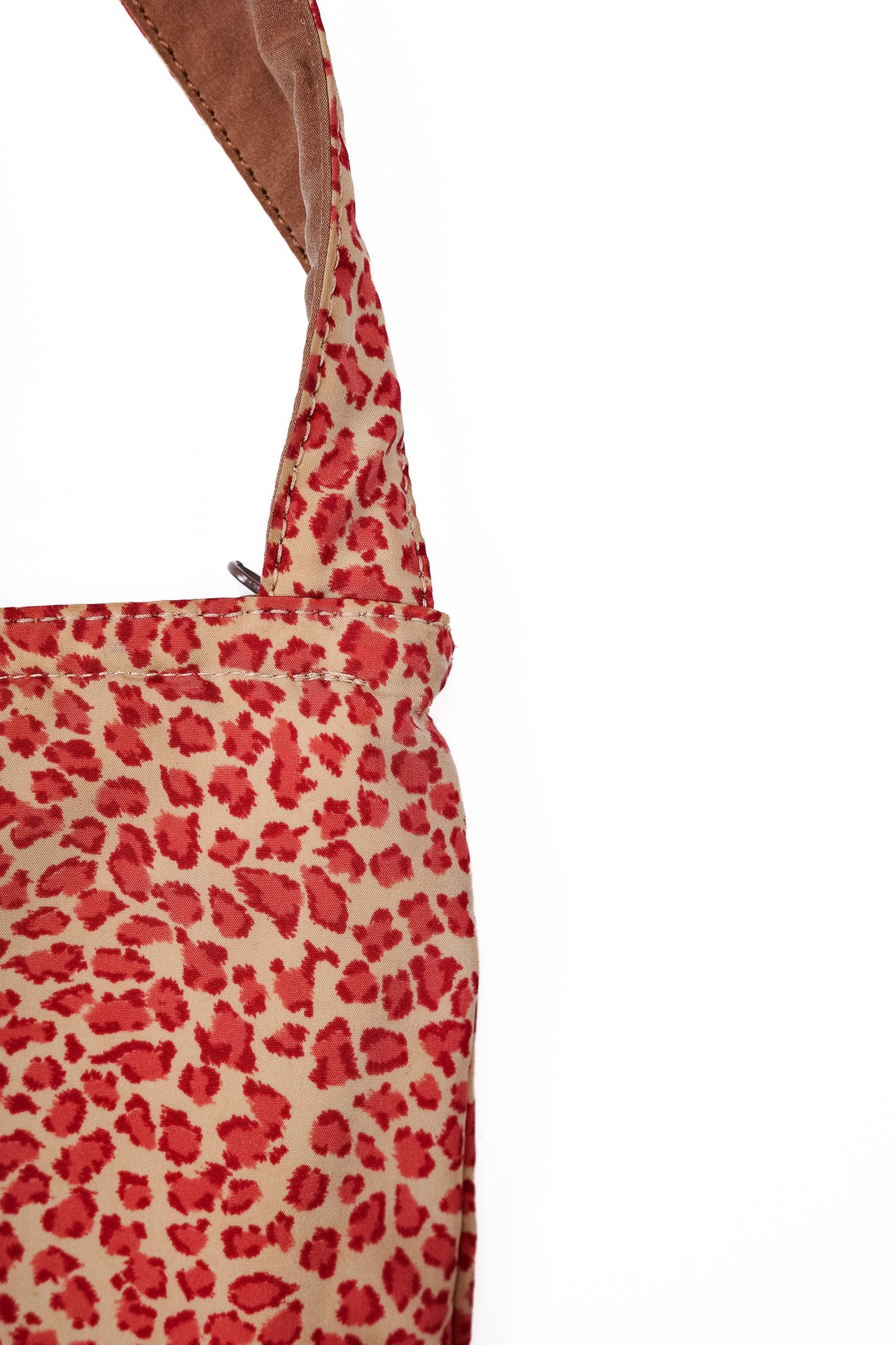 表地に使われているのは、レオパード柄をプリントしたナイロンの上から、ポリウレタン系のコーティングを施した生地。