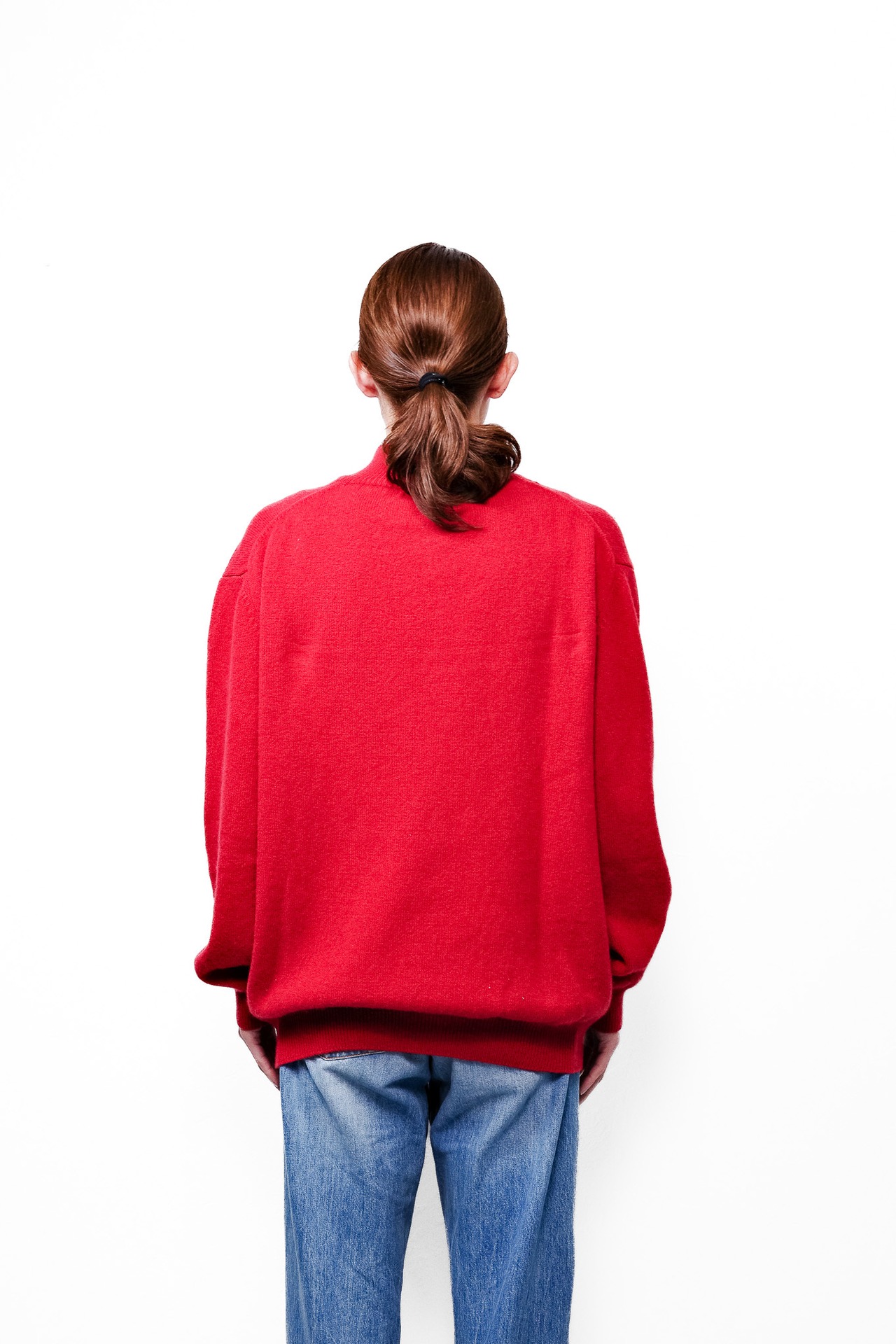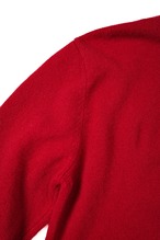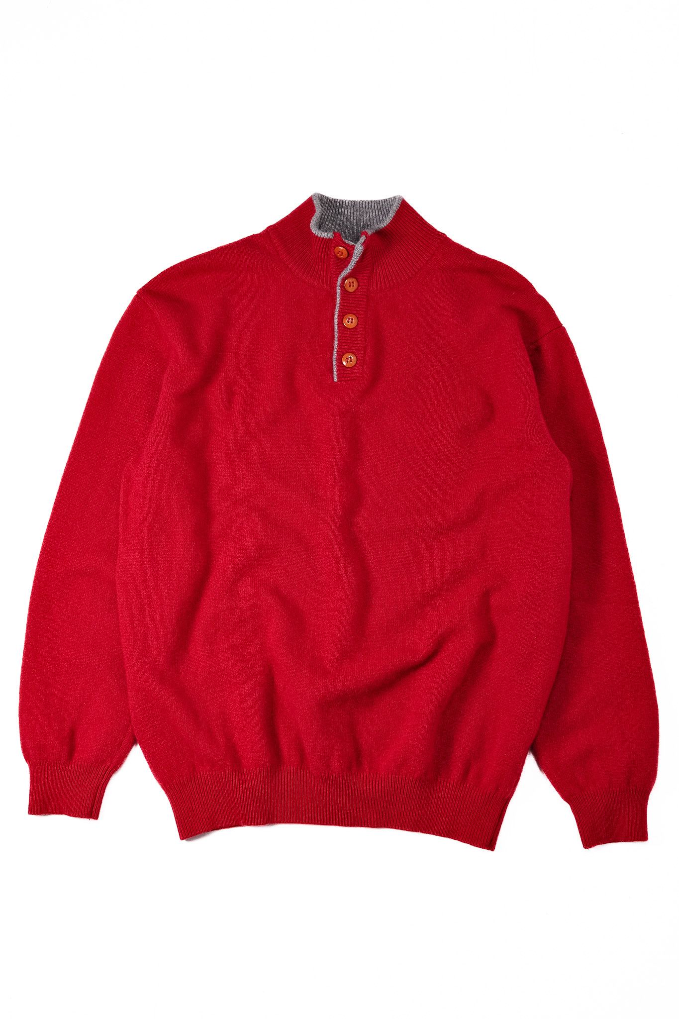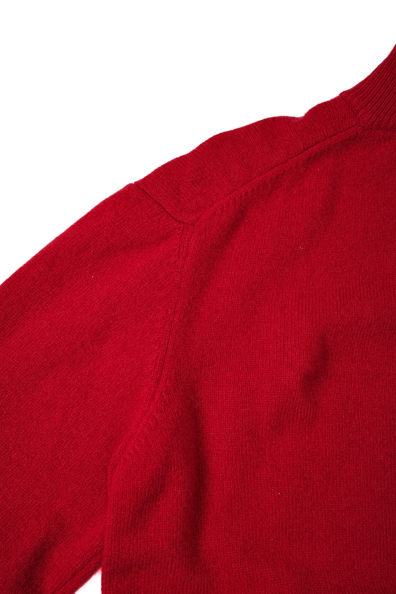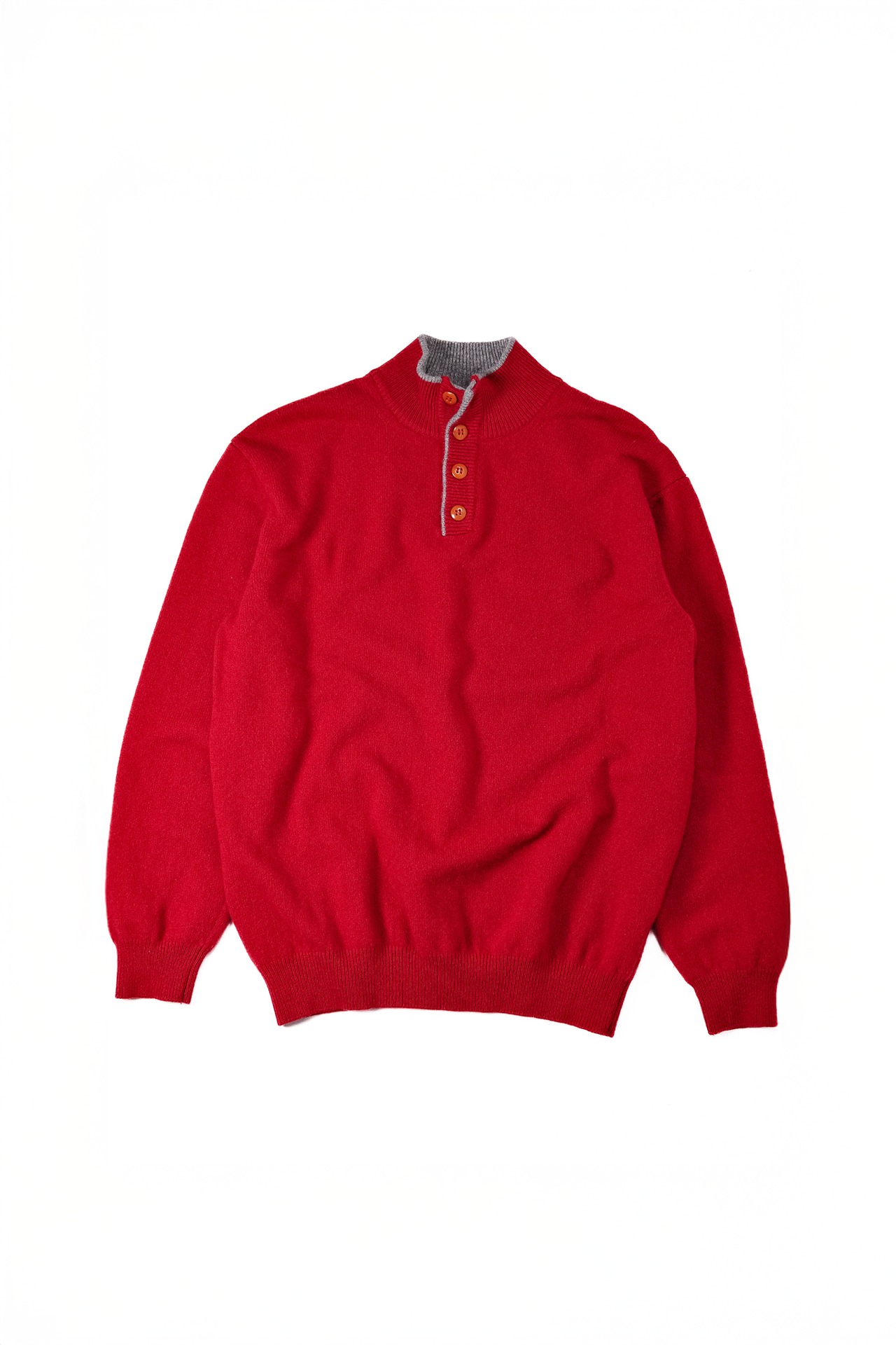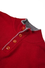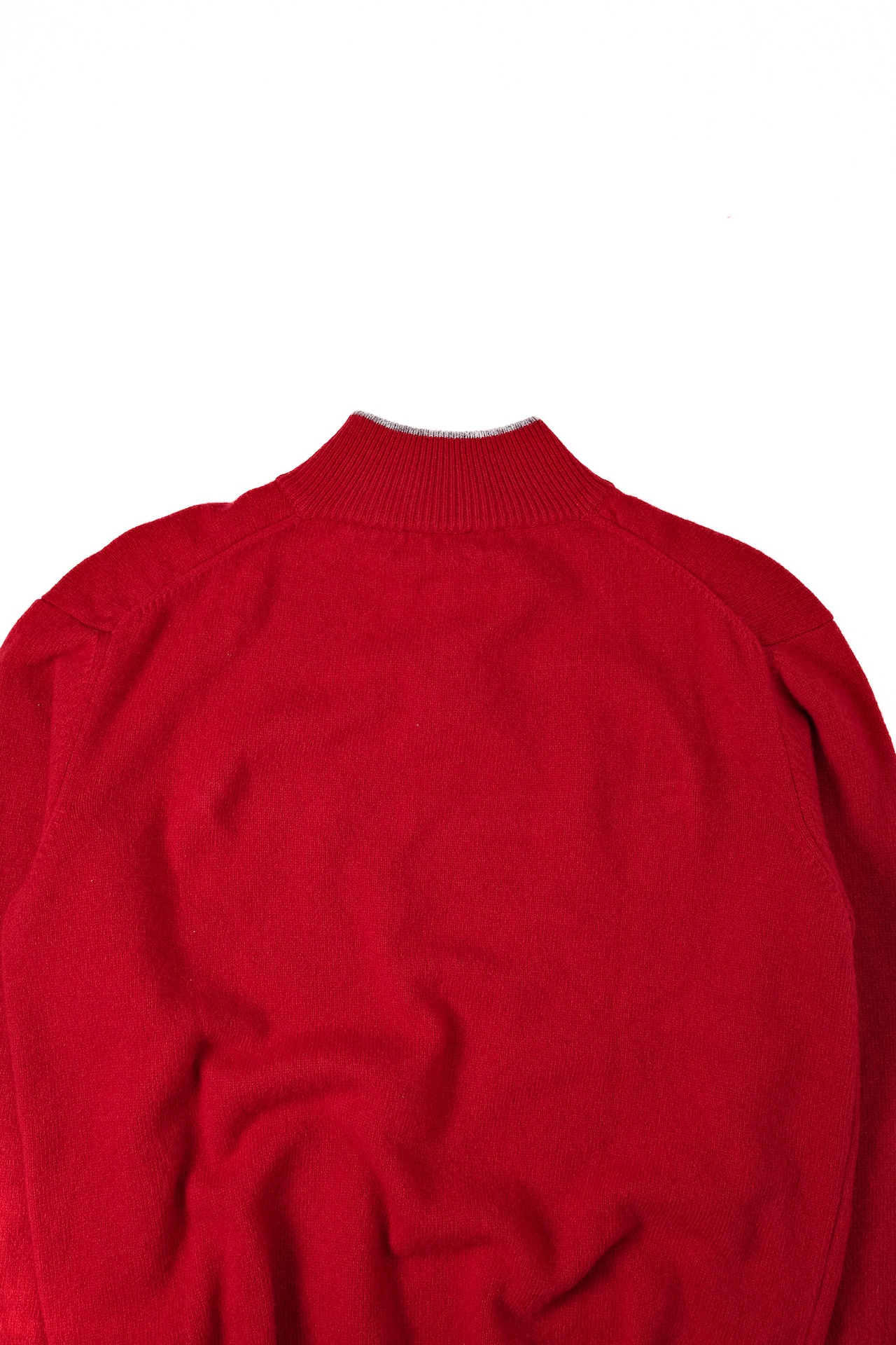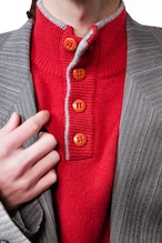 その襟元から、この濁りのない鮮やかな赤と、落ち着いたグレーのリブがふと顔を出す。