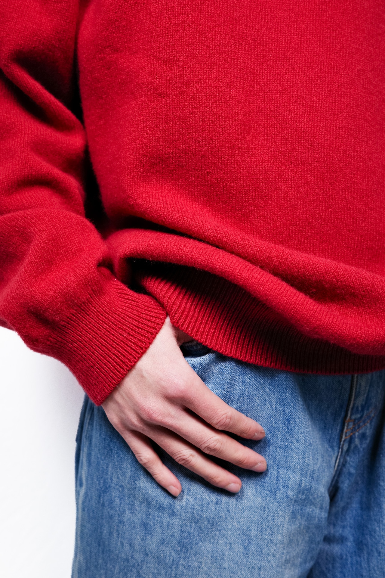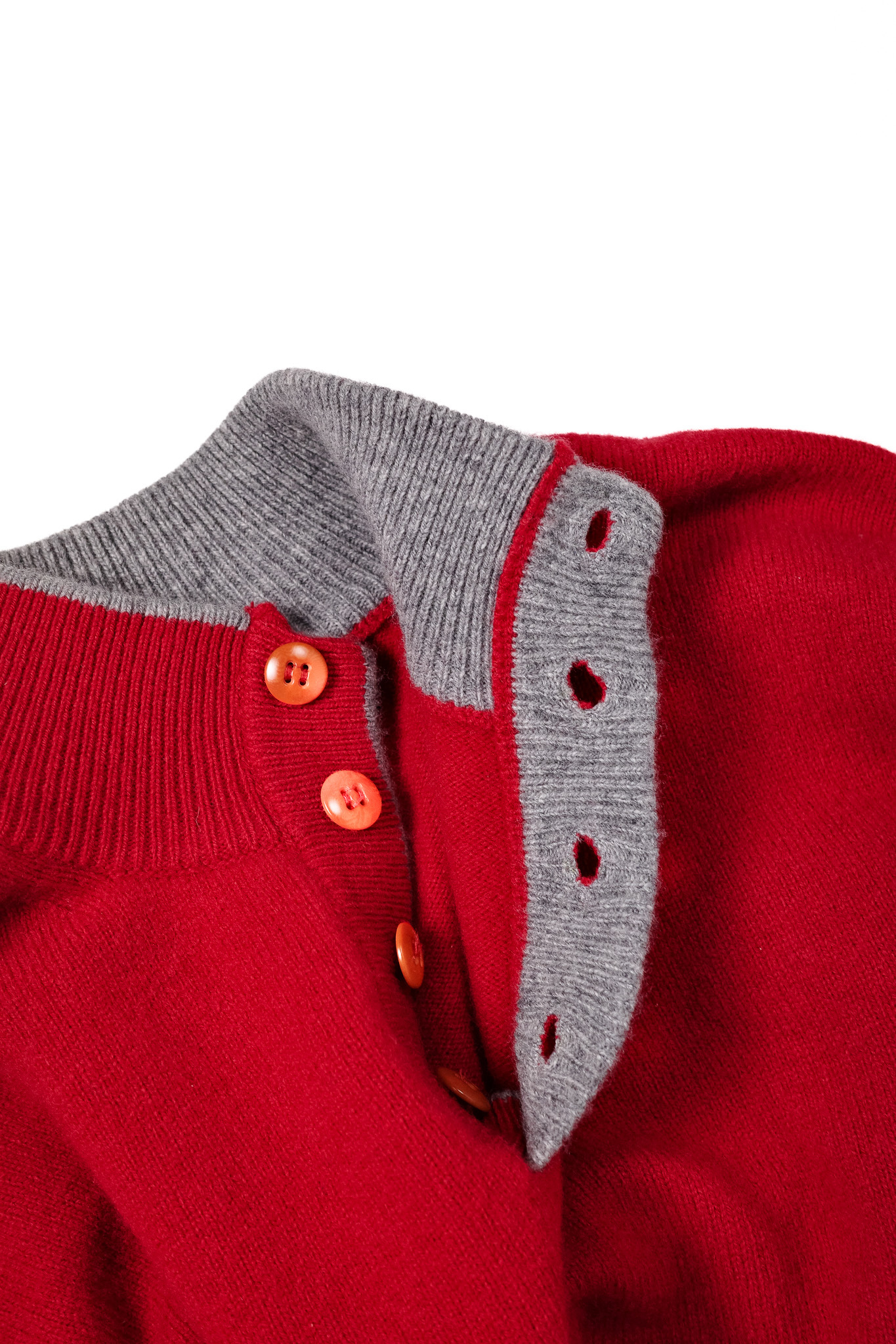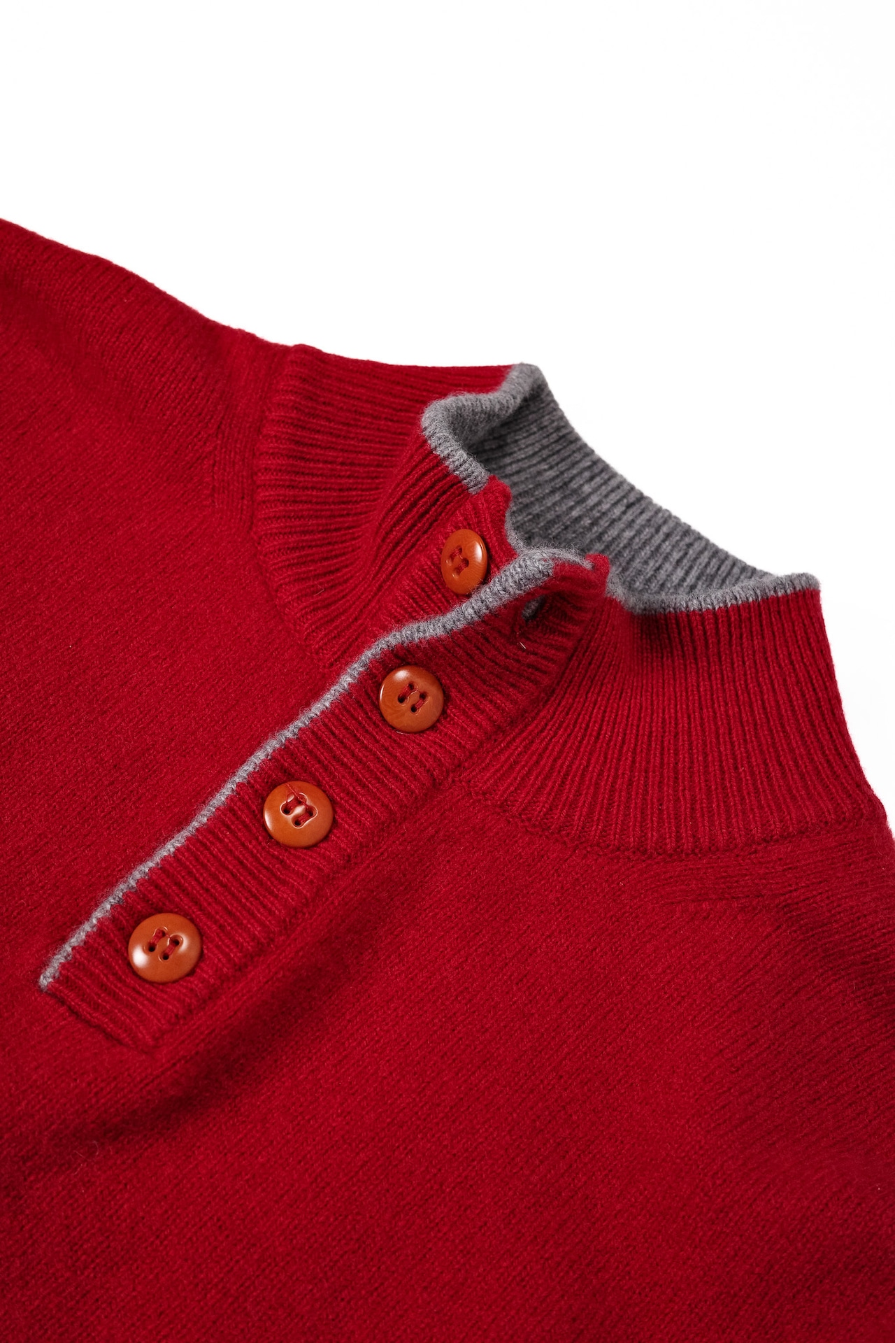 光の当たり方によって微妙な陰影を生むこの赤は、決して下品に浮くことがなく、隣り合うグレーのリブと美しく調和しています。