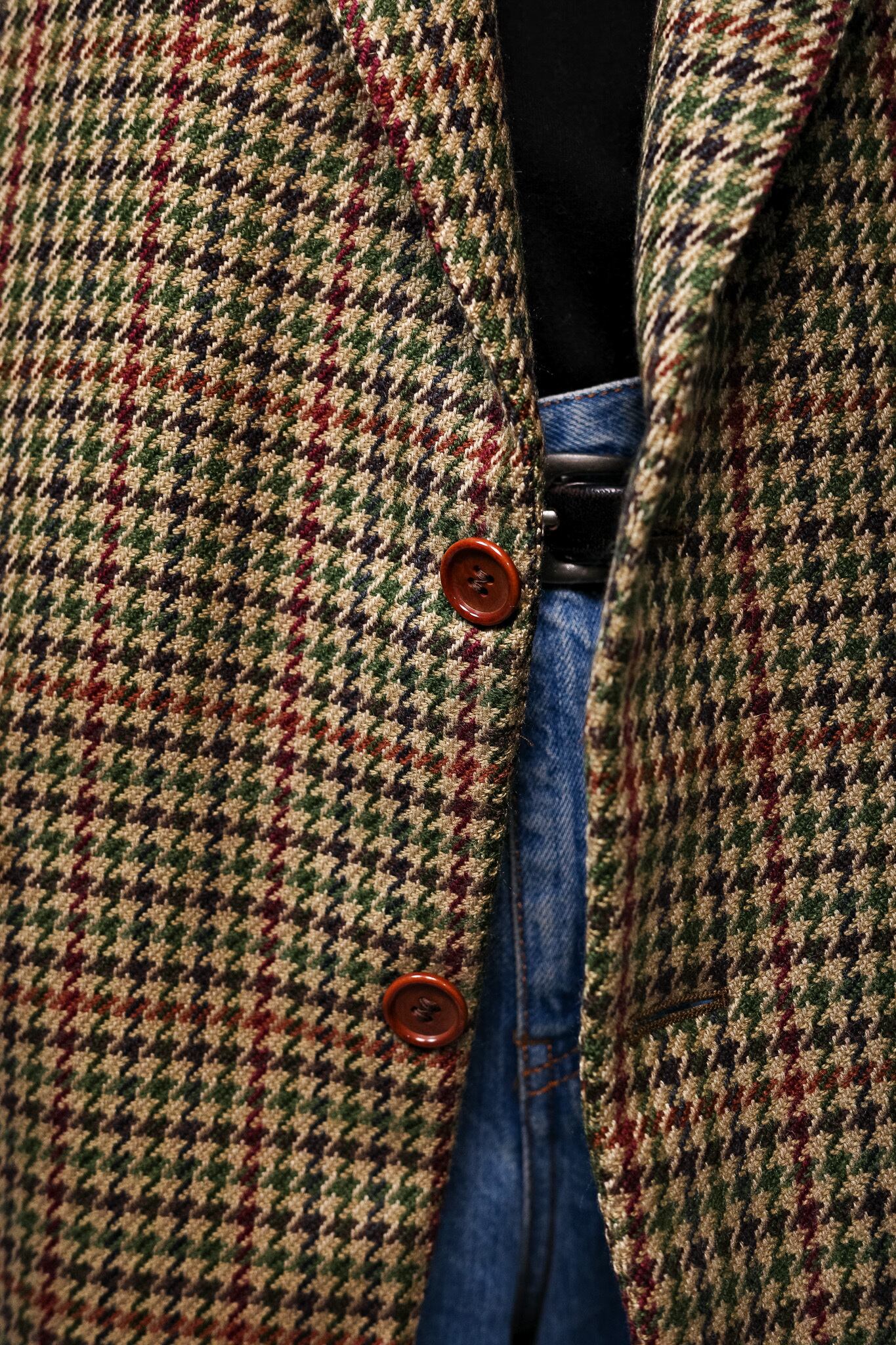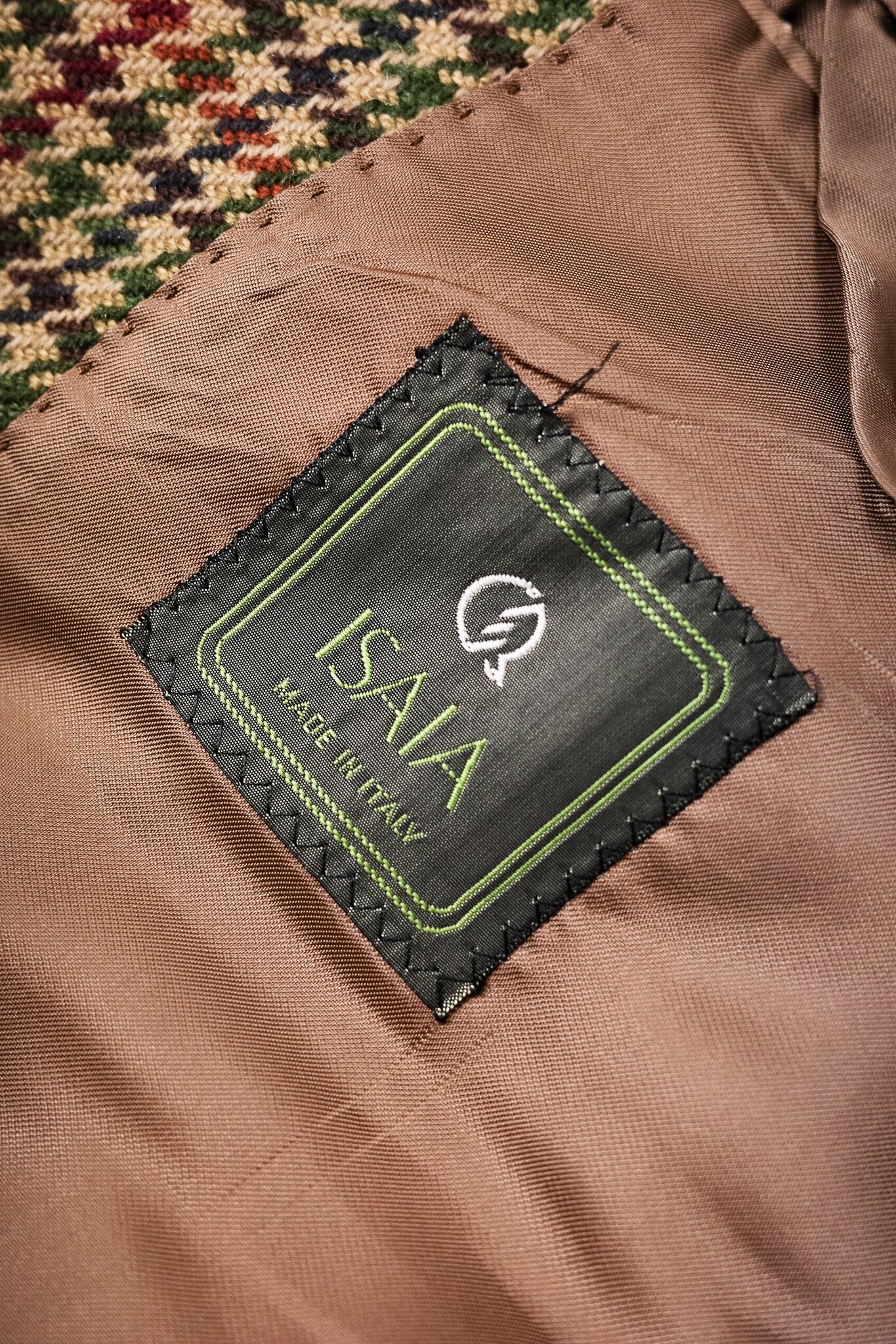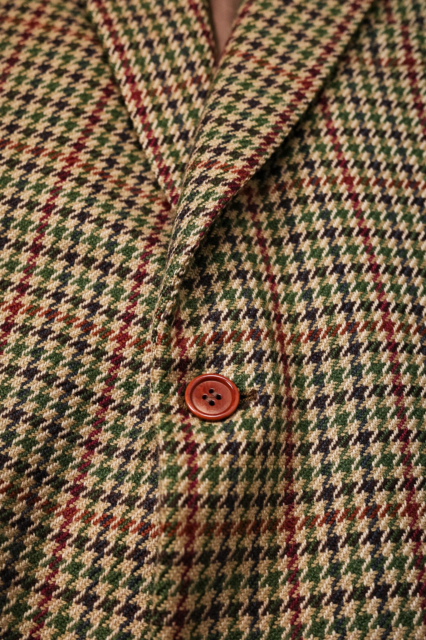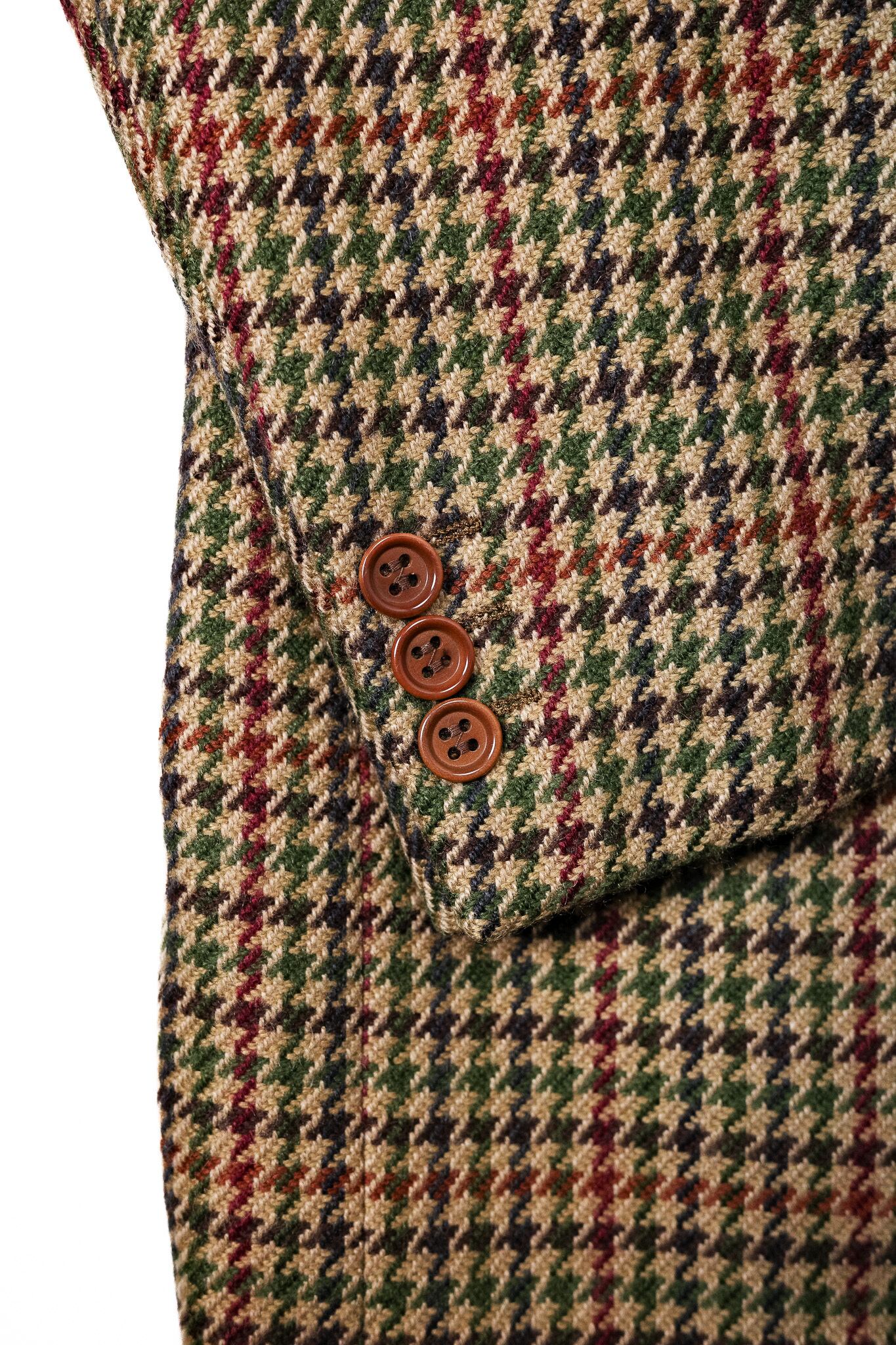 ベージュやオークルを基調としたガンクラブチェックをベースに、深いモスグリーン、そしてイザイアの、あるいはナポリの情熱を象徴するようなワインレッドが、幾重にも重なり合いながら交差しています。