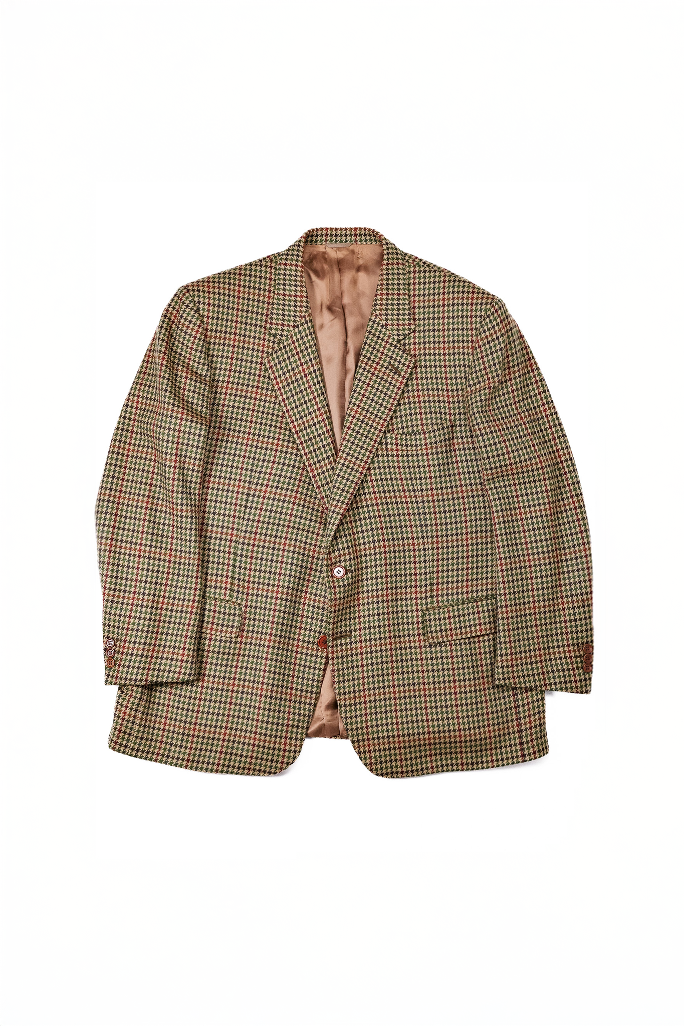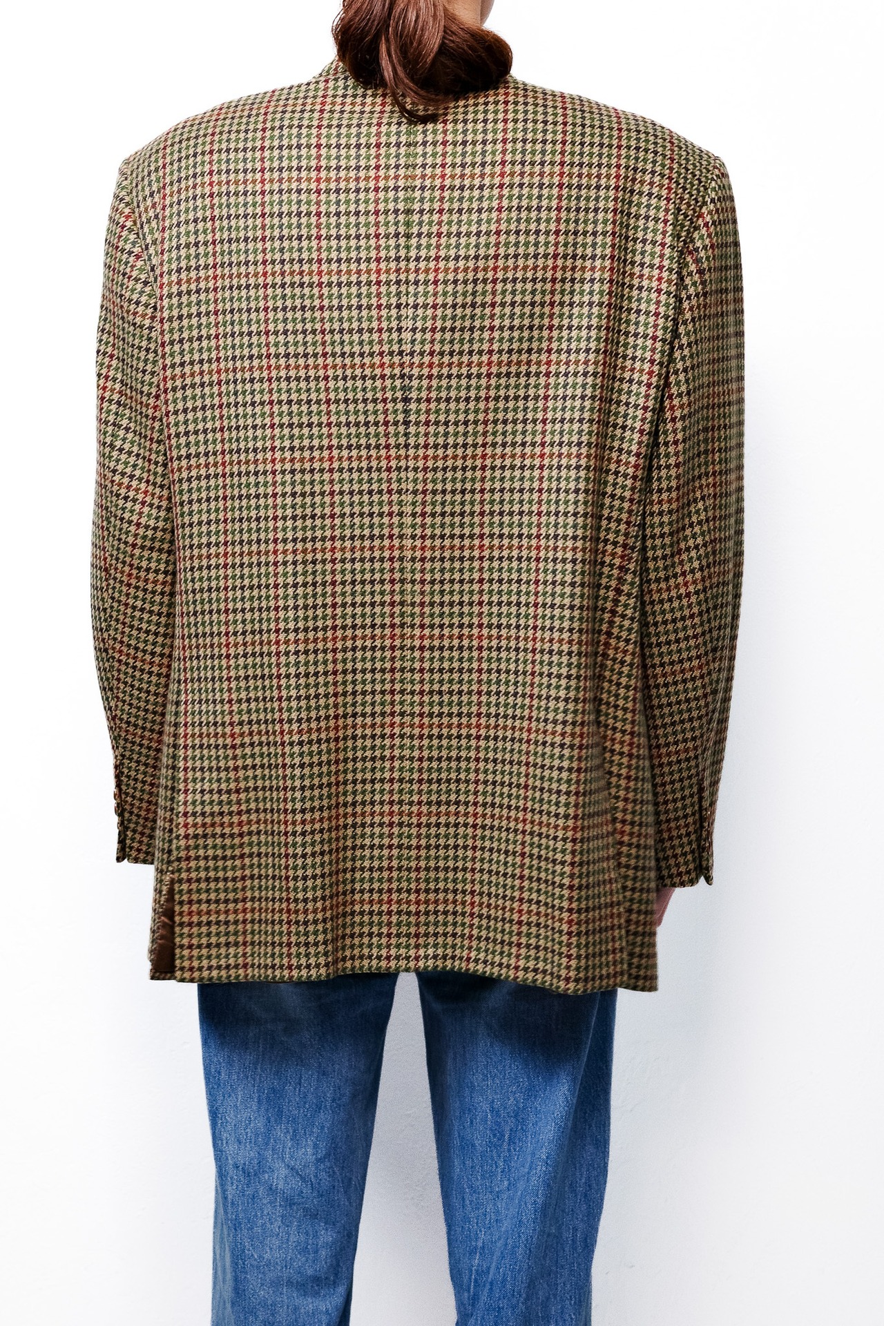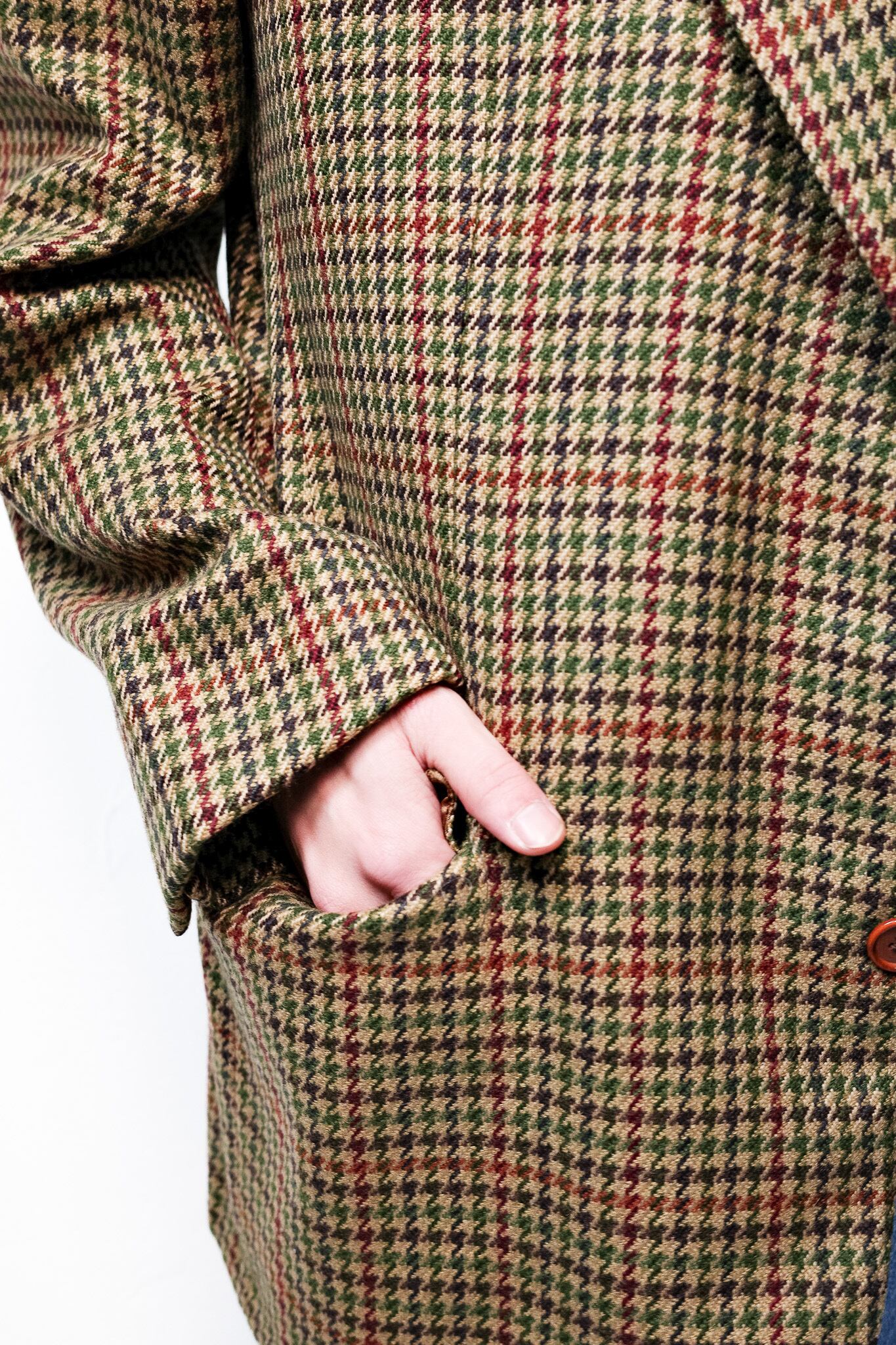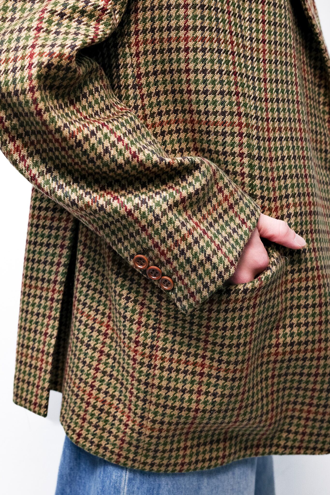 ベージュやオークルを基調としたガンクラブチェックをベースに、深いモスグリーン、そしてイザイアの、あるいはナポリの情熱を象徴するようなワインレッドが、幾重にも重なり合いながら交差しています。