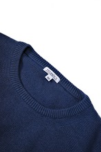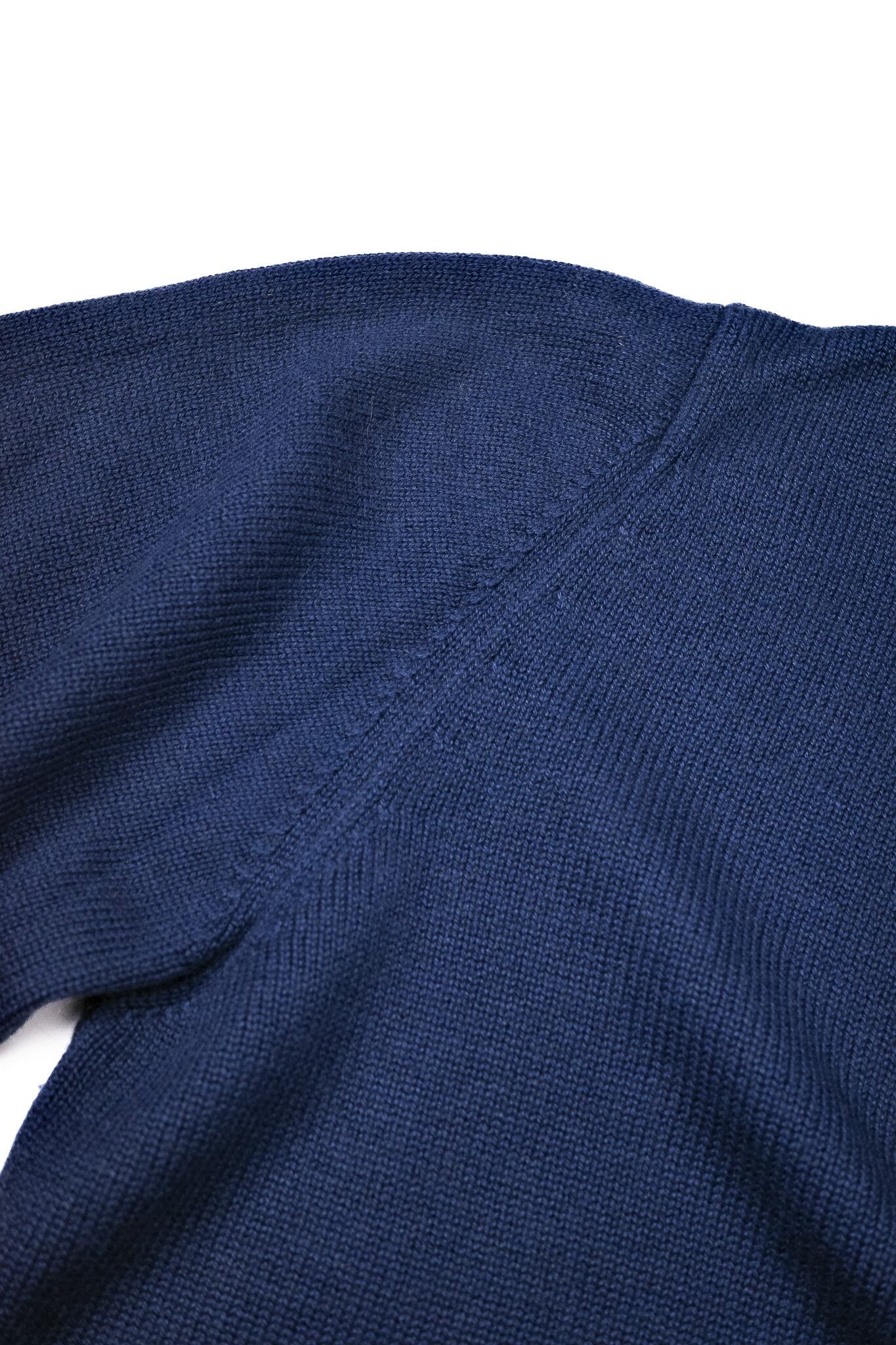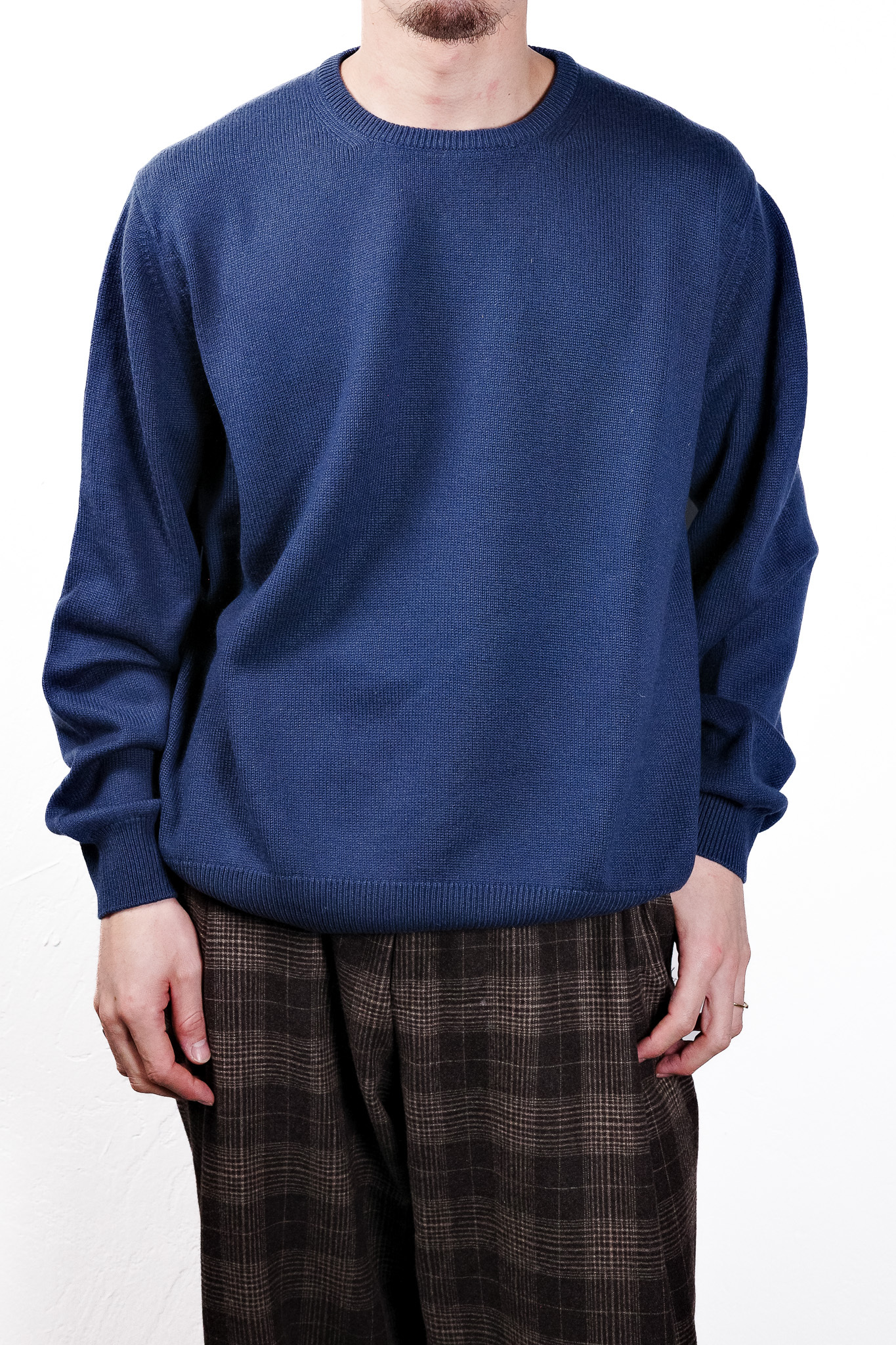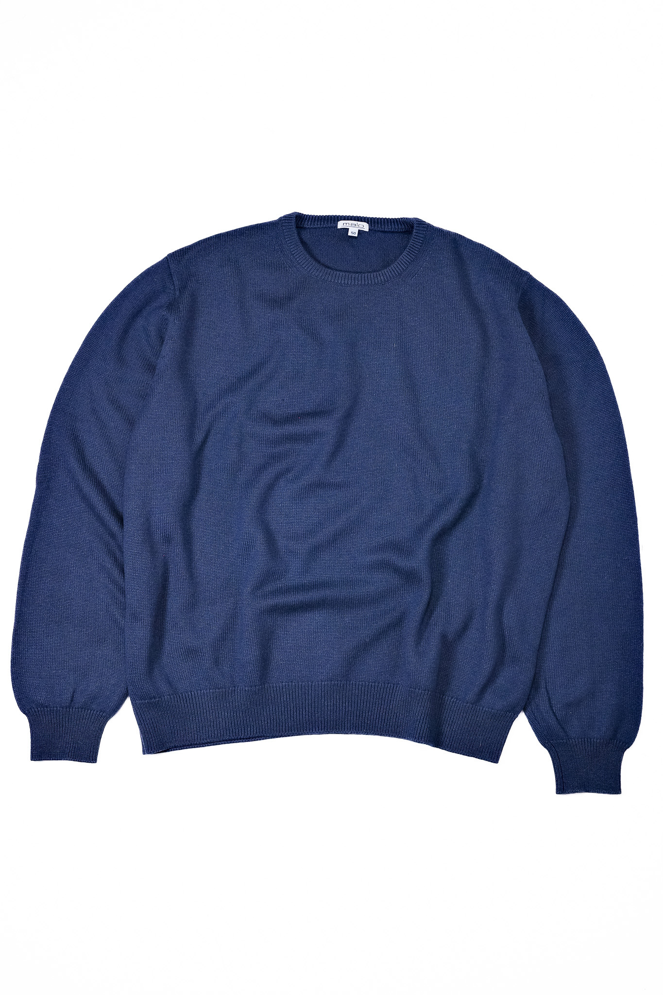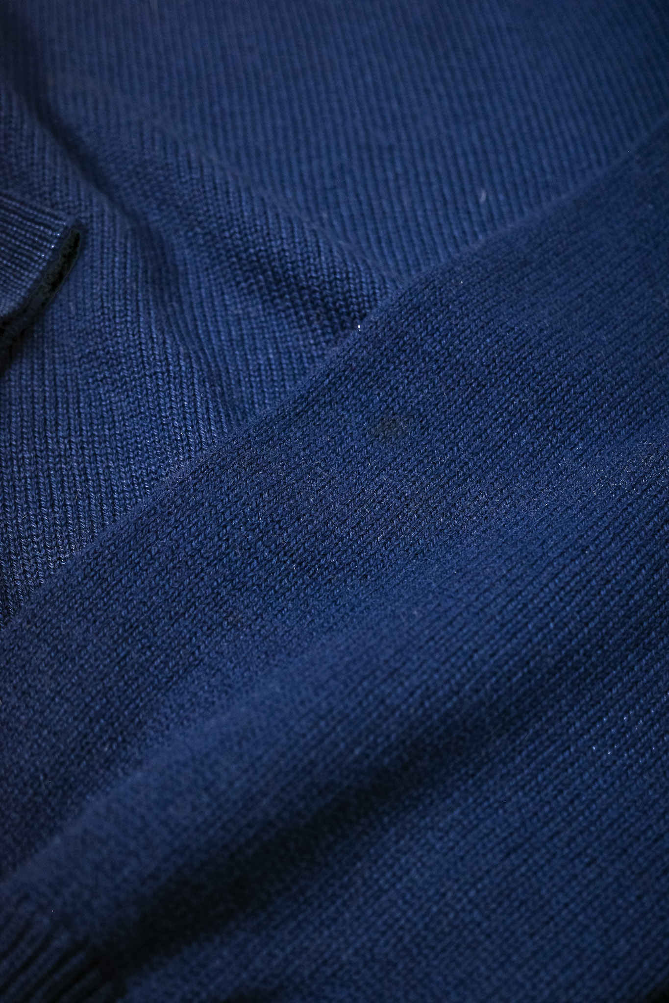 一深いネイビーを纏ったクルーネックニットは、一見するとシンプルでありながら、カシミア特有の美しい光沢が際立つ逸品です。