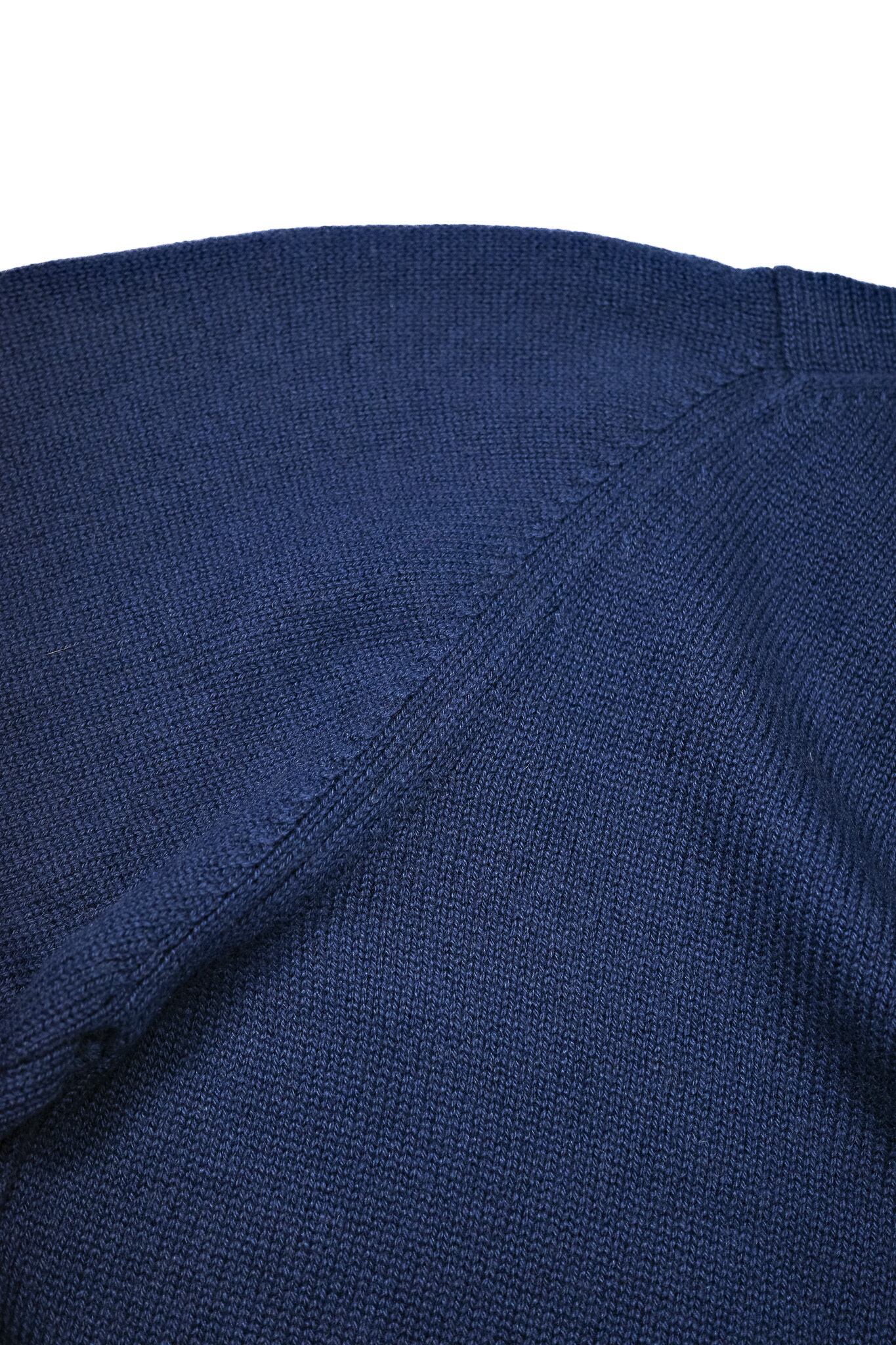 特筆すべきは両モデルに共通するラグランスリーブの設計であり、ネックラインから脇にかけて走る編み目の繋ぎ/リンキングを拡大して見れば、職人がひと針ずつ手作業で編み目を拾い上げていることが分かります。