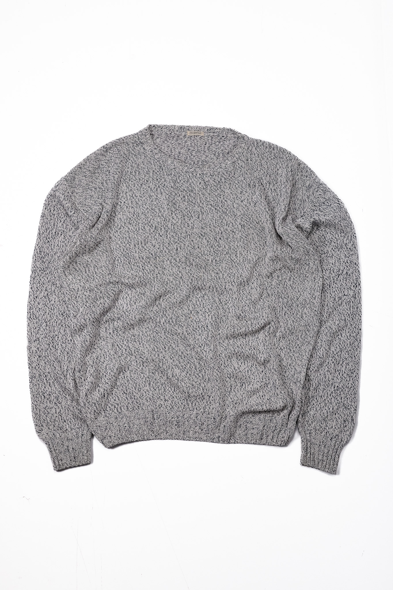 視覚的な深みをもたらしているのは、ホワイトとブラック、そしてネイビーが混ざり合ったかのような、極めて緻密なメランジ(杢)の色彩設計です。