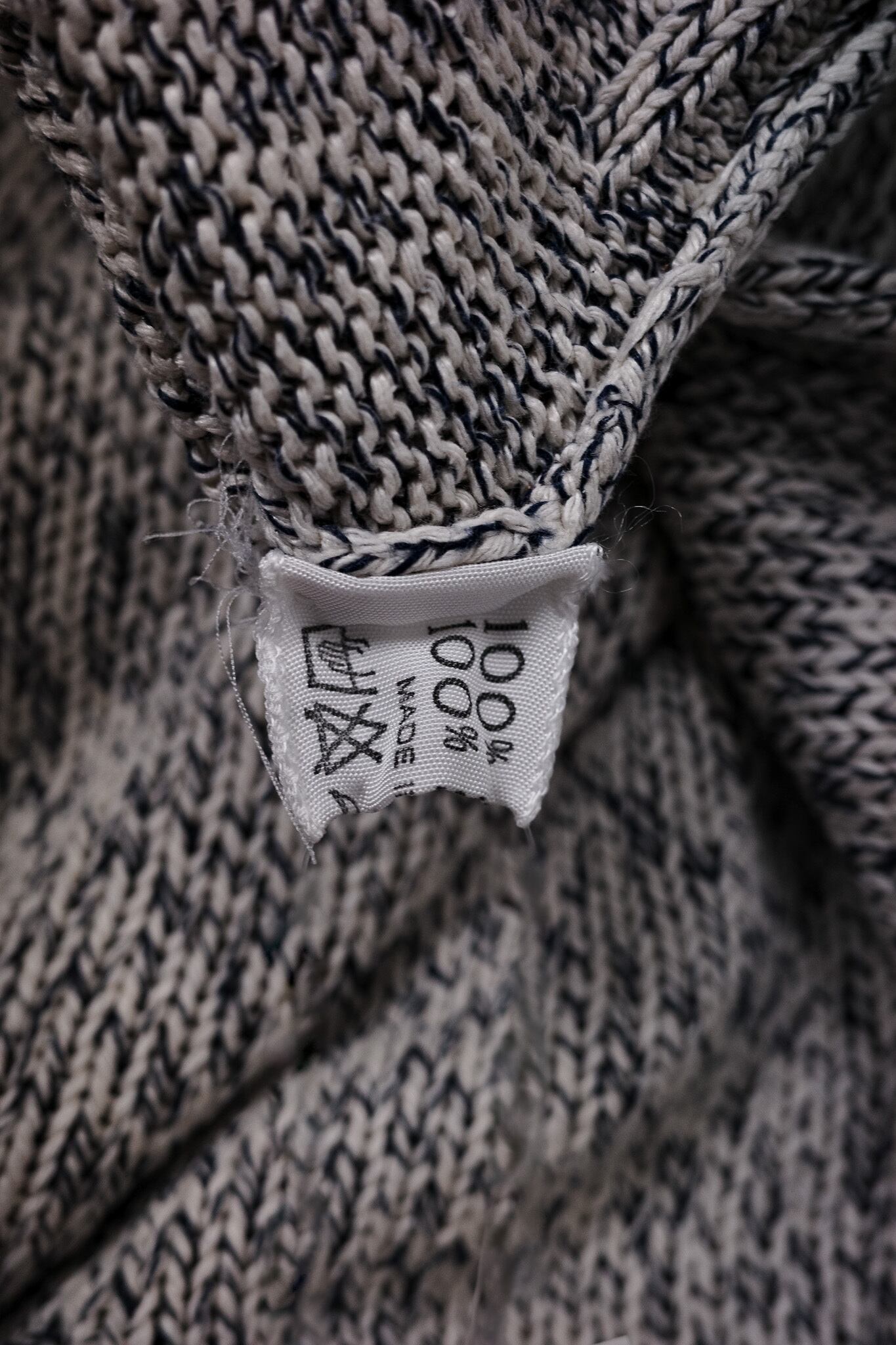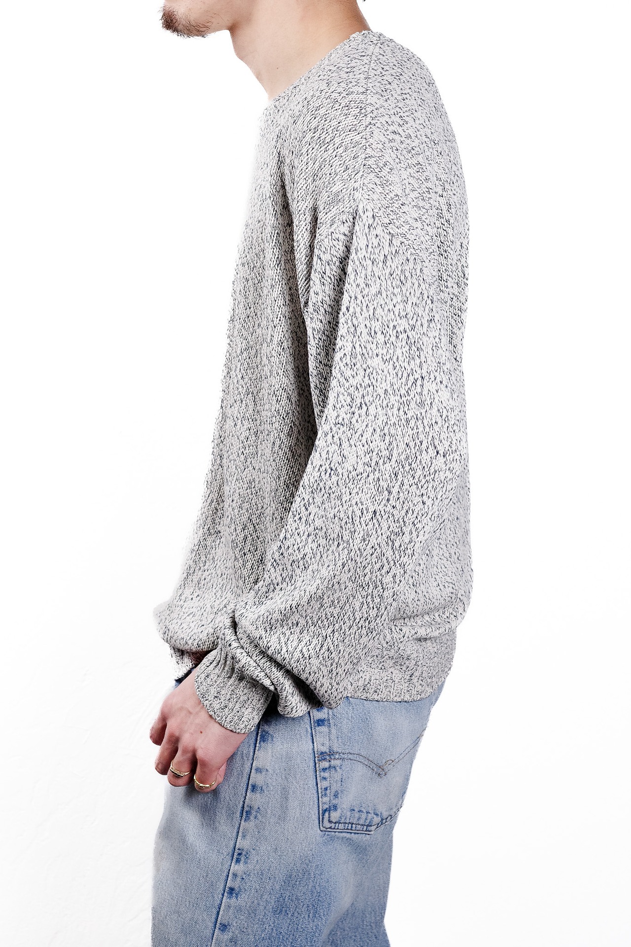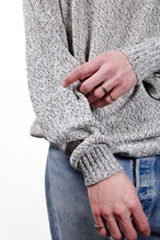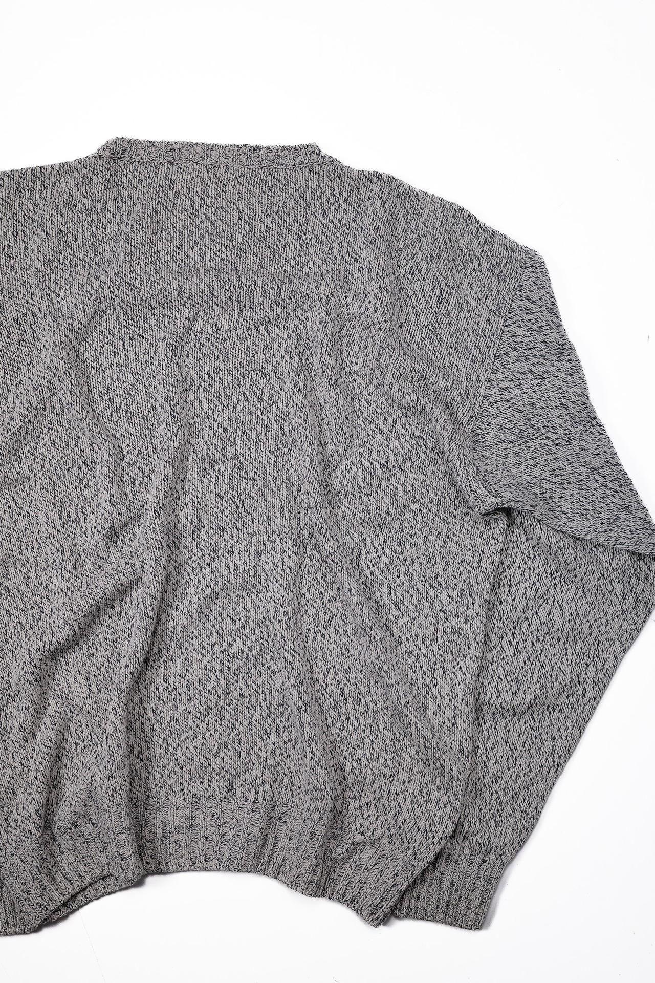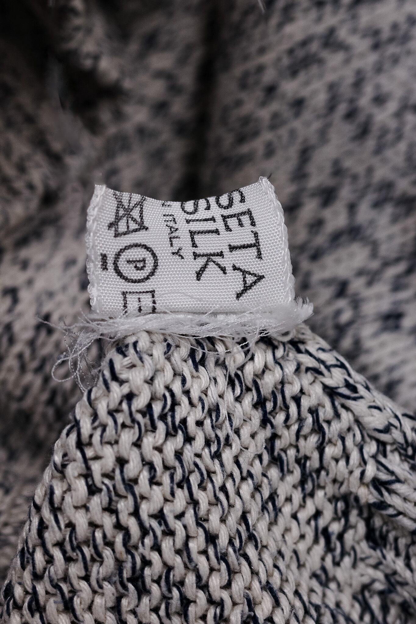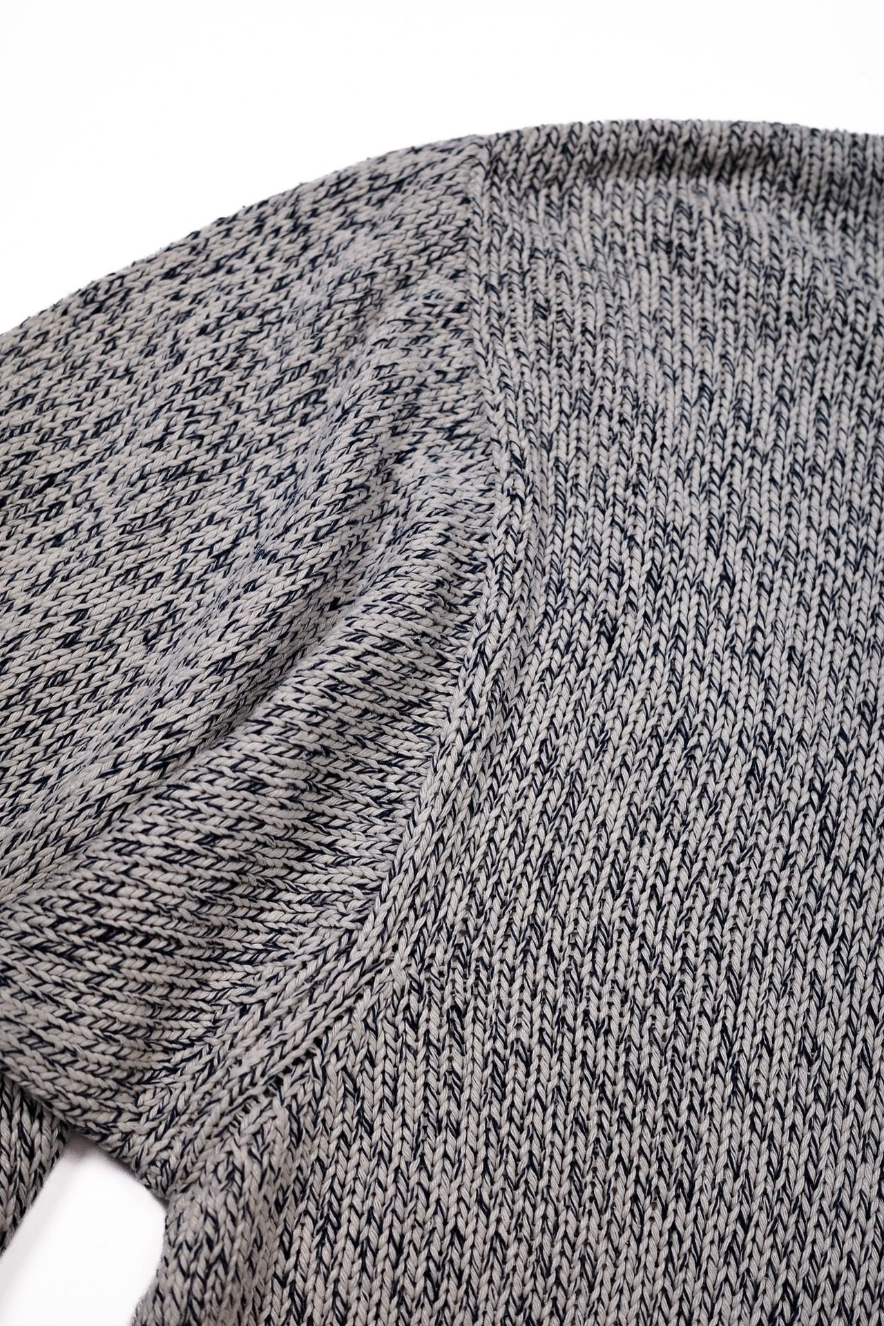 異なる色糸を絶妙な塩梅で撚り合わせることで、単色のグレーでは決して表現できない、光の加減によって刻々と変化する陰影を編み地の中に作り出しています。