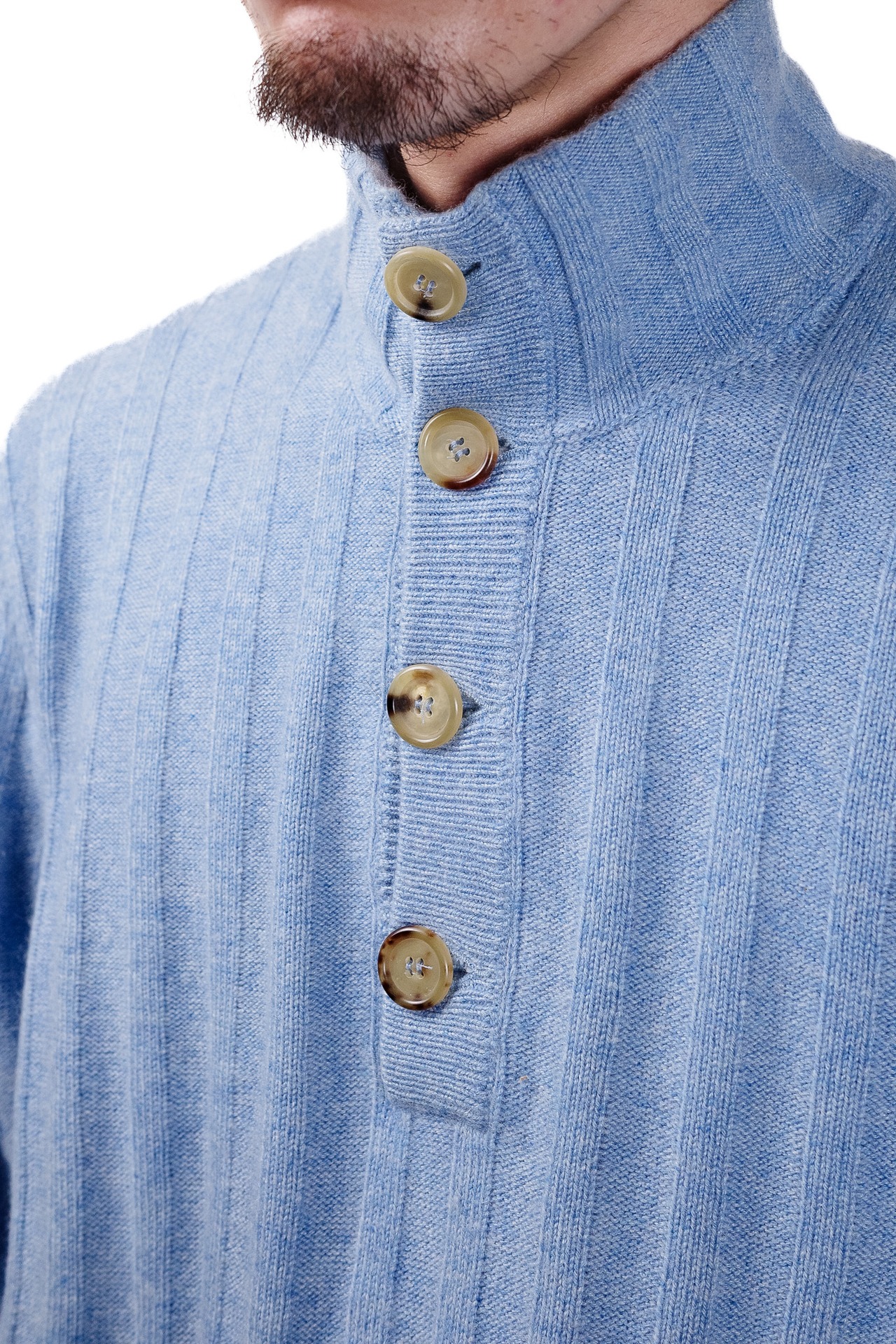 ジップなどの金属パーツを一切排除し、天然のボタンとカシミヤの編み目だけで構成された首周りは、驚くほど柔らかく、そして温かみのある印象を与えます。