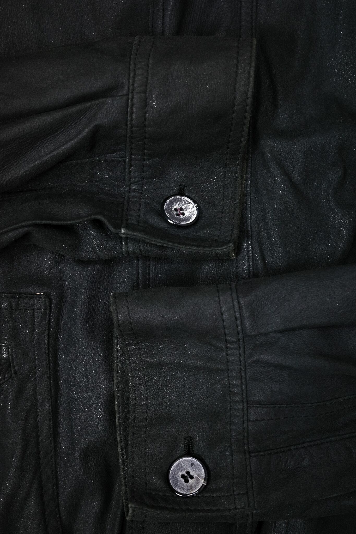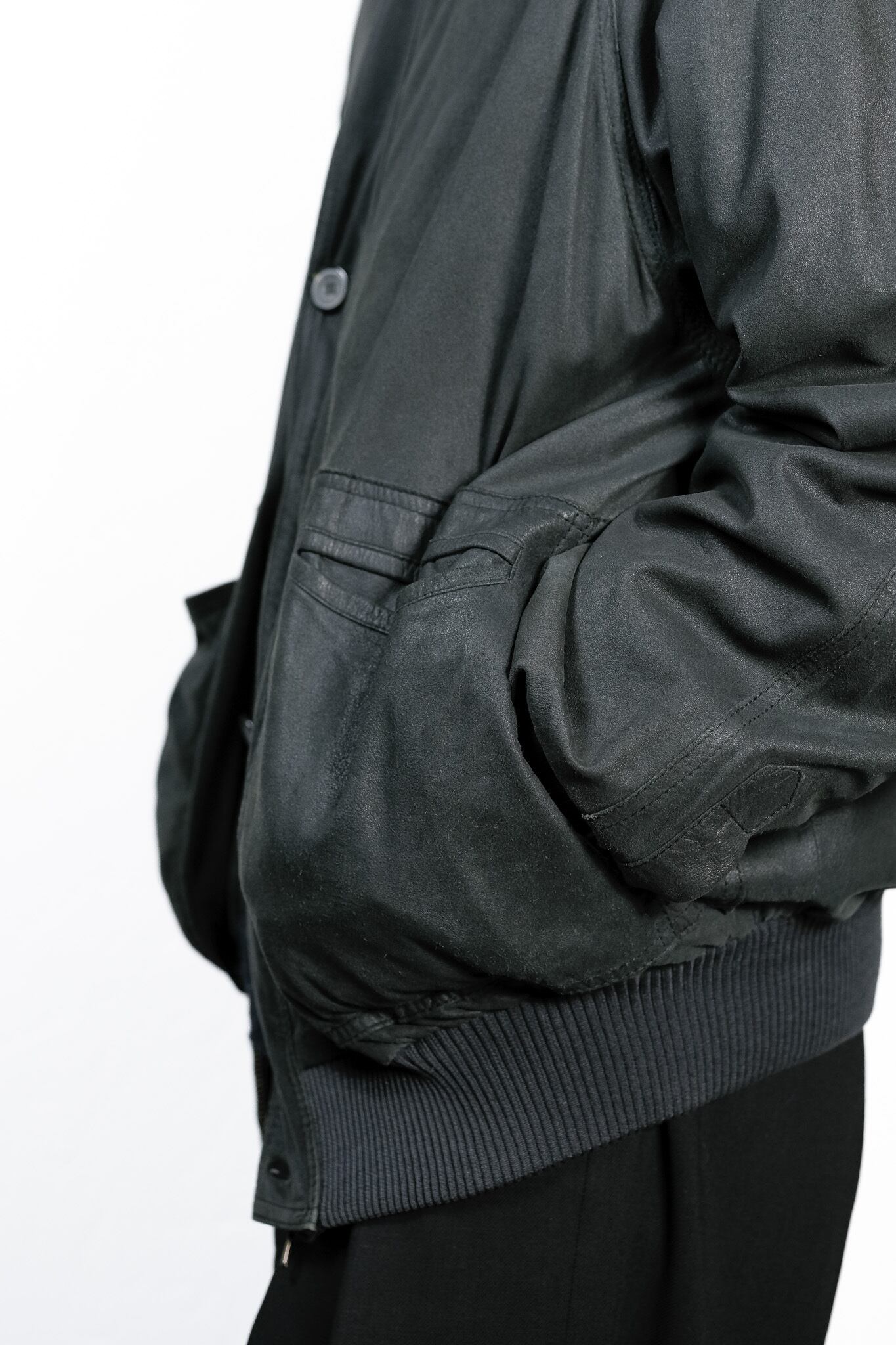 複数のプリーツが重なり合うように構築されたこのポケットは、単なる機能的な収納としての枠を超え、レザーという素材が持つ「表情」を最大限に引き出すための装飾的な装置として機能しています。