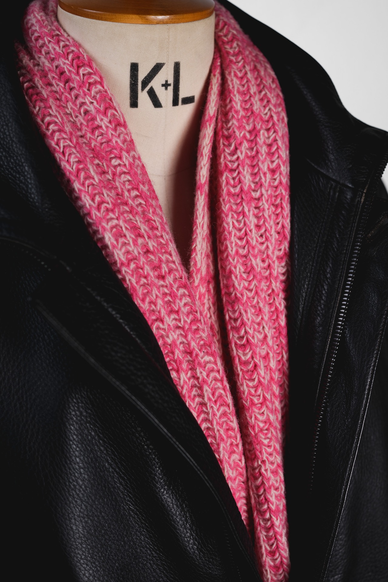 レザーの「硬」とニットの「軟」、そして黒の「沈」とピンクの「浮」。