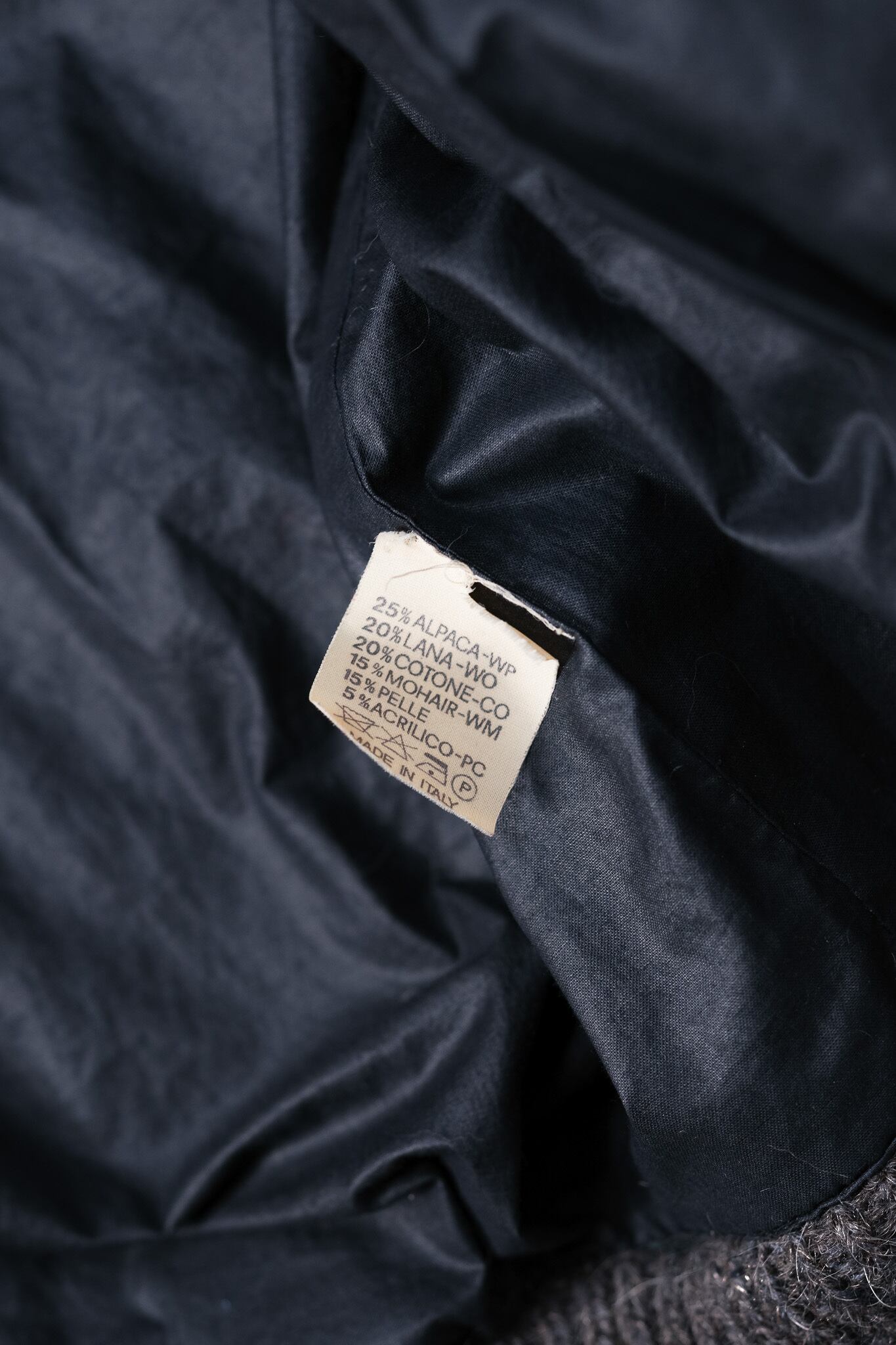 ケアラベルに記された通り、アルパカ25%、モヘア15%、そして羊毛20%という、現代の既製服ではまず考えられないほど高比率で高級獣毛がブレンドされています。
