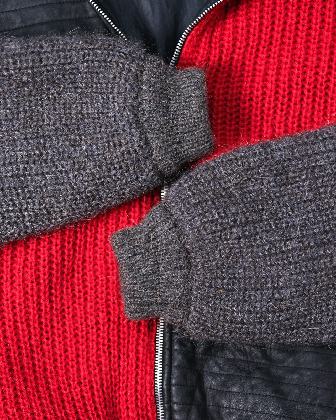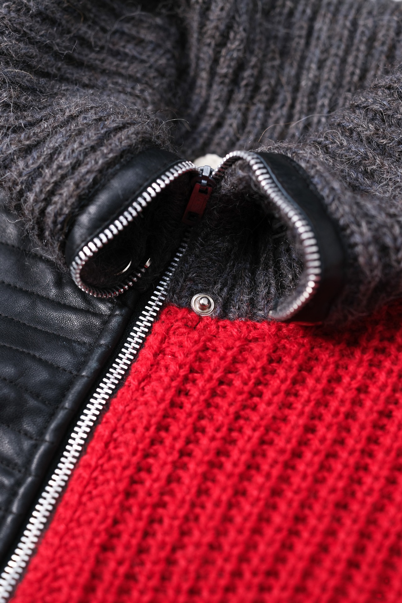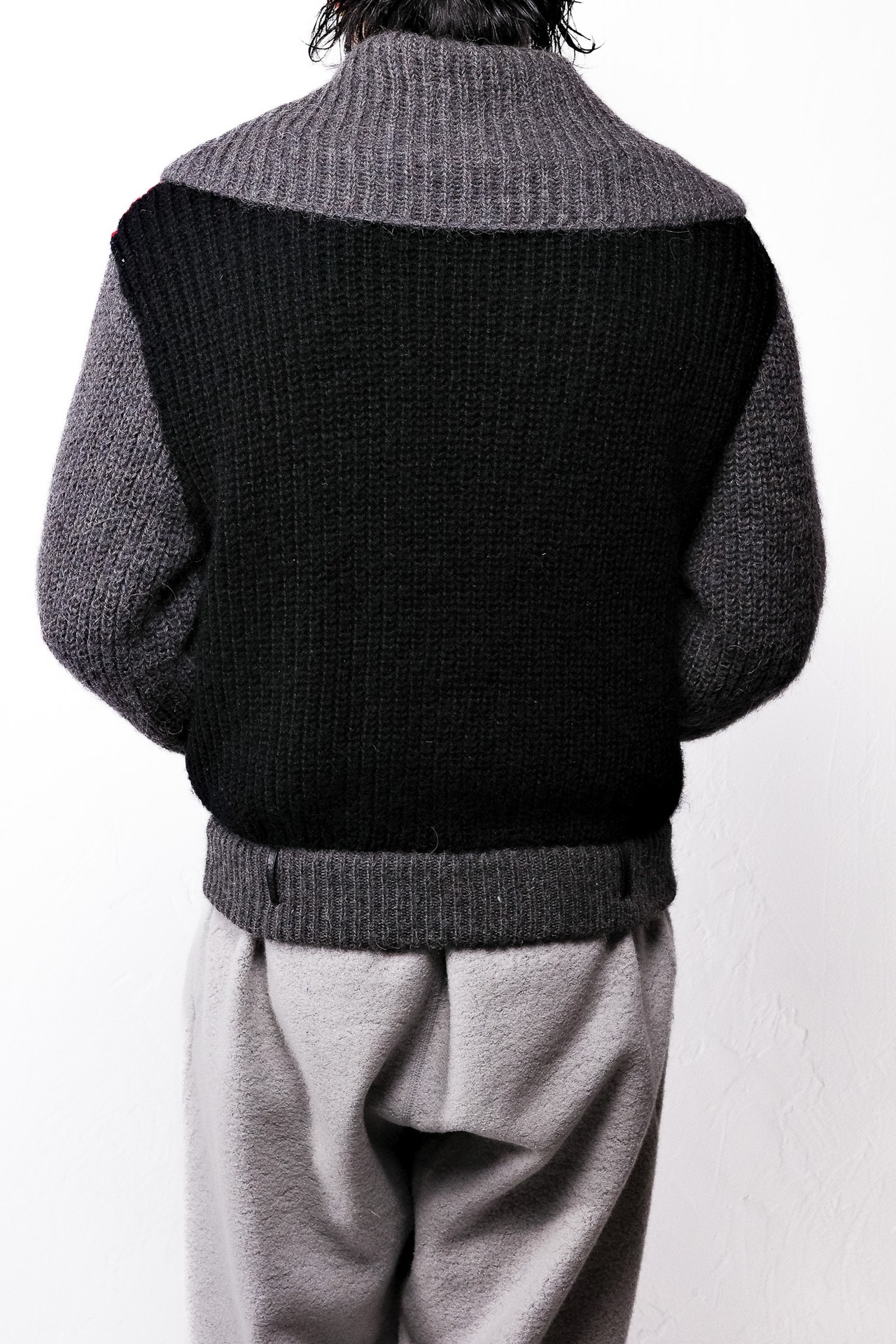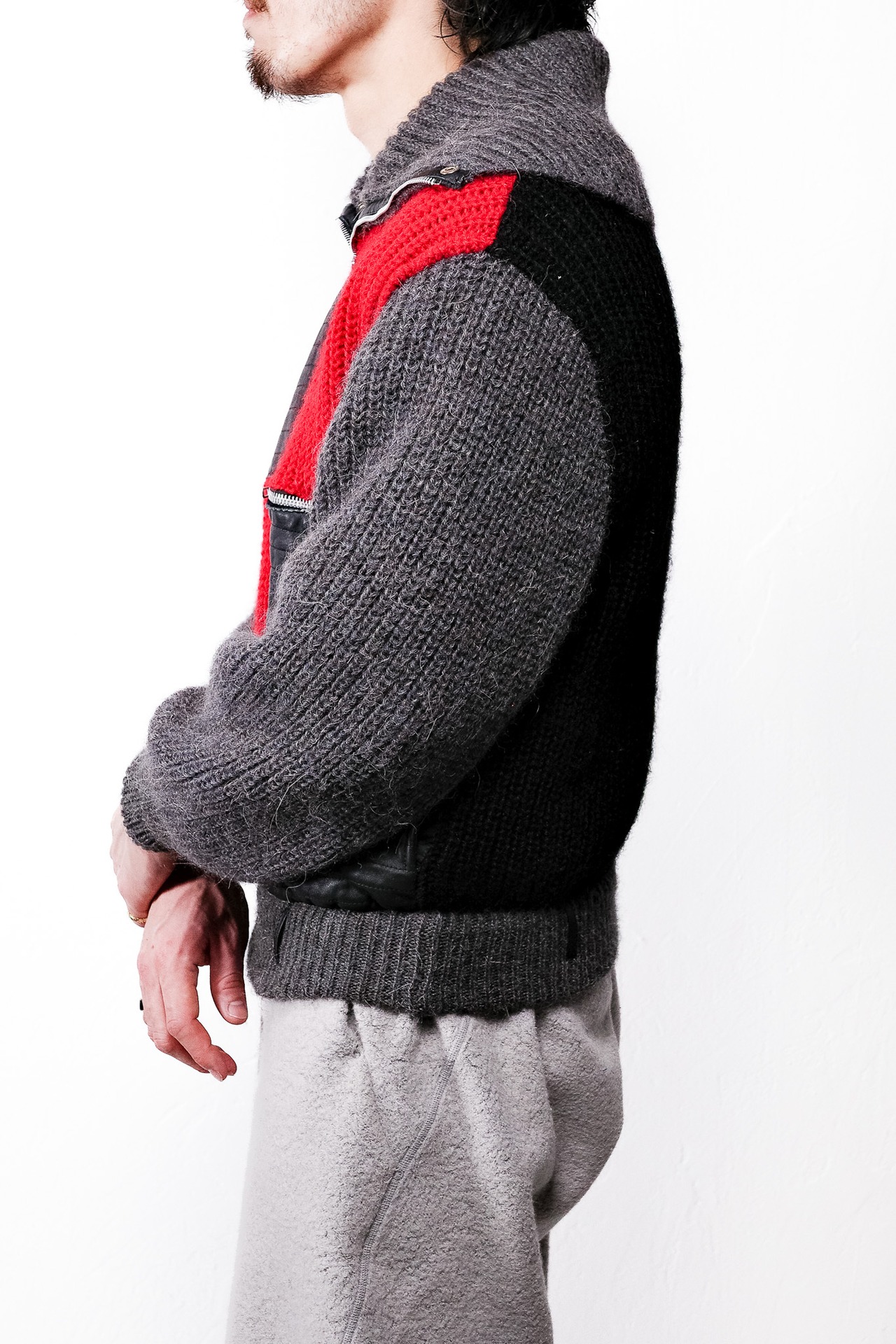 袖や背面、そしてフロントの赤いパネル部分に使用されているこのニットは、アルパカとモヘア特有の長い毛足が表面に浮き出ており、空気をたっぷりと孕むことで生まれる奥行きのある質感が、視覚的にも豊かな温かみを感じさせます。