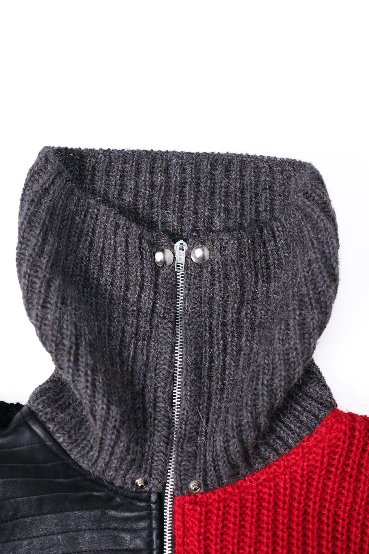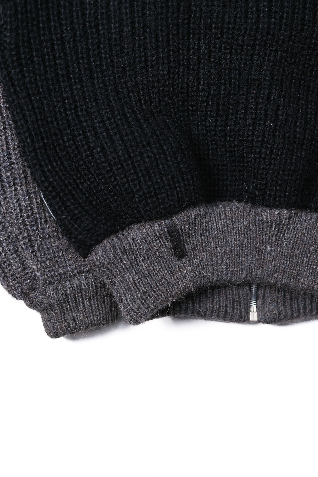 襟元はボリュームのあるリブニットで仕立てられており、フルジップで閉めることで顎下までをしっかりと包み込む、構築的なシルエットを形作ります。