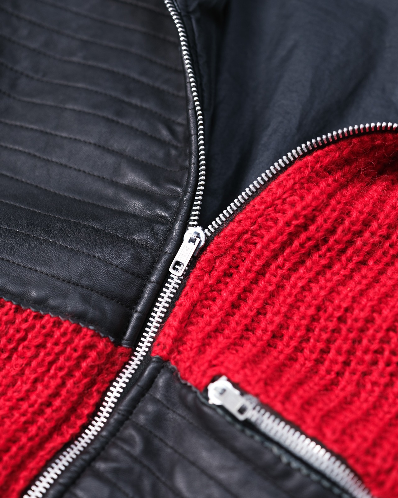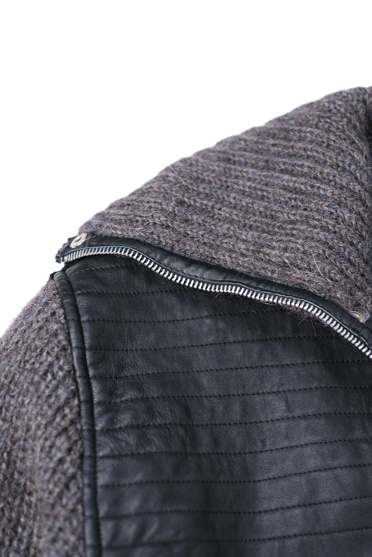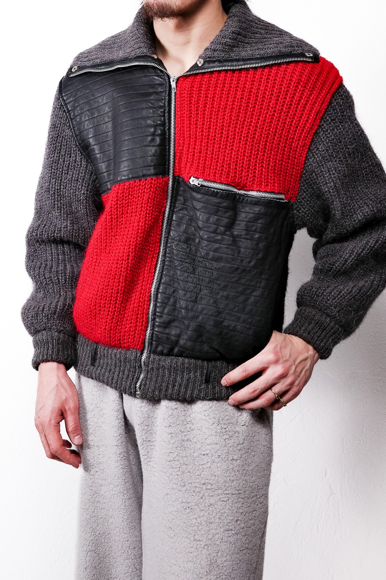 ニットの「柔らかさ」とレザーの「硬質さ」、この二つの相反する質感をぶつけることで、一着の中に緊張感のあるリズムが生まれています。