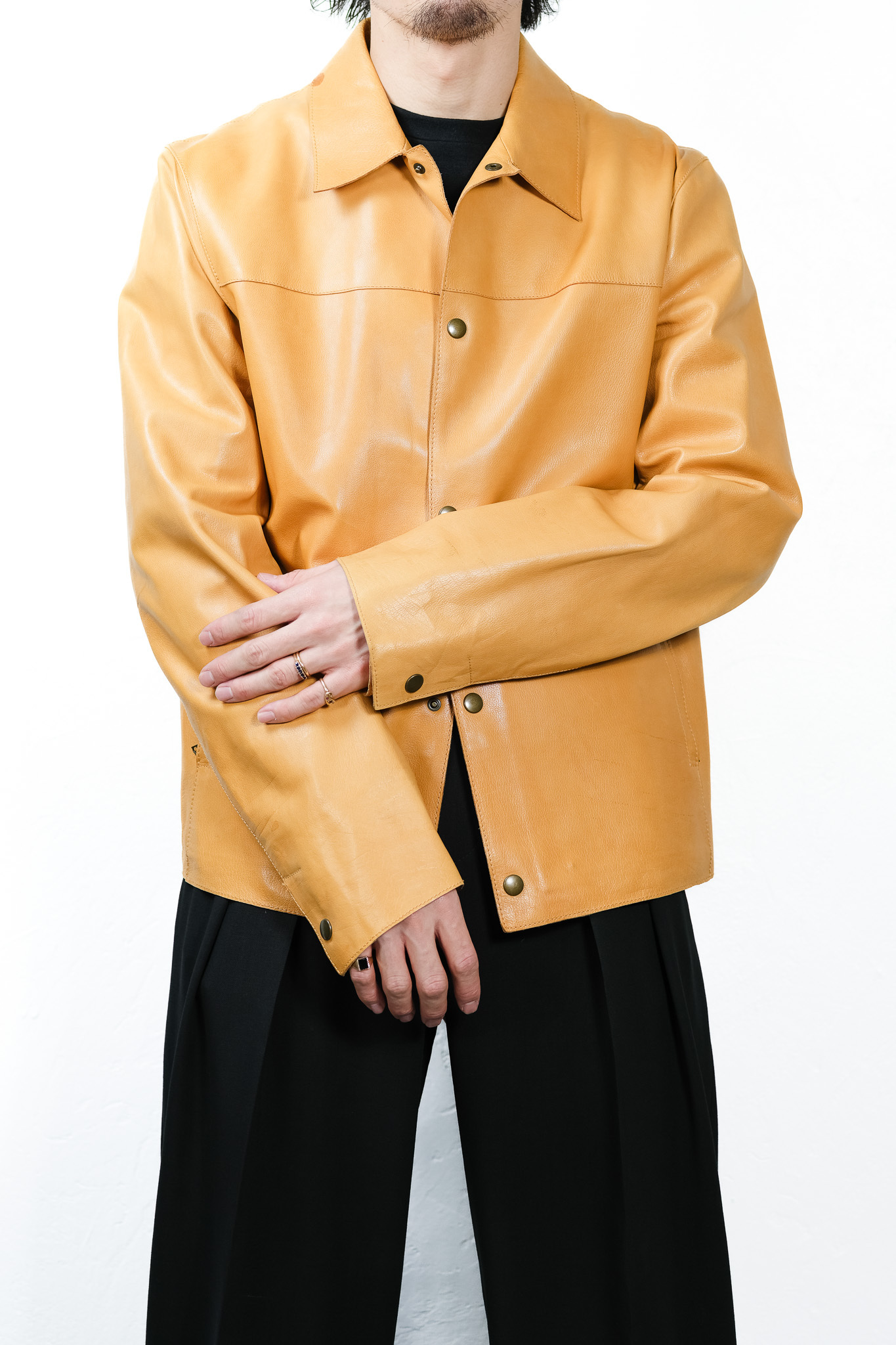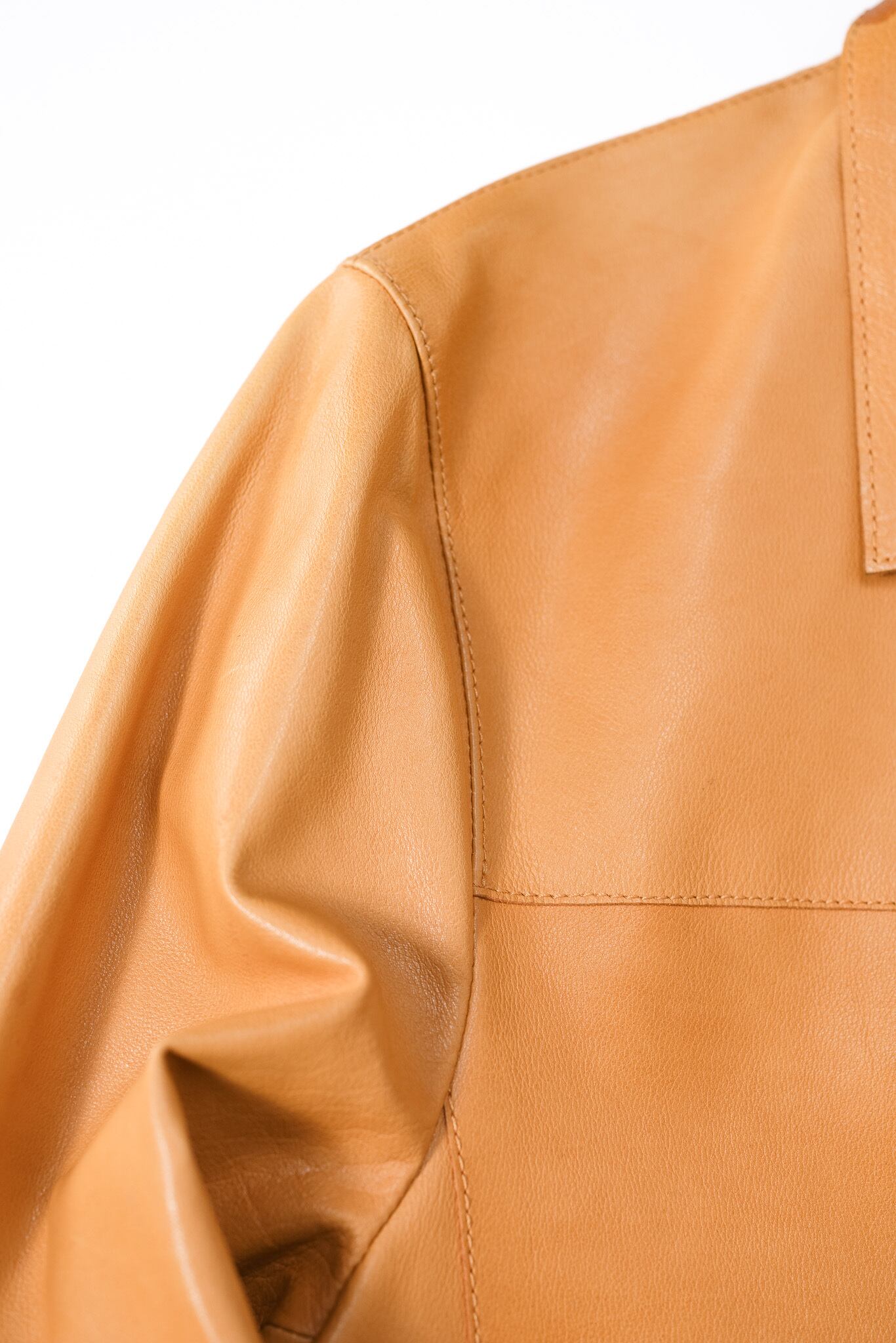 サイズ表記は50ですが、一枚革のしなやかさによって身体に吸い付くように馴染み、現代的なオーバーサイジングとも、往年のタイトなトレンドとも異なる、普遍的な「美しく頼りない」シルエットを描き出します。