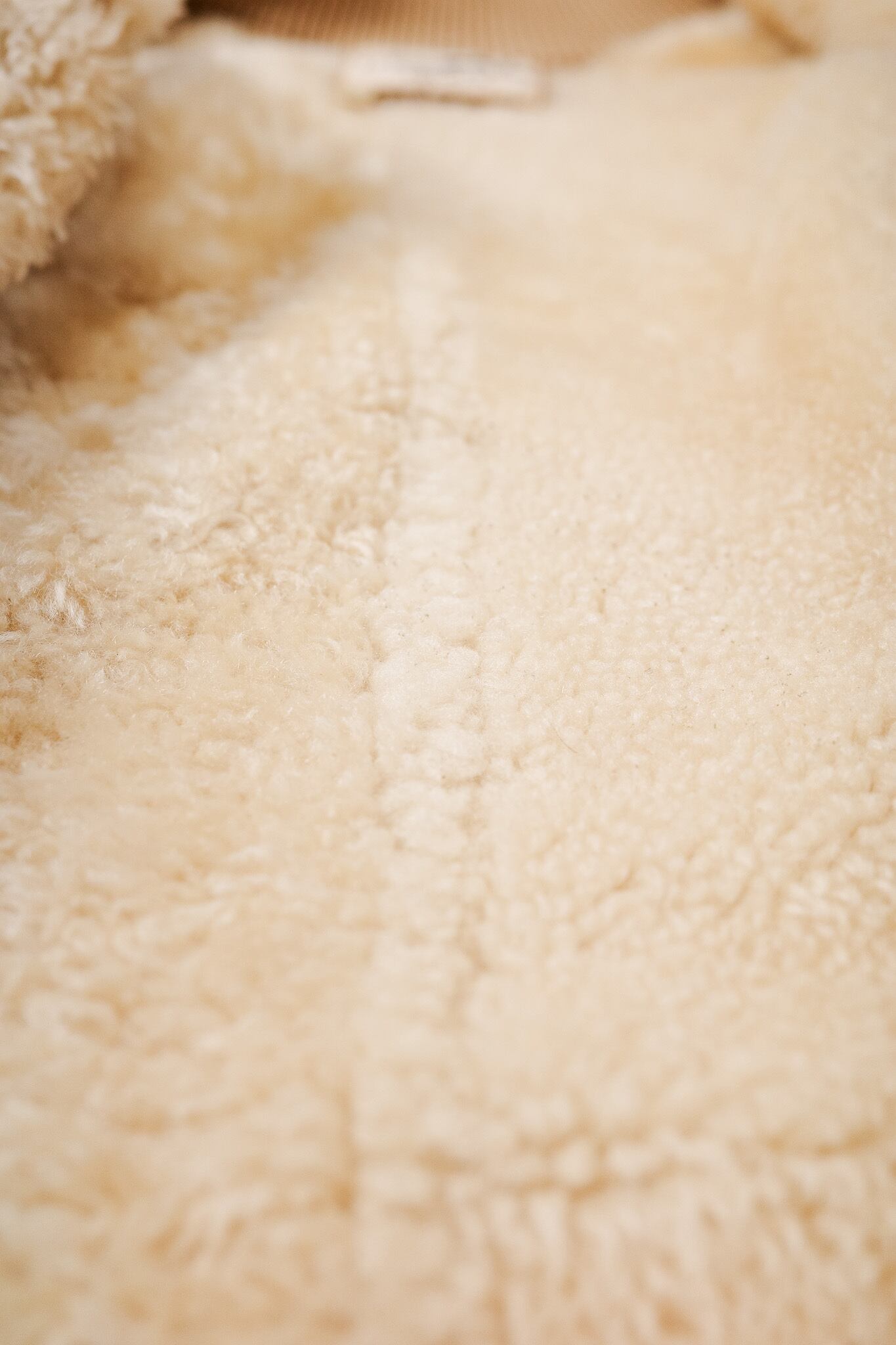 肩のラインはラグランスリーブを採用しており、肉厚なムートンがもたらす運動の制約を最小限に抑えつつ、肩から袖にかけての美しいドレープを実現。