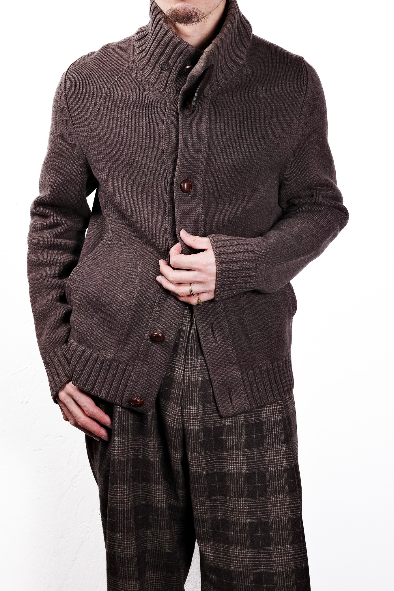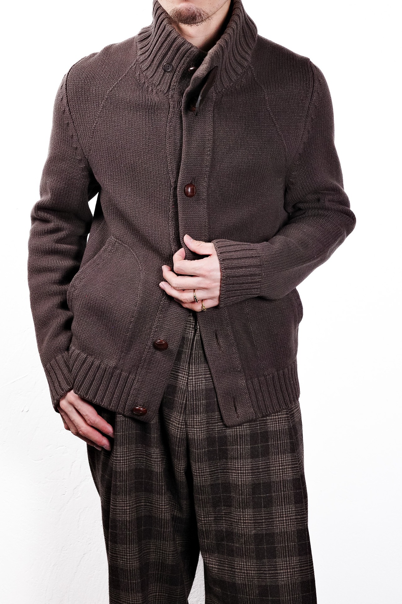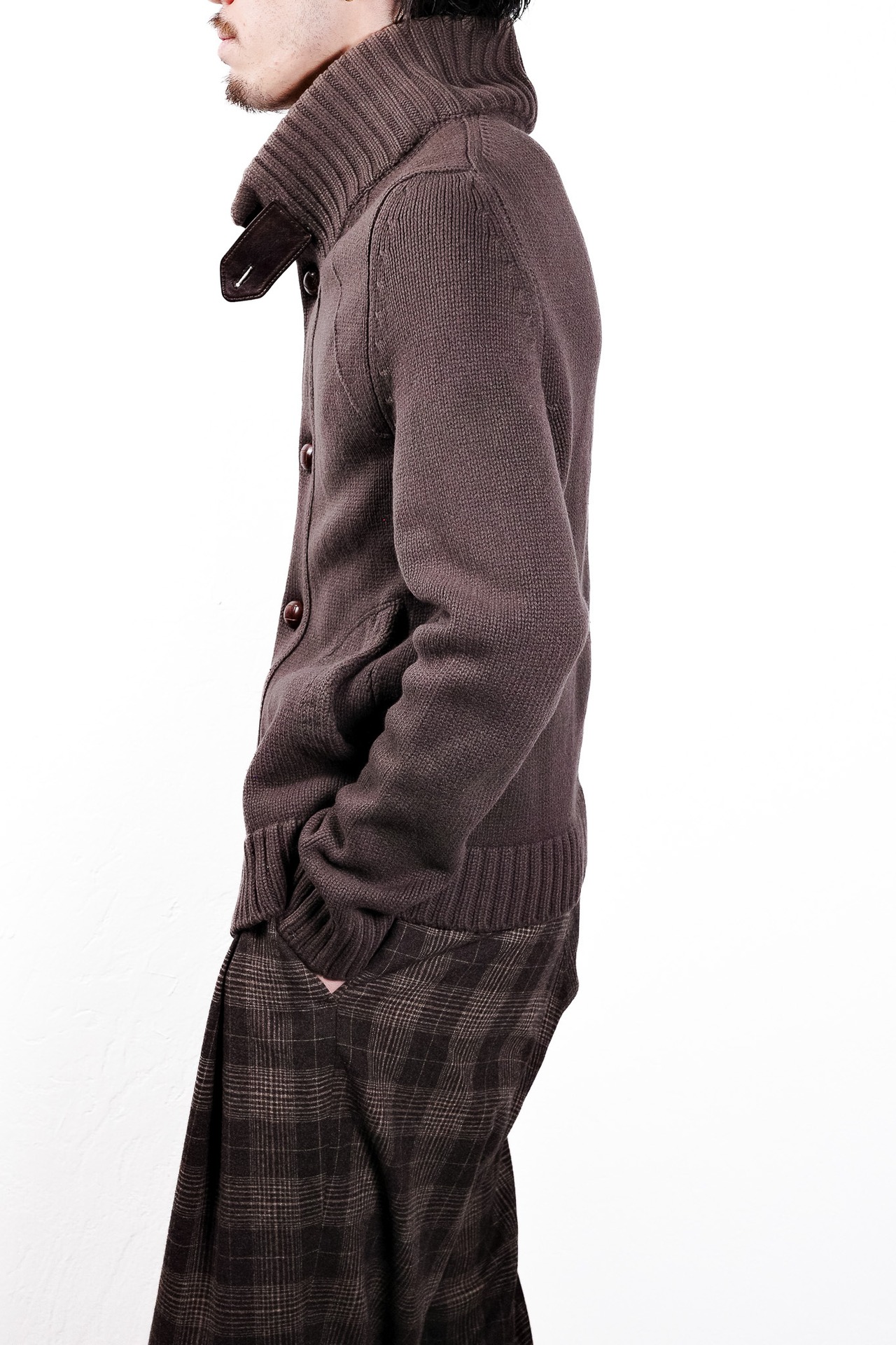 ストラップを解放して襟を寝かせれば、リラックスした雰囲気を漂わせる上質なカーディガンのように振る舞い、一方でストラップを留めて襟を立ち上げれば、首元を完全に覆い隠すスタンドカラー・ジャケットへと表情を一変させます。