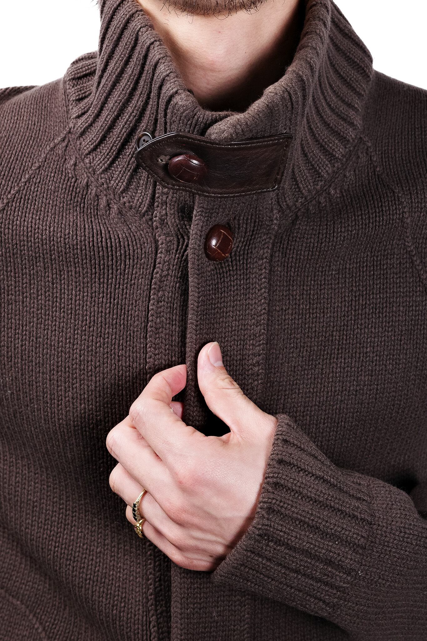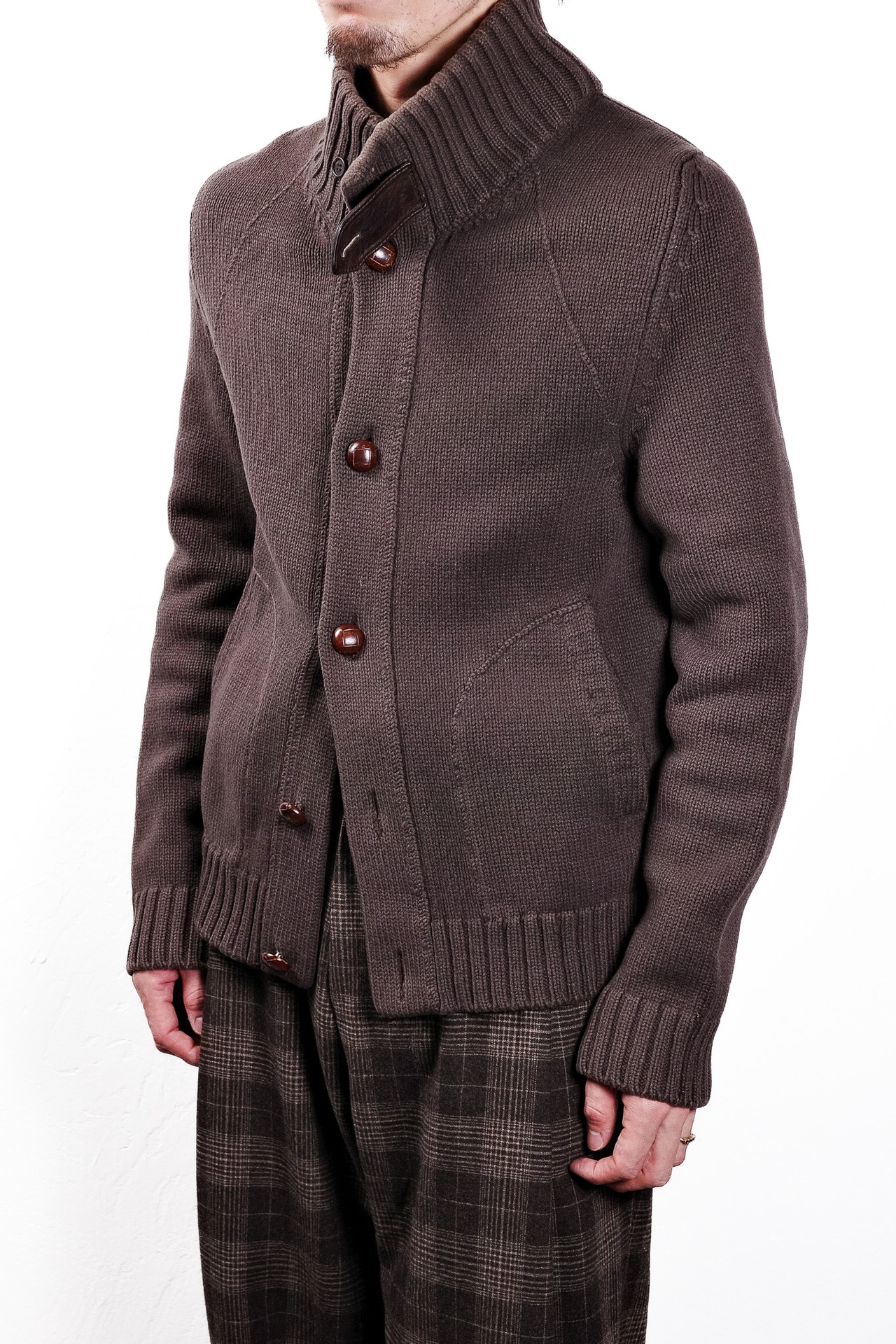 今回ご紹介するのは、そのリヴ・ゴーシュの歴史の中でも、ニットという極めて柔らかな素材を用いながら、ミリタリーやハンティングウェアに見られる強固なディテールを巧みに取り入れた、イタリア製のヘビーウール・ニットジャケットです。
