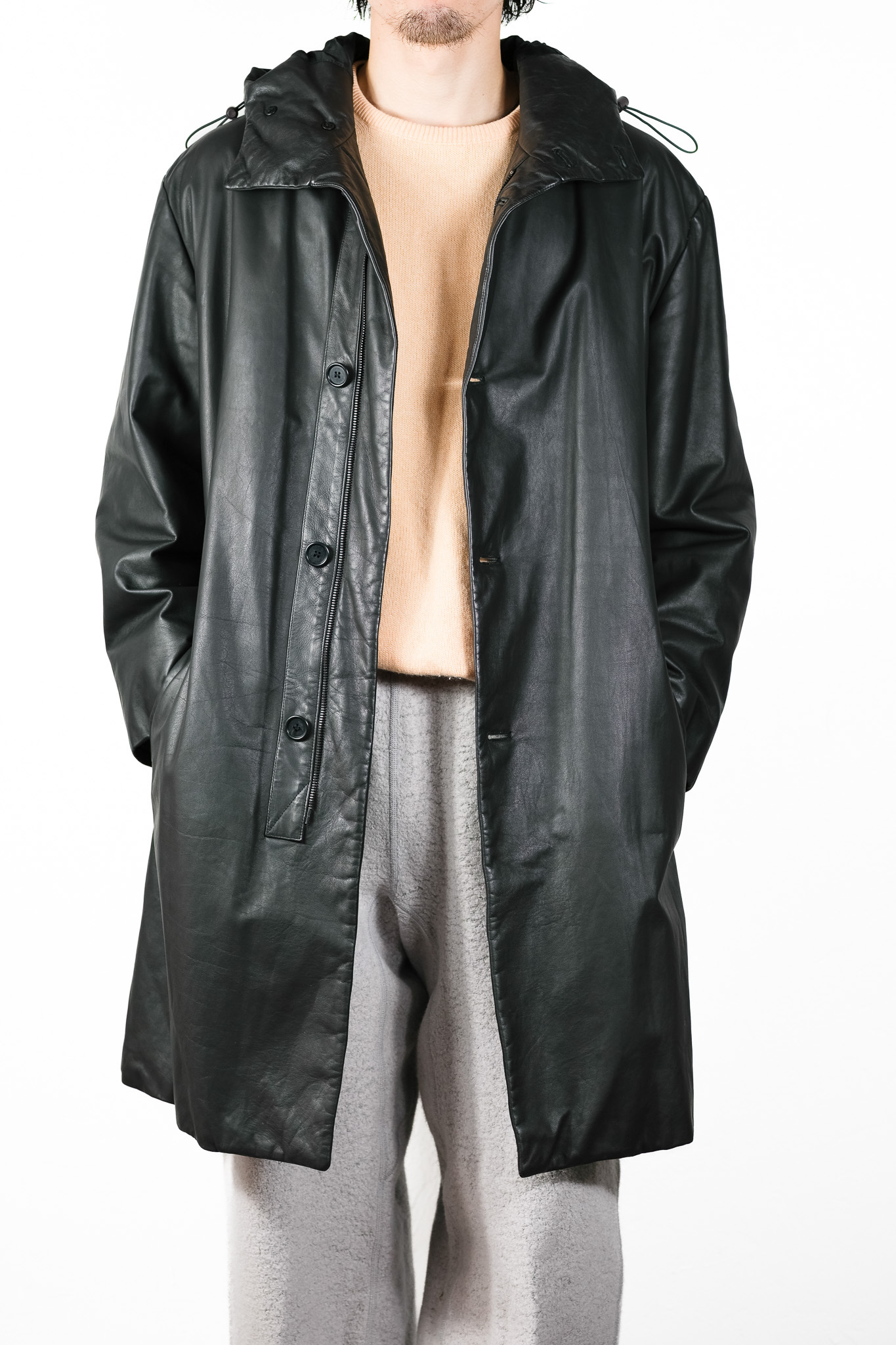 その恩恵は、ロング丈のコートという、レザーとしては非常に面積の大きいアイテムにおいて最大限に発揮されています。
