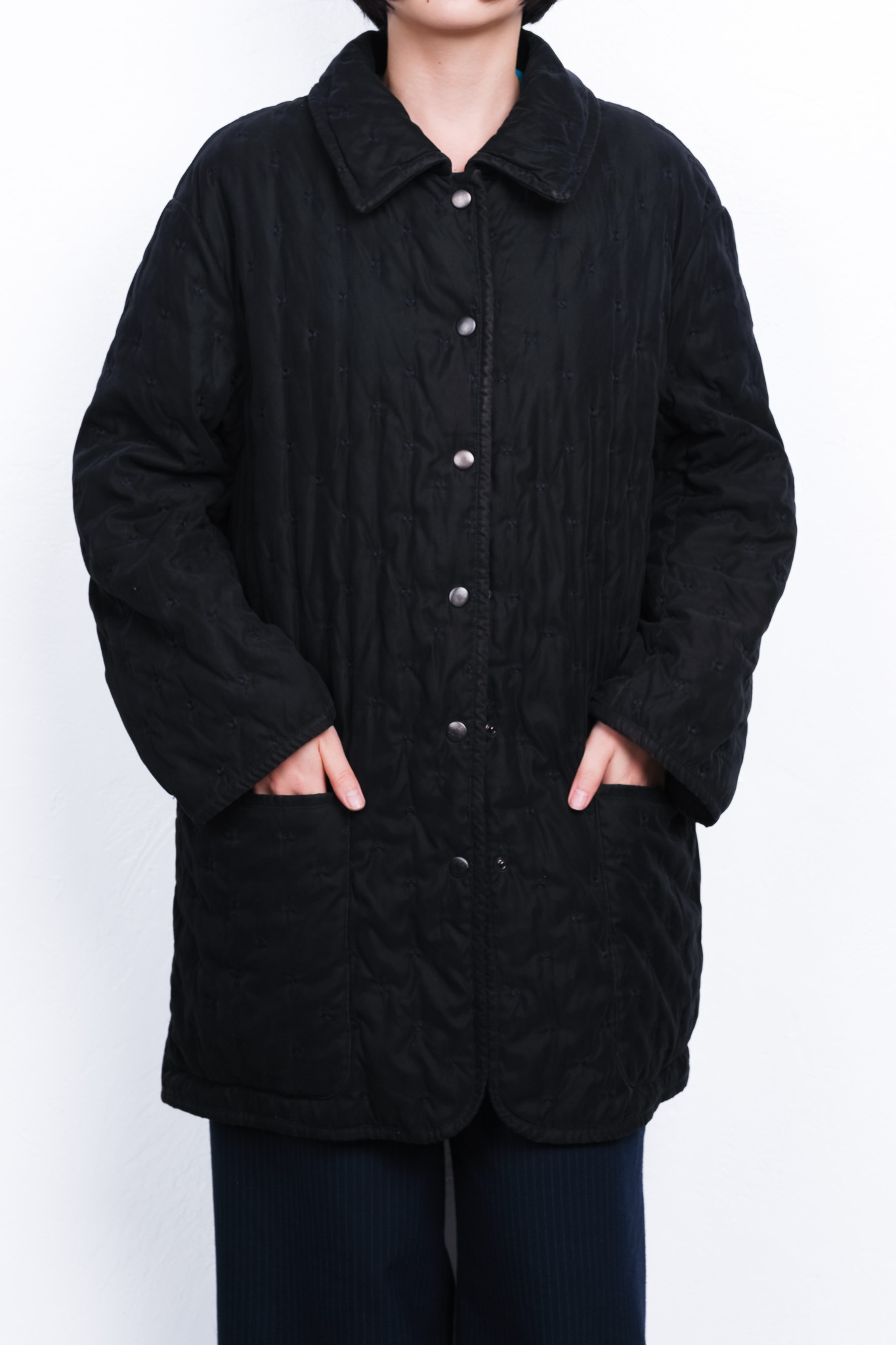 生地を「線」ではなく「点」で留めるこの独自の技法により、中綿のボリュームは極限まで抑制され、生地自体が持つフラットな美しさが強調されています。