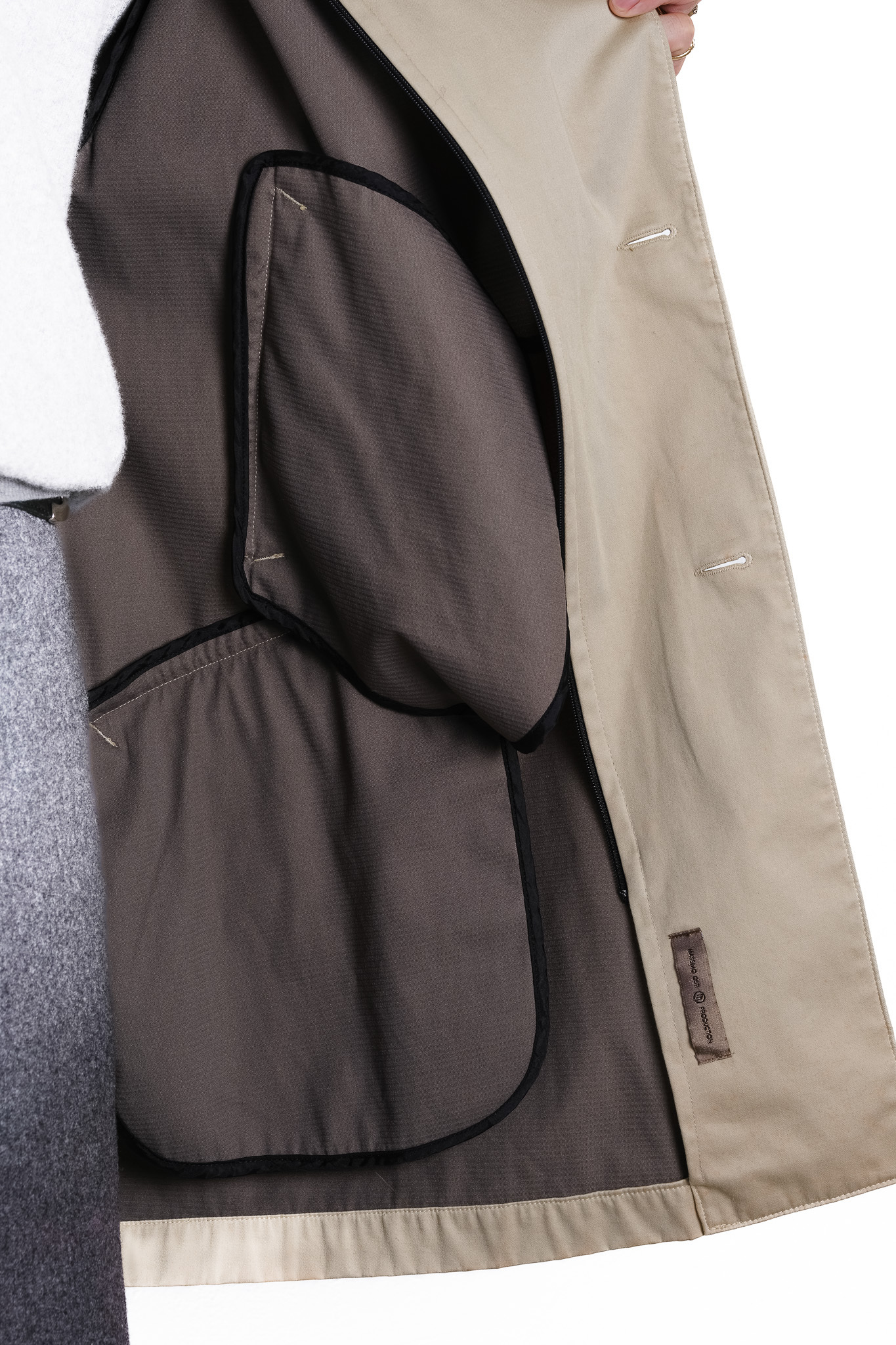 コートを脱いで裏返した時でさえ美しく見えるこの「インサイド・アウト」の処理は、見えない部分にこそ本質が宿るという彼の美学そのものです。