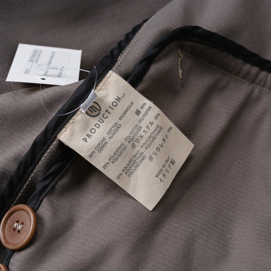 ボタンはブランド名の刻印さえない同色系のものが採用されており、全体として「無記名」なプロダクトであることを強調しています。