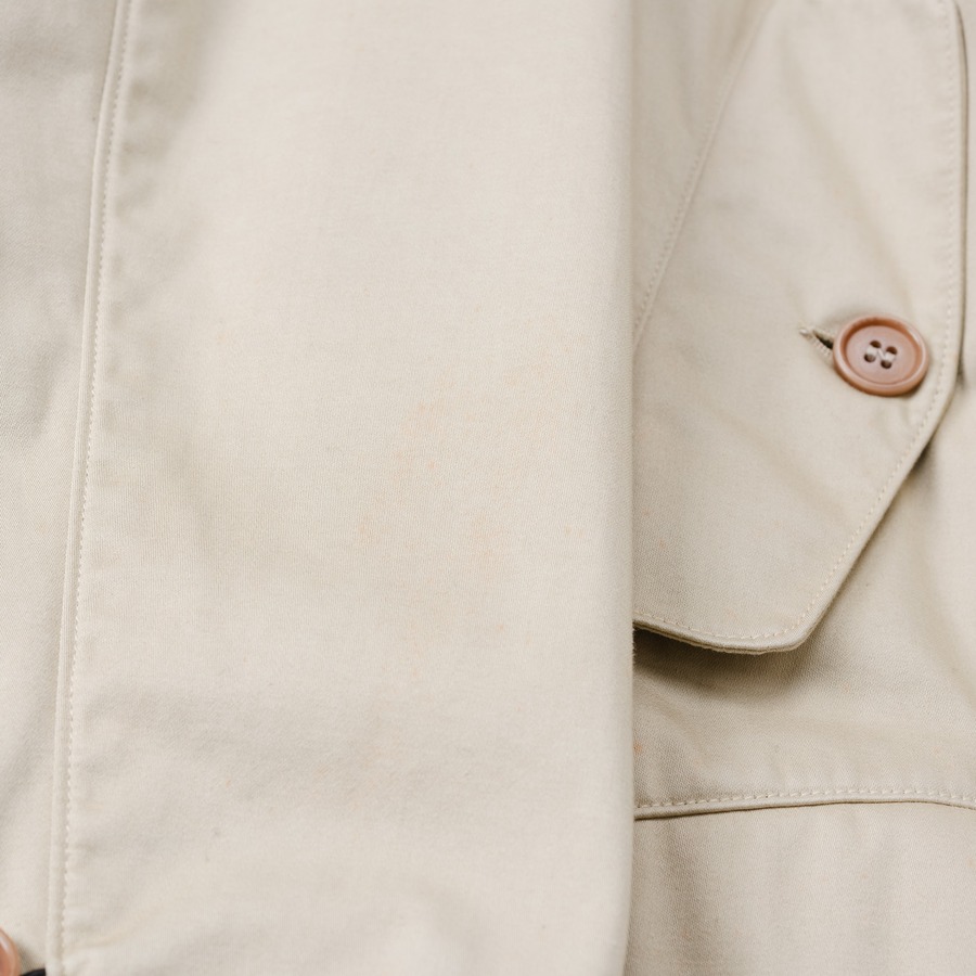 裏地を持たない一重仕立てでありながら、内側の縫い代はすべて黒いテープで丁寧にパイピング処理されています。