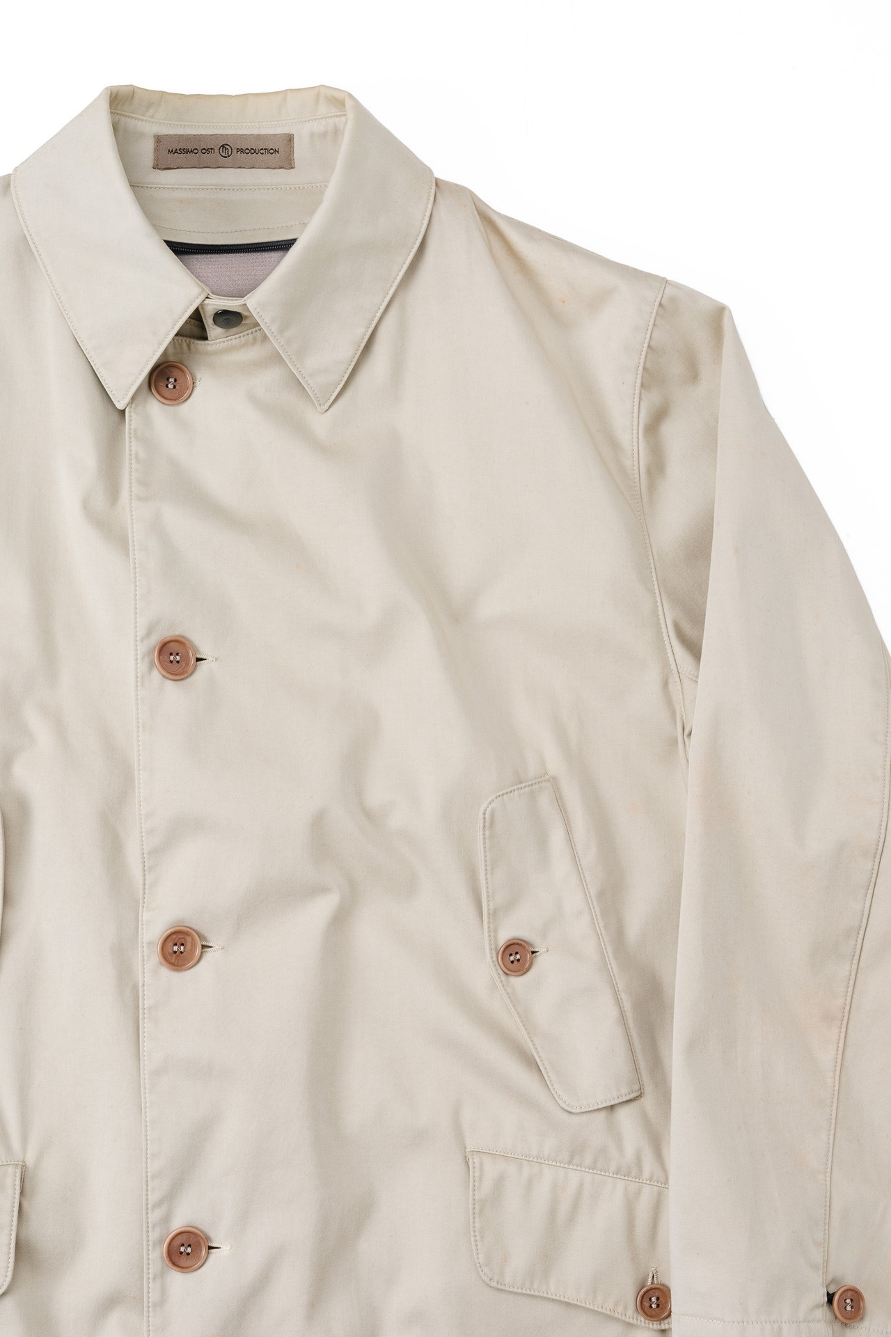 今回ご紹介するのは、そんなオスティのキャリアの中で最も純度が高く、そして最も個人的な思考が詰め込まれたラインからリリースされた、ボンディング素材のカーコートです。