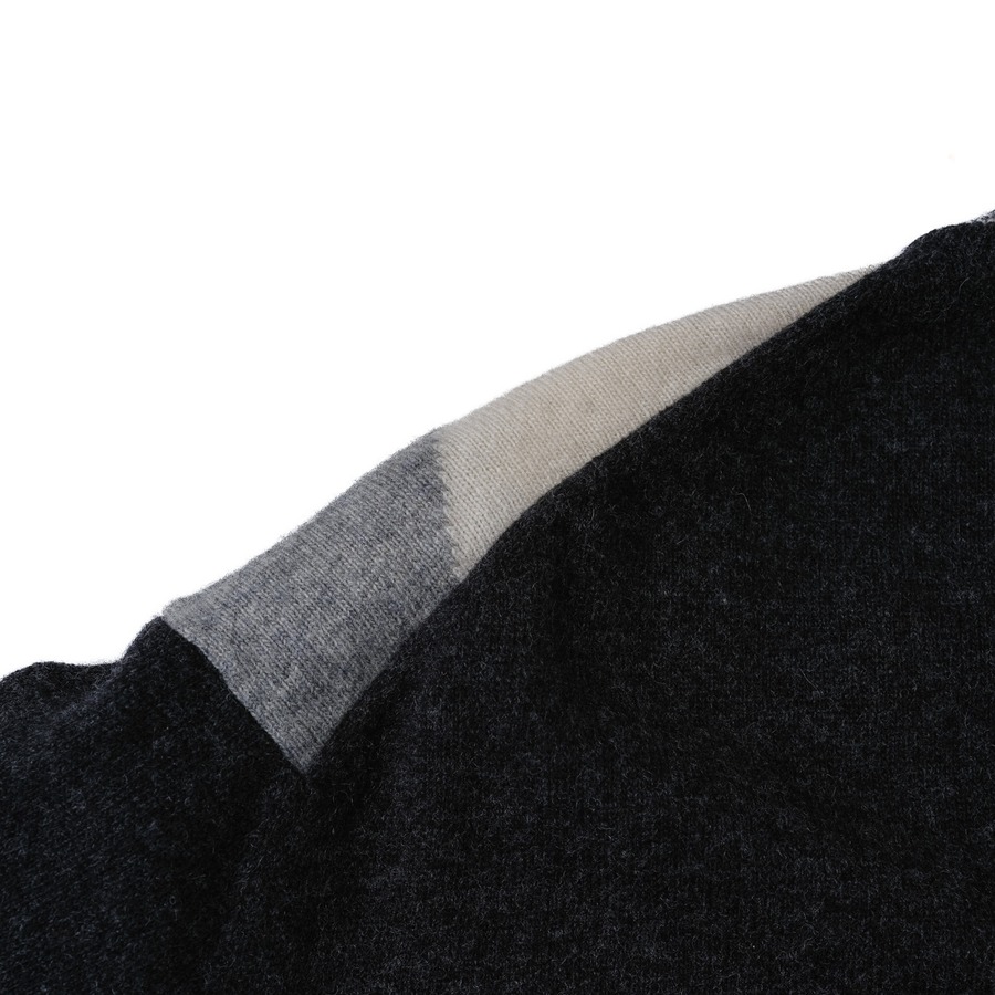 ネックラインと袖口のリブに施されたストライプも、クラシックなデザインに対する知的なアクセントとして機能しており、単調になりがちなニットスタイルを引き締めてくれます。