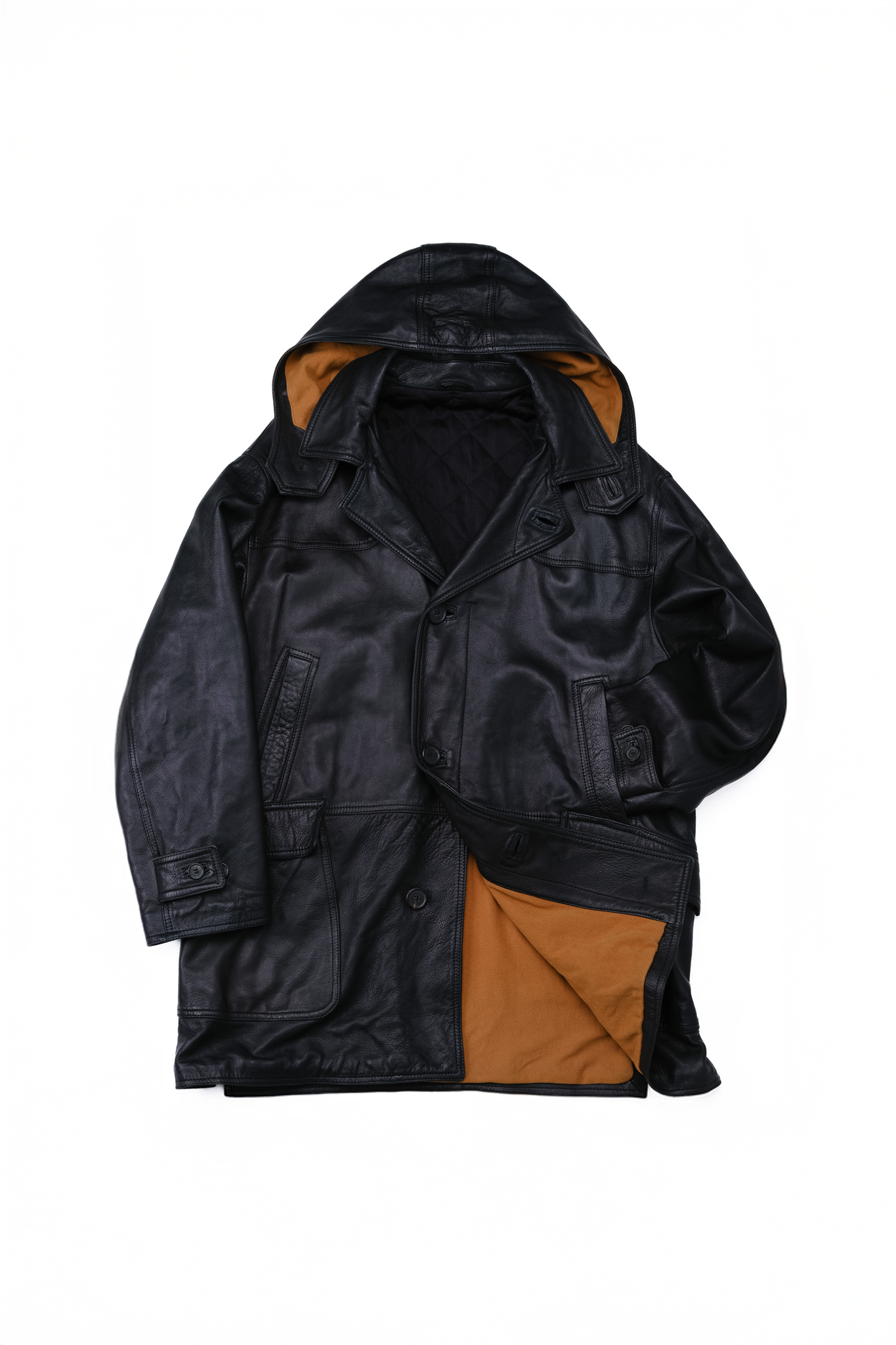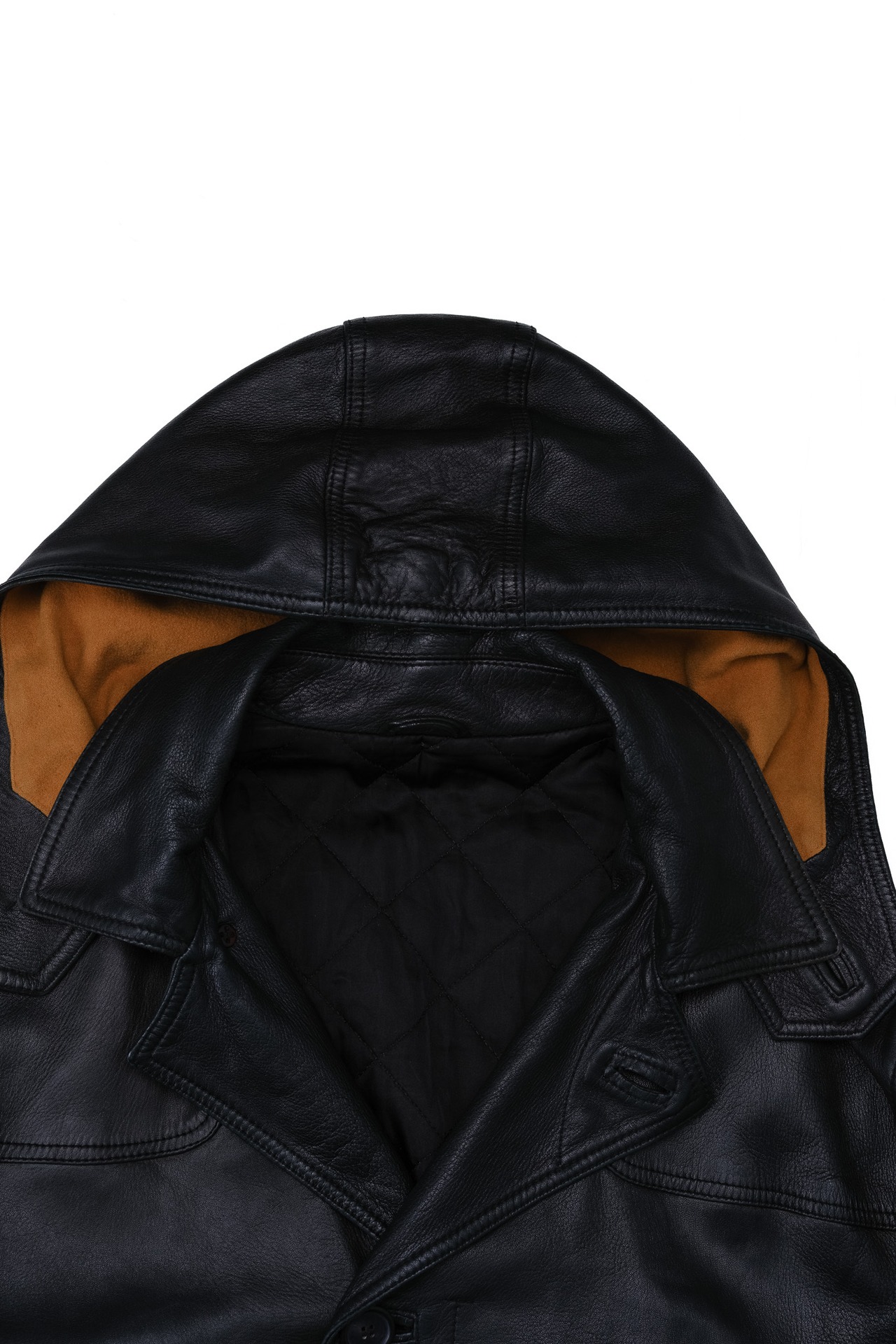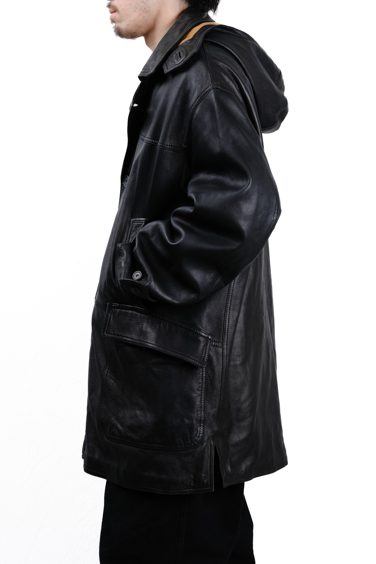ヒップが隠れる絶妙な丈感のハーフコートをベースに、あえてスポーティなフードを取り付けることで、レザー特有の堅苦しさを中和し、日常に溶け込むモダンな佇まいに仕上げています。