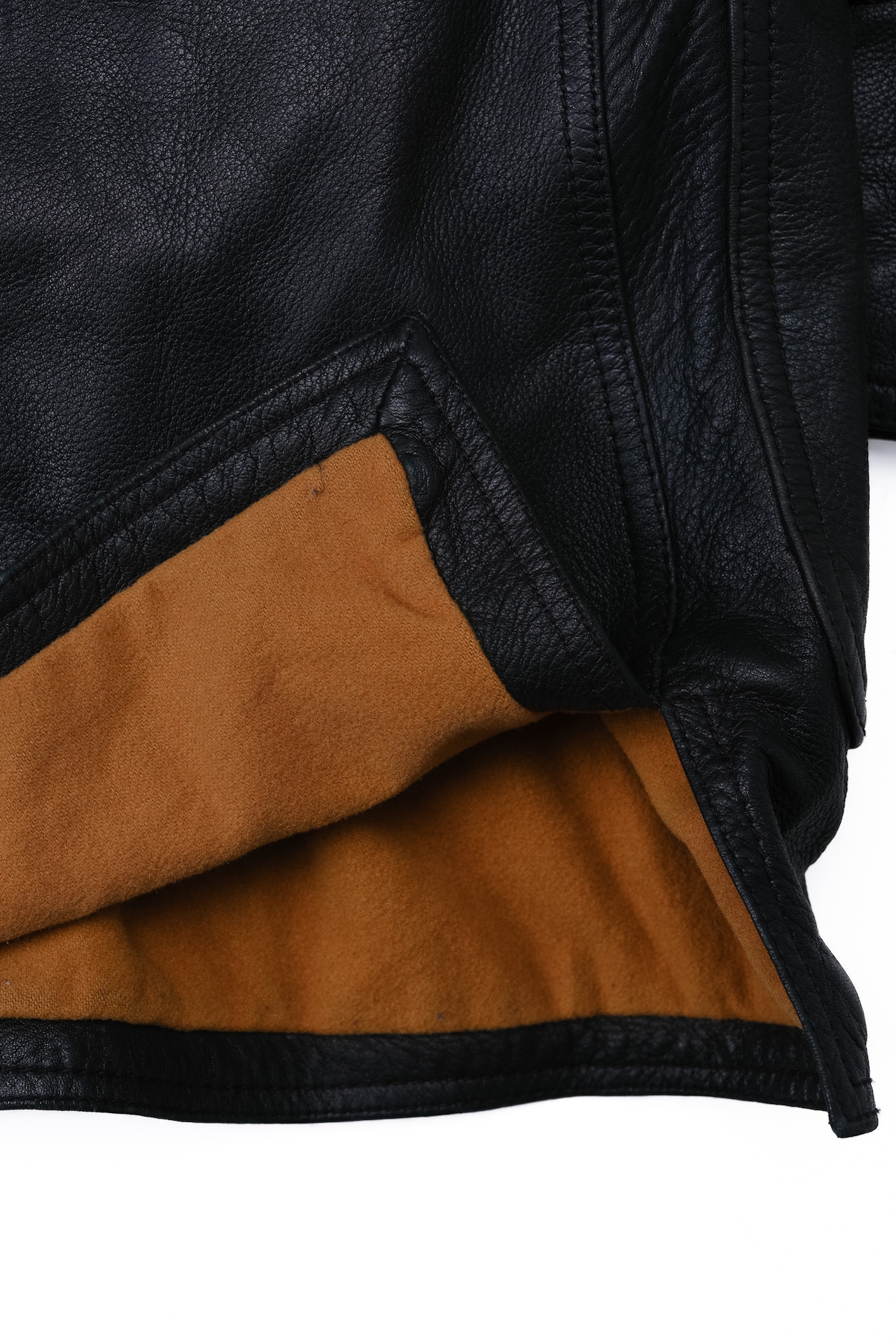 重厚なブラックレザーの裏側には、対照的なキャメルカラーのウールライニングが配されています。