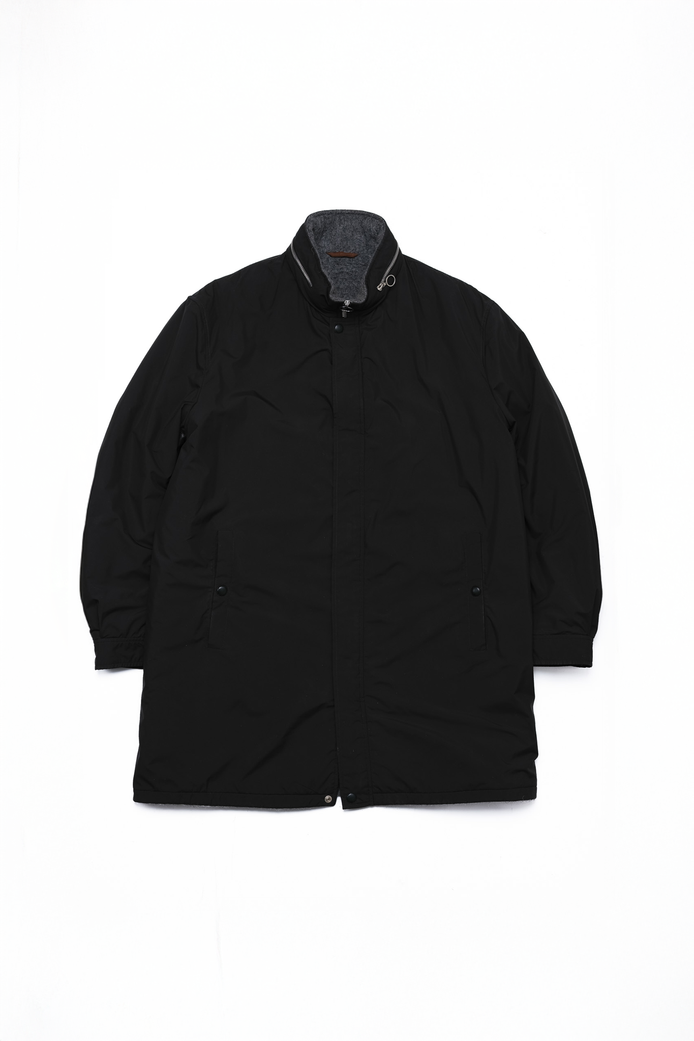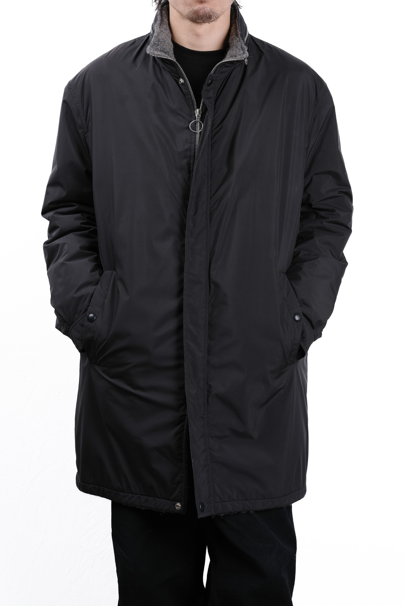 スタンドカラーの襟元は非常に構築的で、ジッパーを上げればマフラー要らずの防寒性を発揮し、開ければアルパカの起毛感が顔周りをエレガントに彩ります。