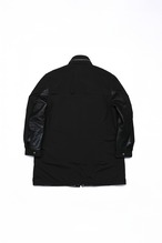袖を構成する立体的なパネルのうち、肘から手首にかけての下側部分、つまり日常動作において最も摩耗しやすい箇所にのみ、とろけるように滑らかなラムスキンが配されています。