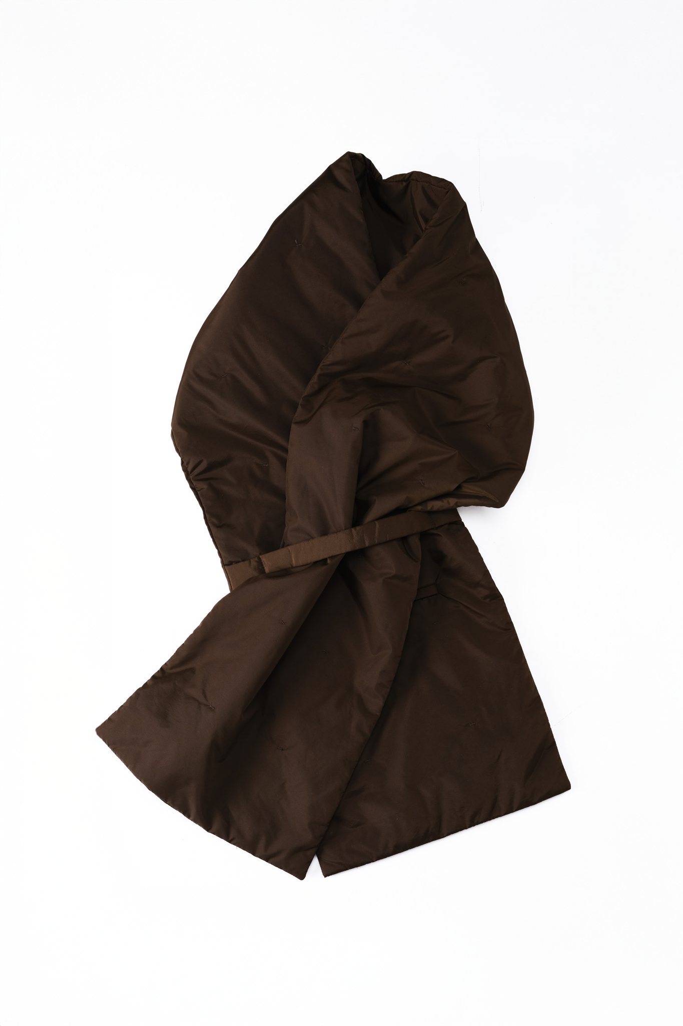 通常のマフラーにしては、どこか構築的で、中綿を含んだふっくらとした厚みがある。