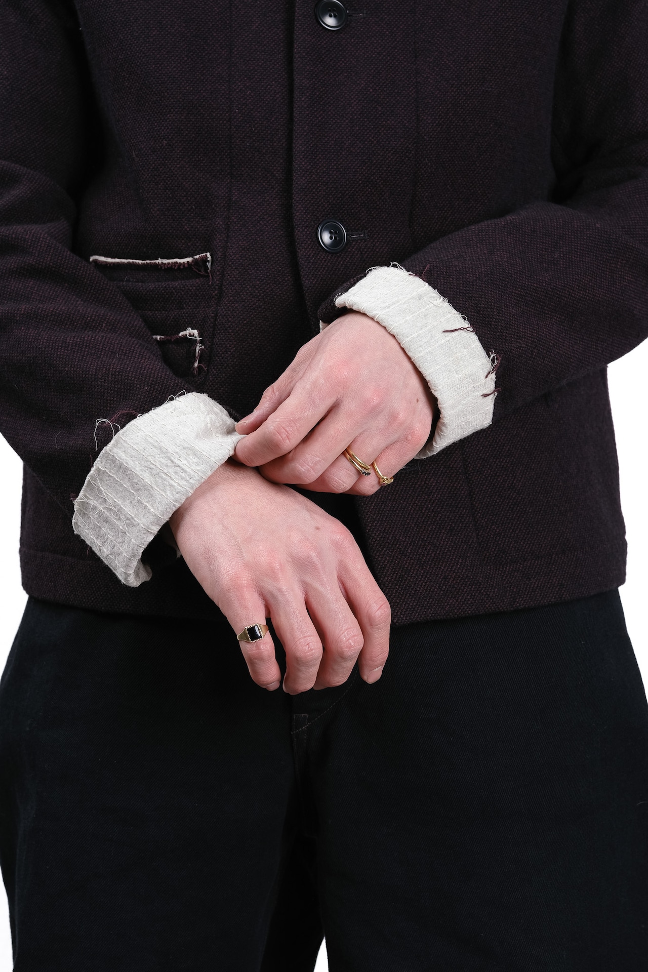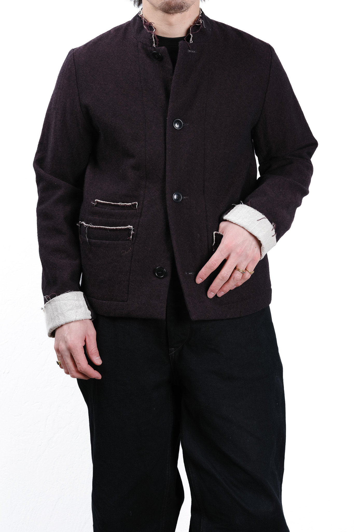 今回ご紹介するのは、そんなシリン・ギルドのキャリアの中でも、特に実験的で、素材のテクスチャーと未完成の美に深く踏み込んだ、稀有なスタンドカラージャケットです。