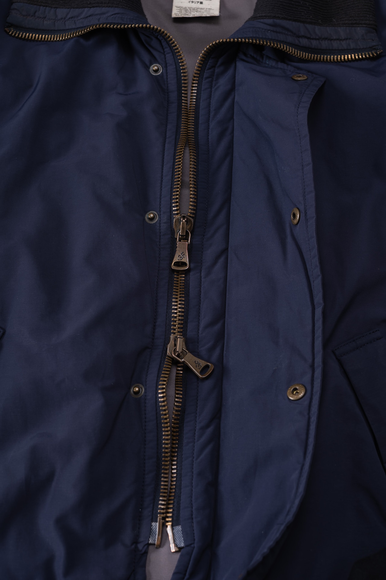 ジッパーの引き手にはブランドロゴであるGFの刻印が入ったオリジナルの金属パーツが使用され、その鈍い金色の輝きが、ダークトーンのボディに対して重厚なアクセントになっています。