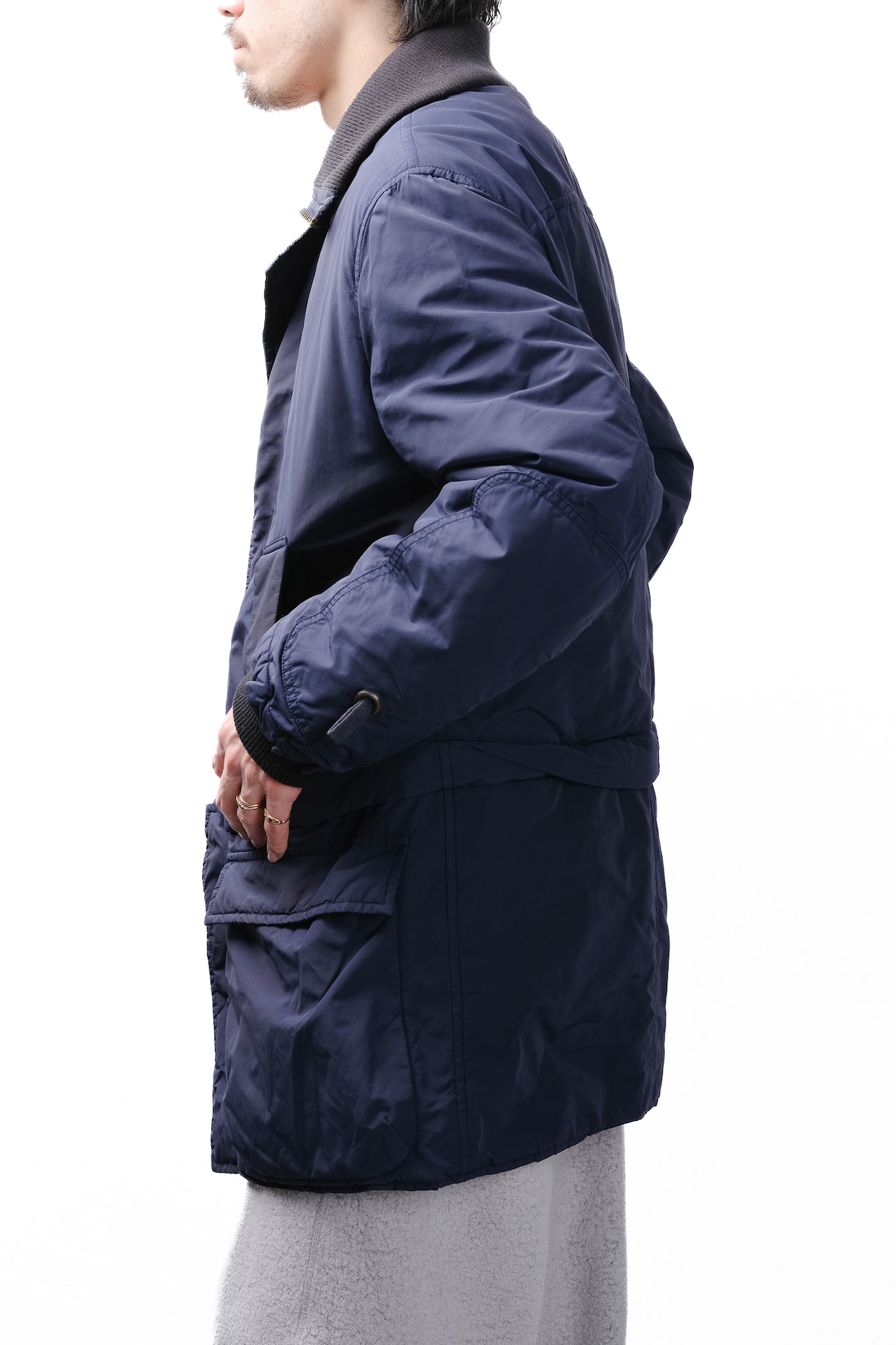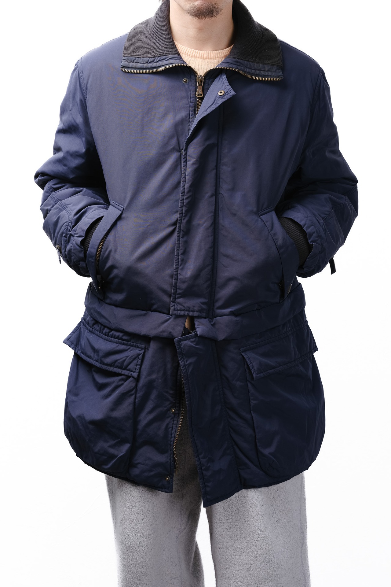 つまり、この一着は、エレガントなフィールドコートと、アクティブなフライトジャケットという、全く異なる遺伝子を持つ二つの衣服を、一本のジッパーという境界線で接合し、融合させているのです。
