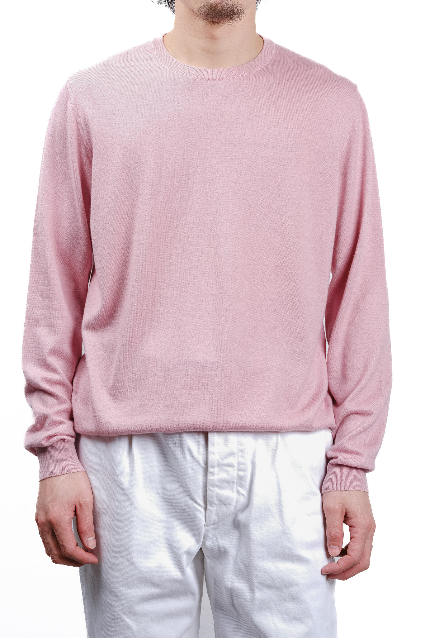 今回ご紹介するのは、そのマーロがカシミヤの専門性を活かしつつ、春先や秋口といった季節の変わり目に最も美しく映えるよう設計した、カシミヤ60%・コットン40%という贅沢な混紡のクルーネックニットです。