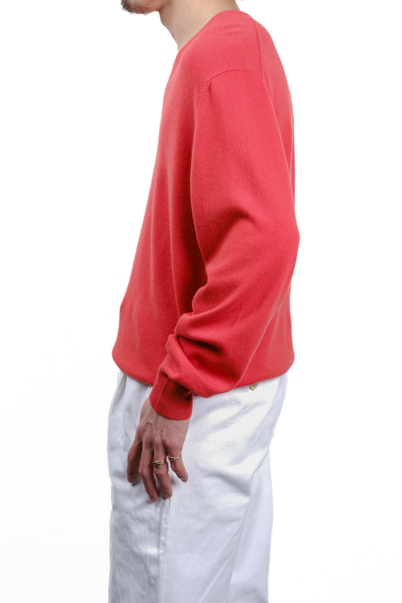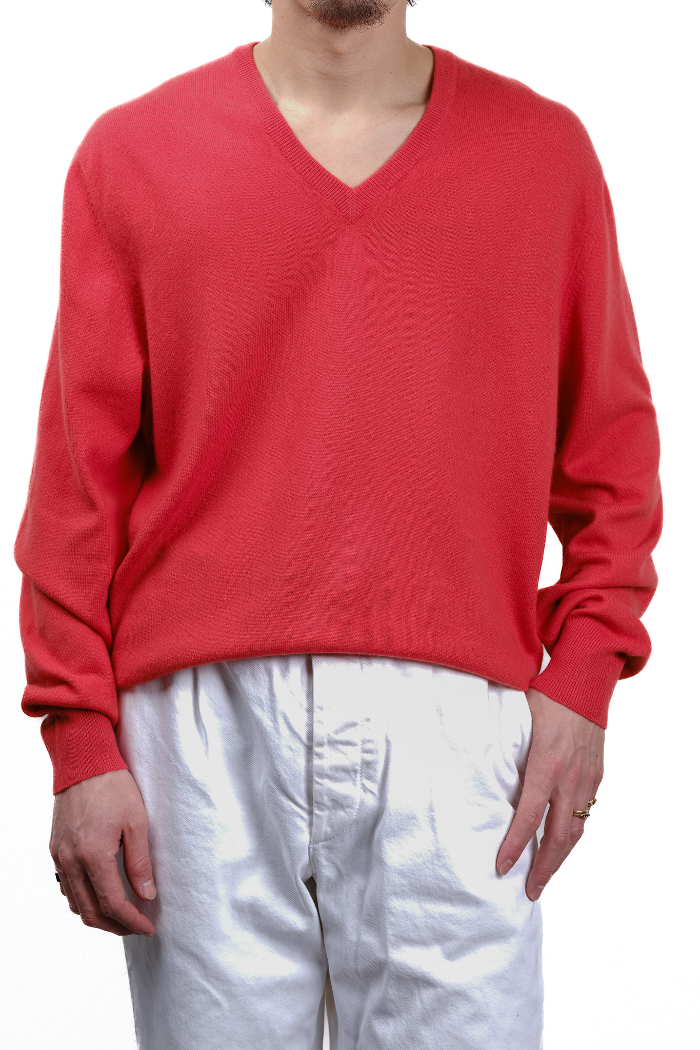 Vネックの深さもまた、現代的な装いに馴染む絶妙な塩梅で設計されています。