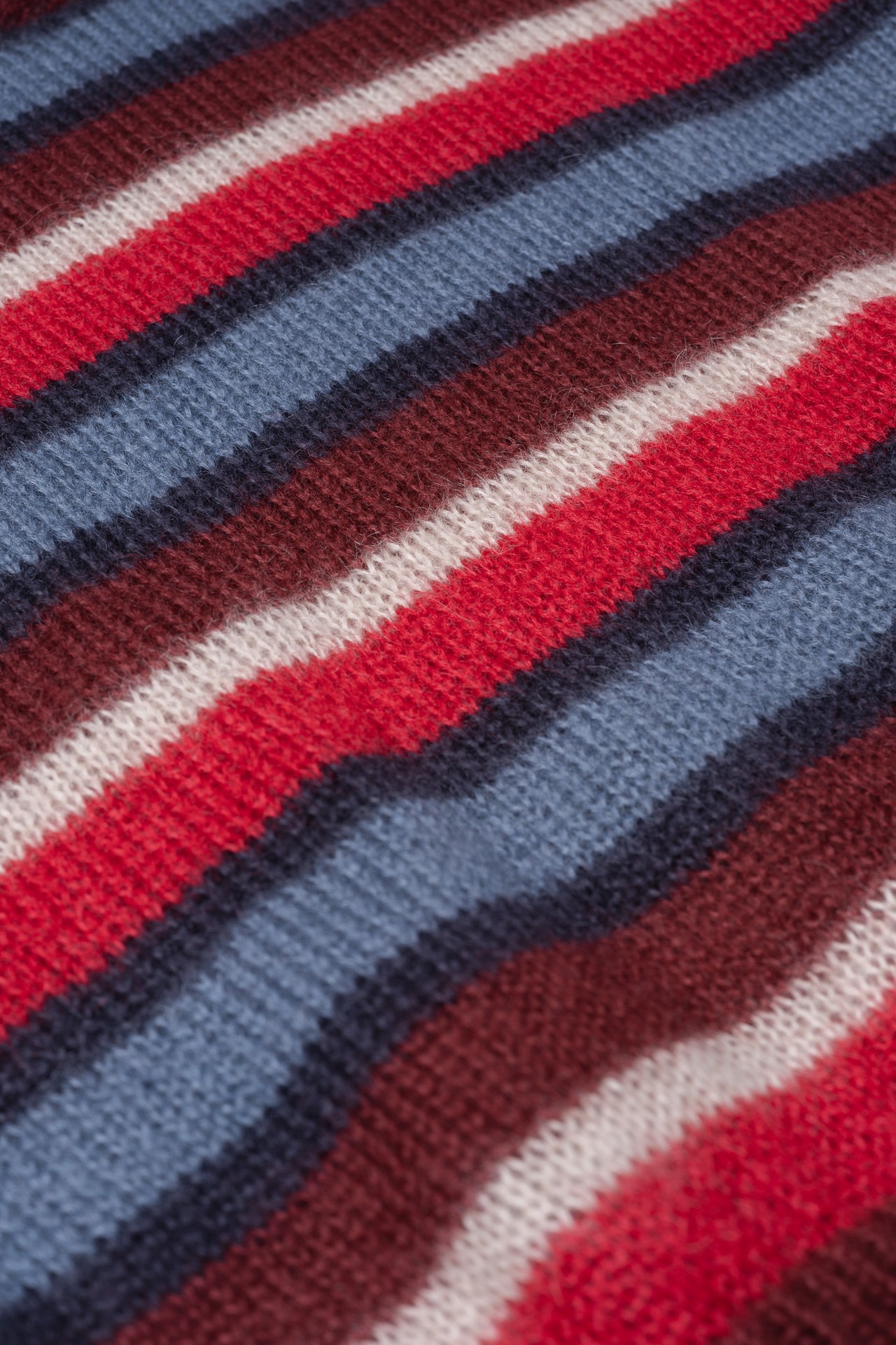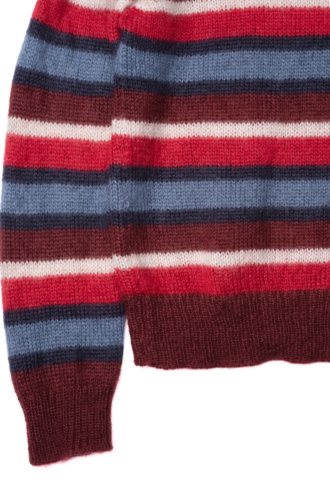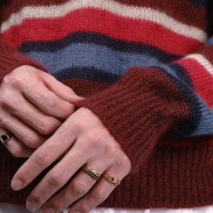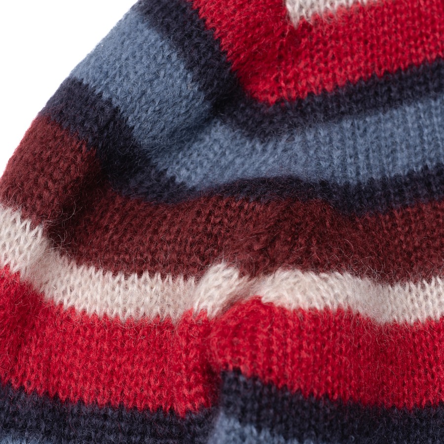 モヘアという、本来であれば自由で捉えどころのない素材に対し、あえてこの数学的で工業的なアプローチを適用することで、ニット全体に強力な「秩序」と「緊張感」を与えているのです。