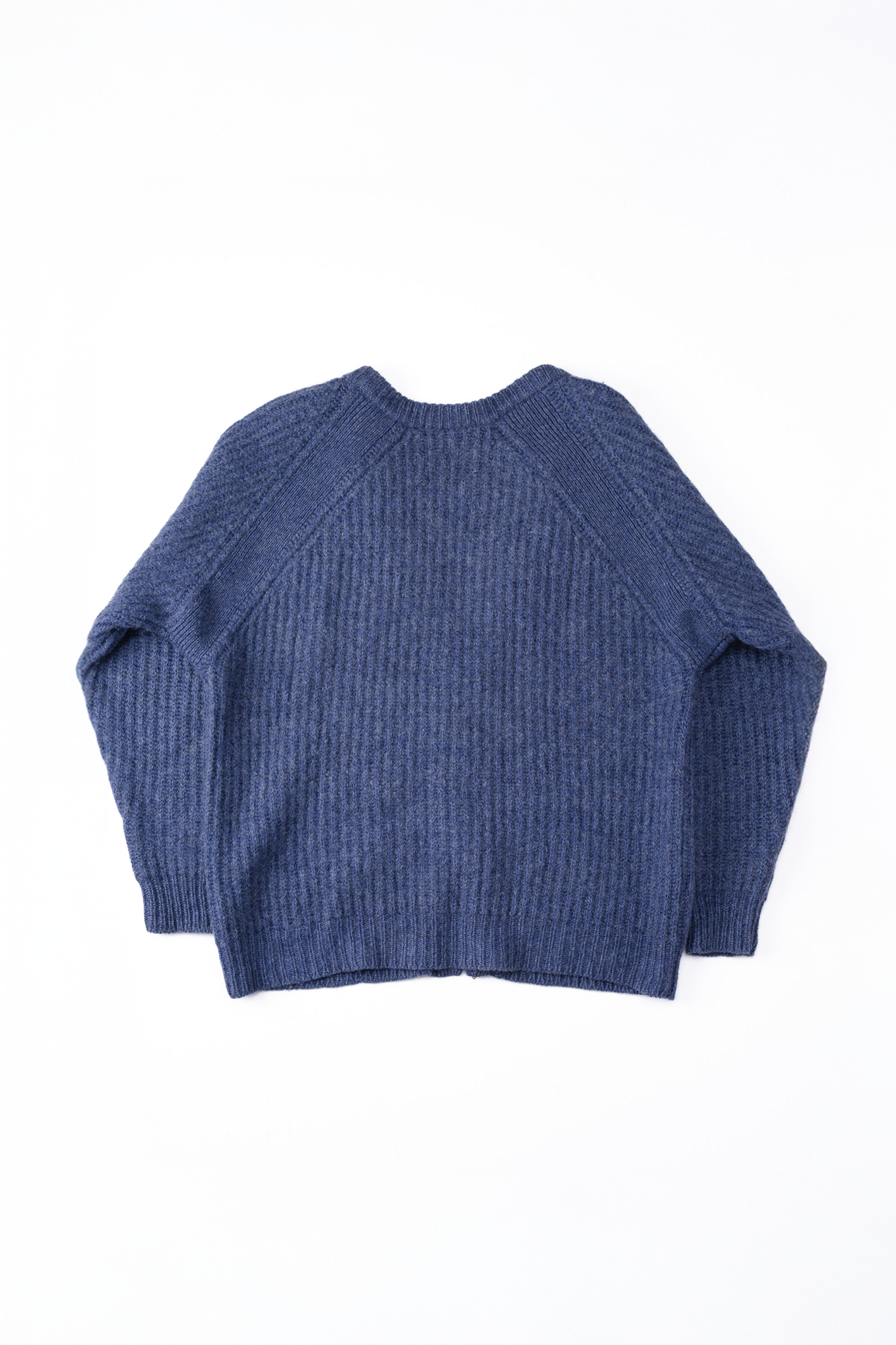 通常、ラグランは身頃と袖を一本の縫い目で繋ぎ合わせますが、この個体は、その接合部分に約2〜3cm幅の独立したリブパネルを割り込ませています。