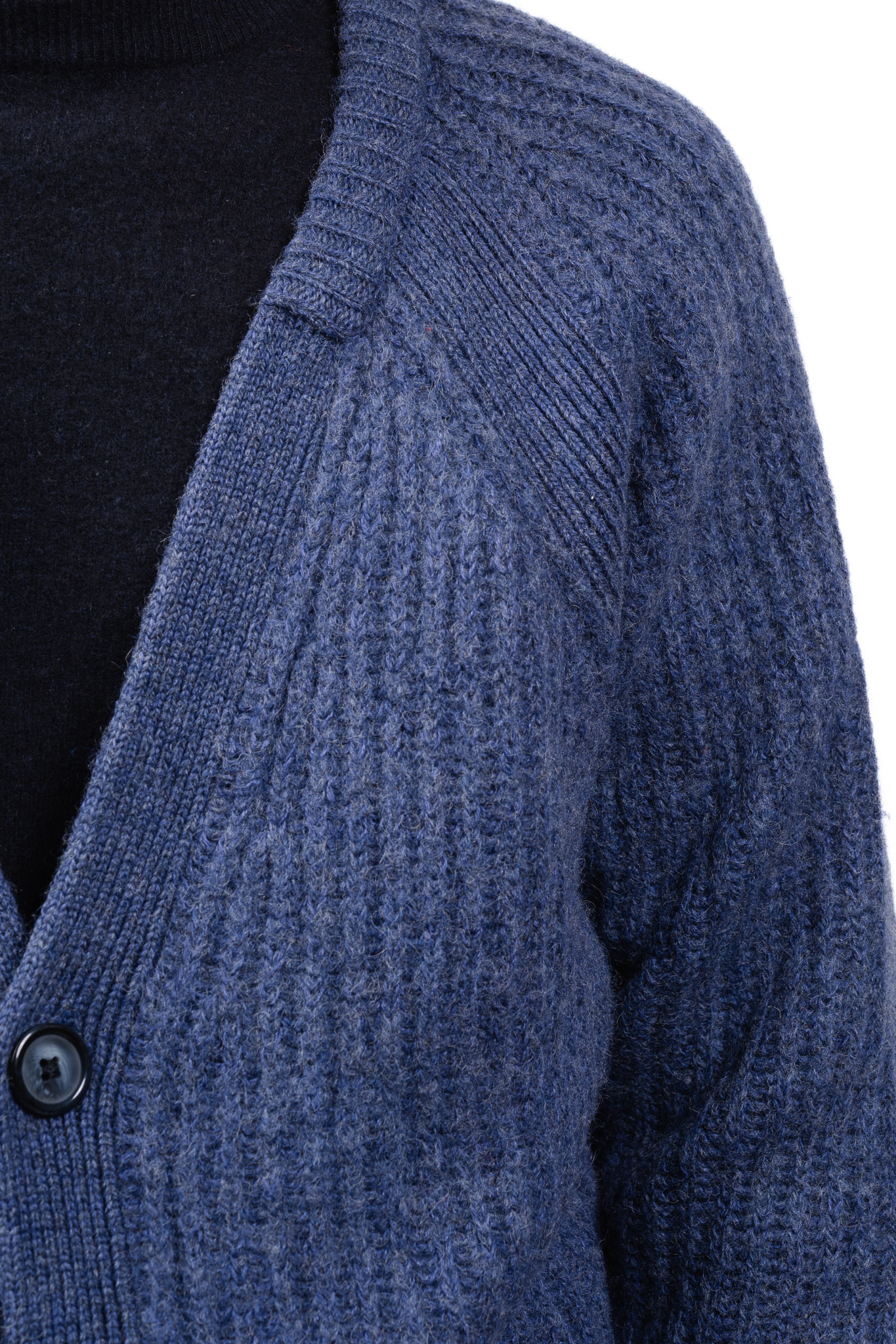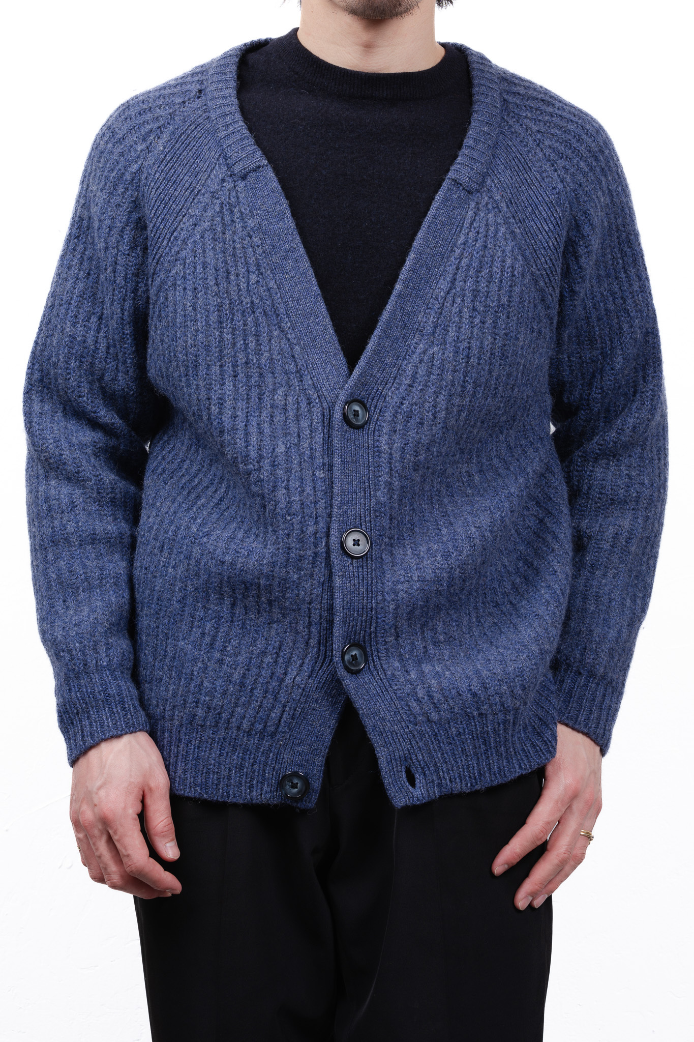 ボタンには、光沢を抑えた重厚な色のパーツが使われており、粗野なニットの質感を引き締める役割を果たしています。