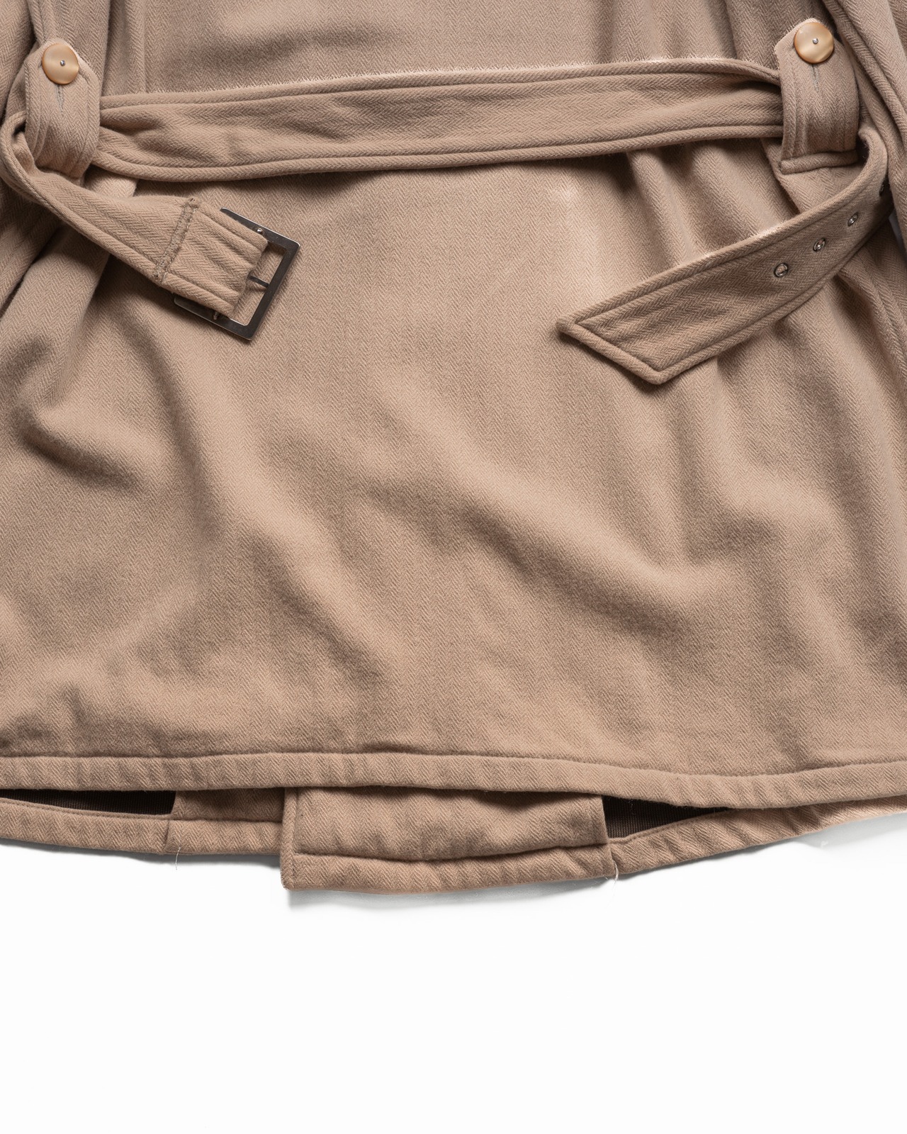 ラウンドを描く前立てや、大きく重なり合うダブルブレストの構造は、まさにミリタリージャケットの意匠を継ぐディテールです。