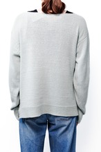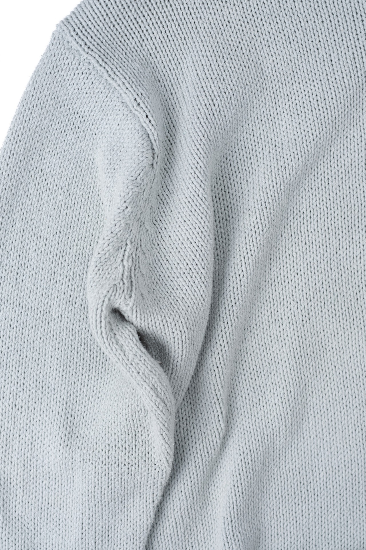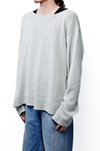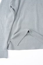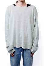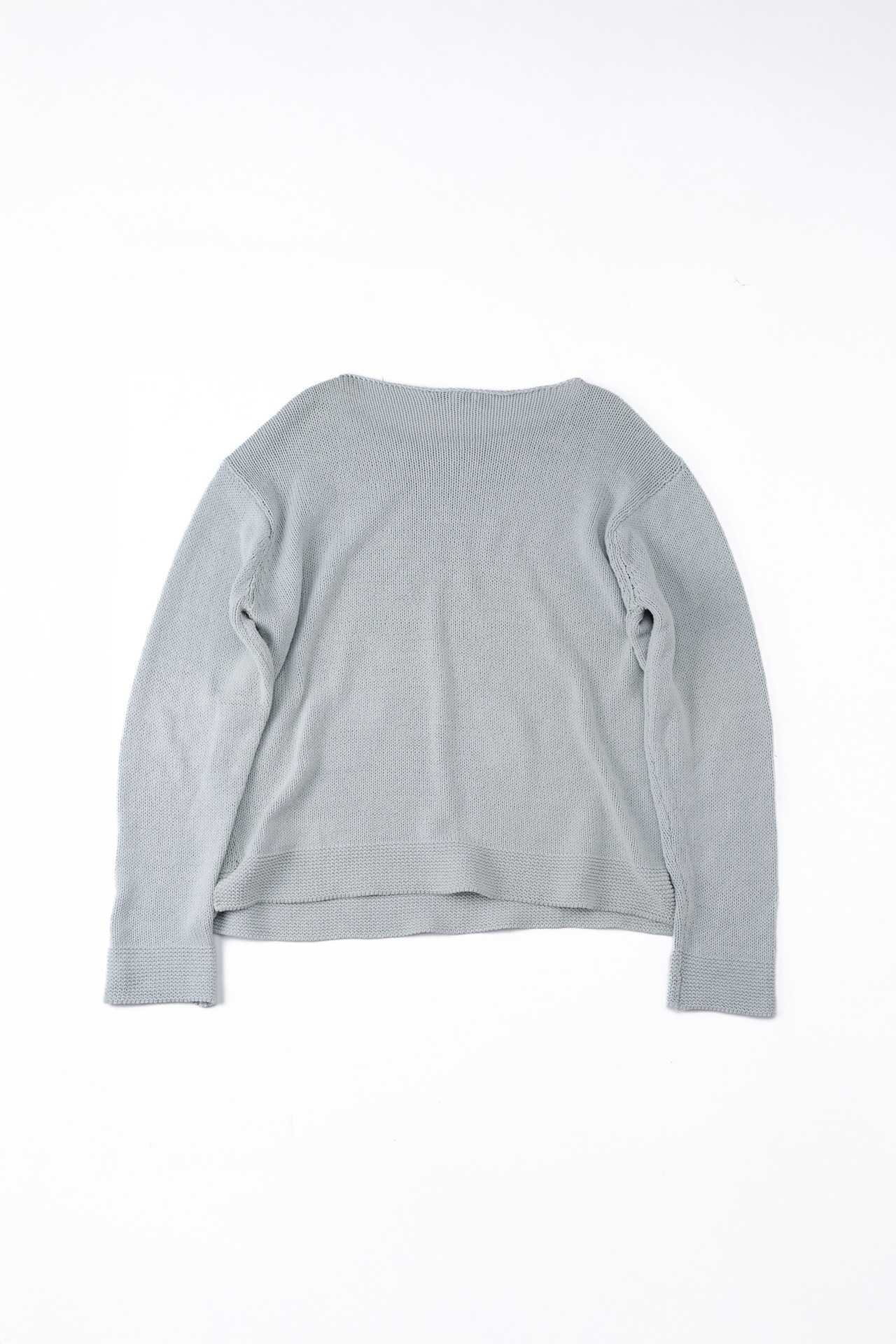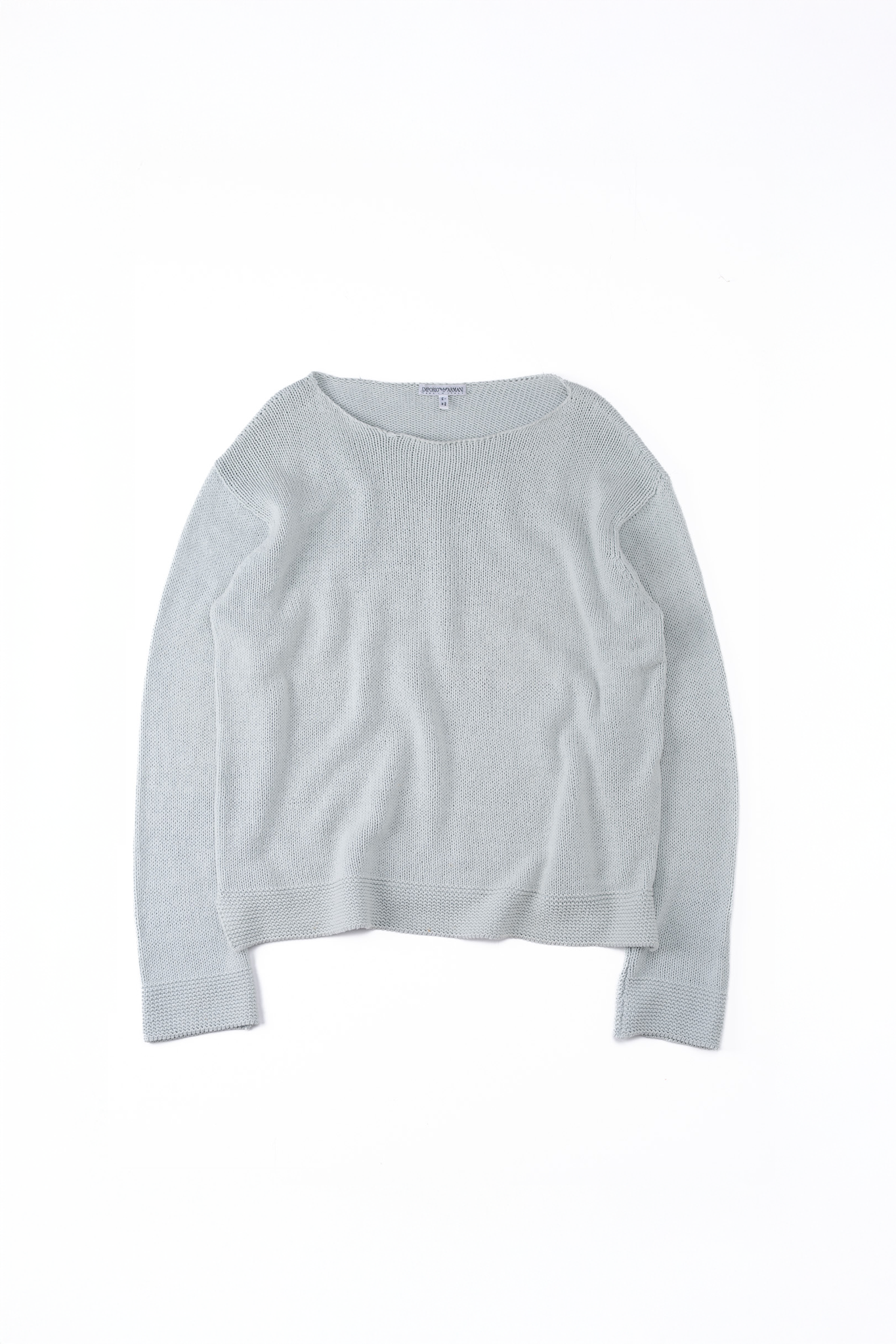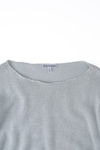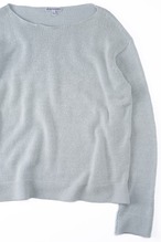 通常であればリブで締めるところを、あえて編みっ放しのように端が自然にロールする仕様を採用し、横に広いボートネック気味に設定しています。