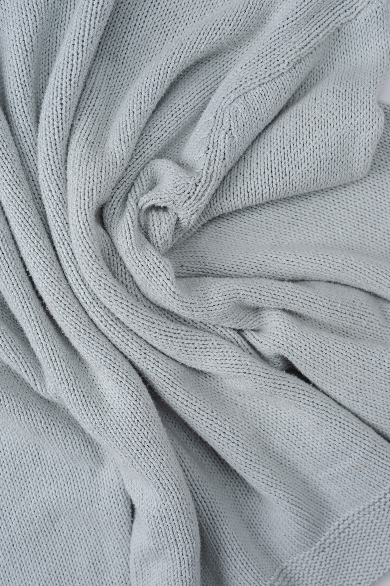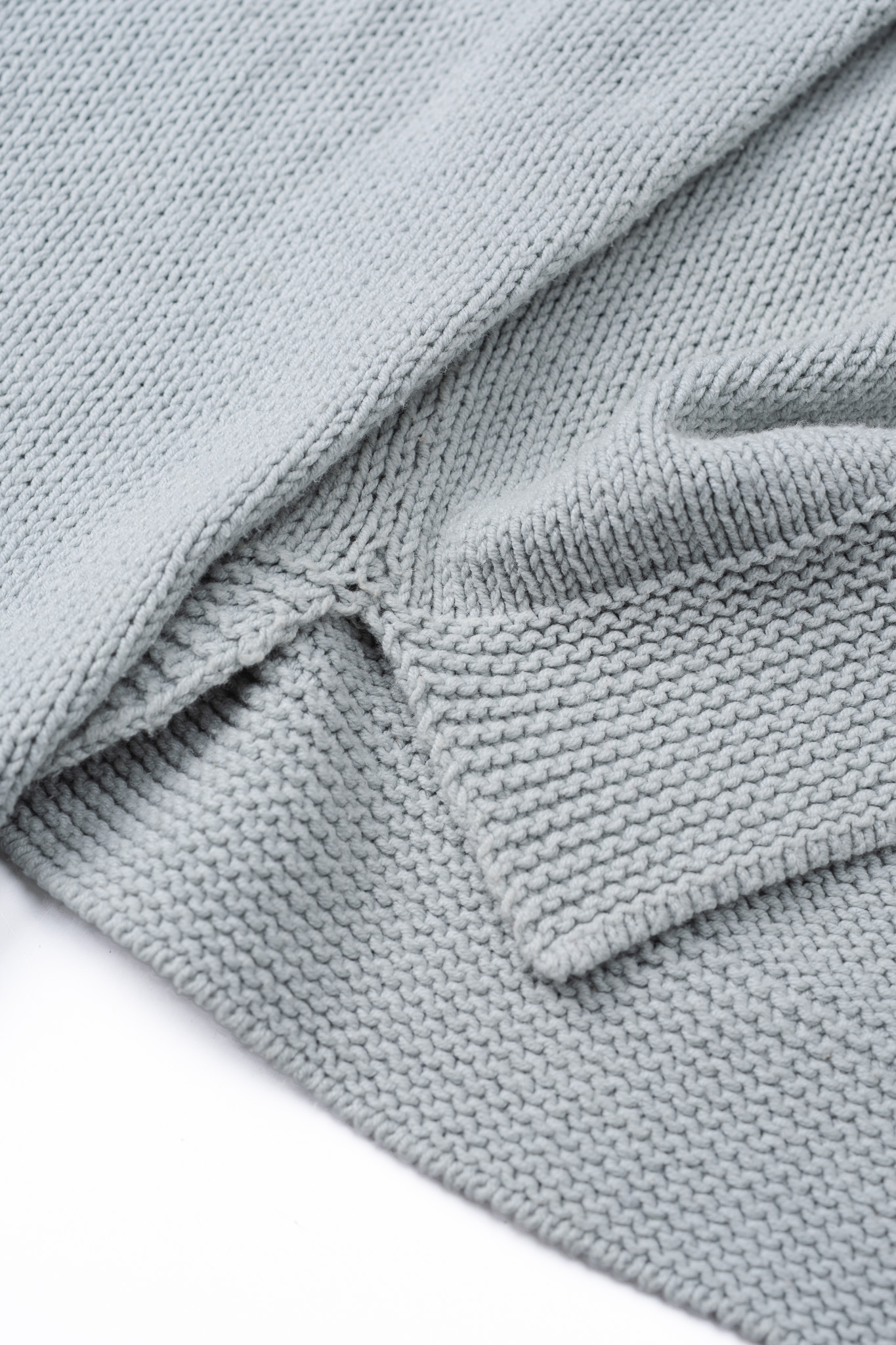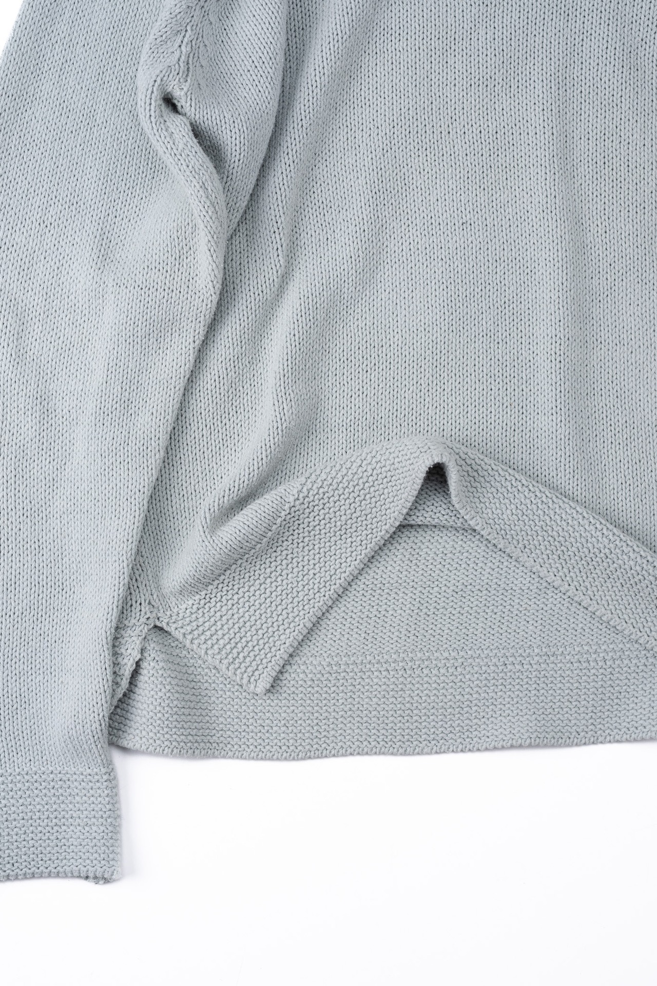 メインのボディ部分はフラットな天竺編みですが、裾と袖口の広い範囲は、横方向の畝が特徴的な「ガーター編み」に切り替えられています。