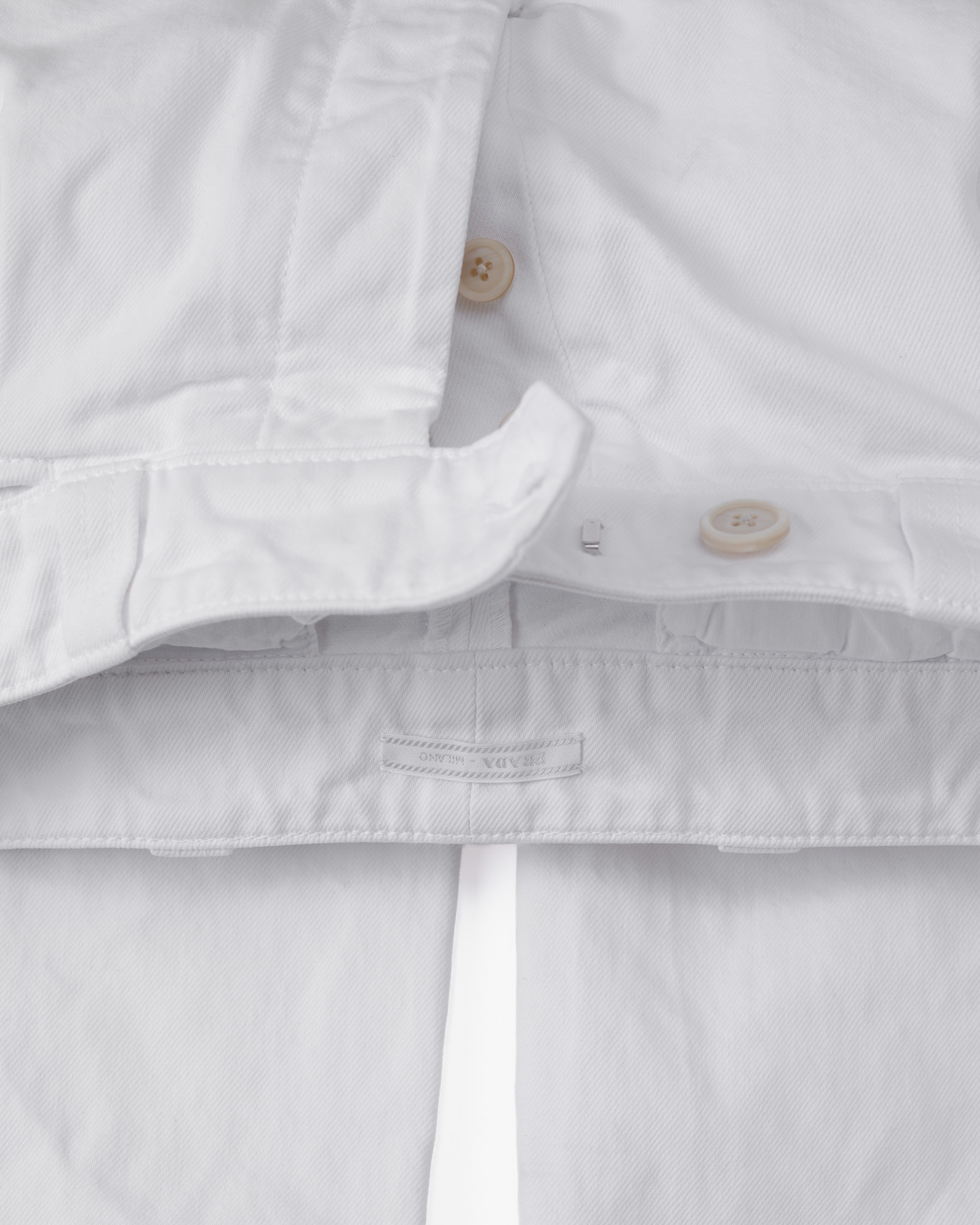 今回ご紹介するホワイトトラウザーズは、まさにそんなプラダの「実用的なラグジュアリー」という哲学が、最も純度の高い形で結晶化した一着と言えるでしょう。