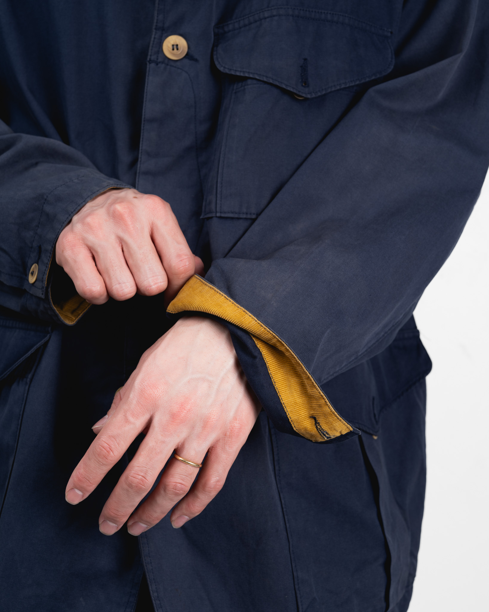 同じコーデュロイ生地は袖口の裏側にも贅沢に張られており、ボタンを外して無造作に袖を捲り上げた際にふわりと顔を覗かせます。