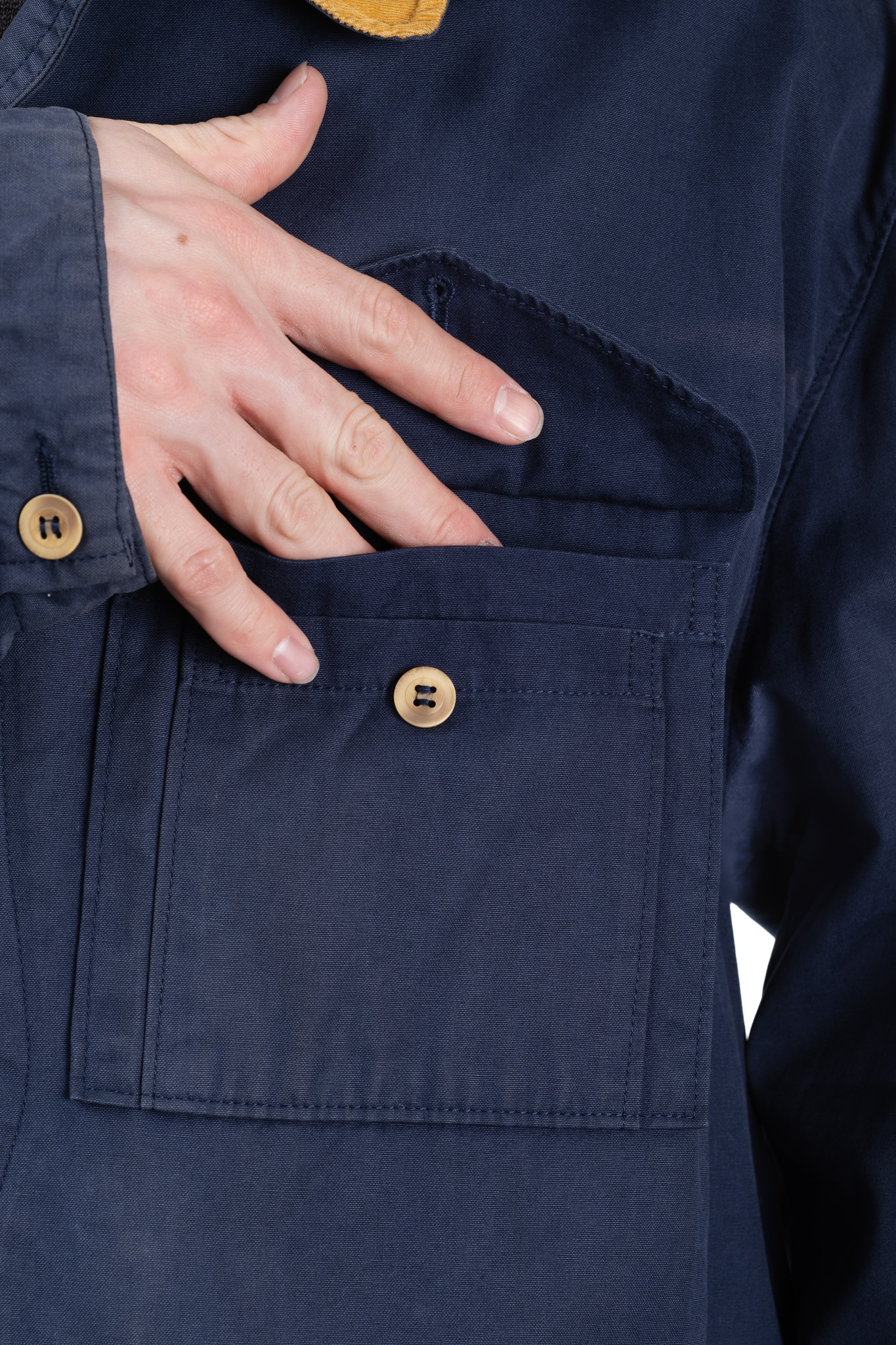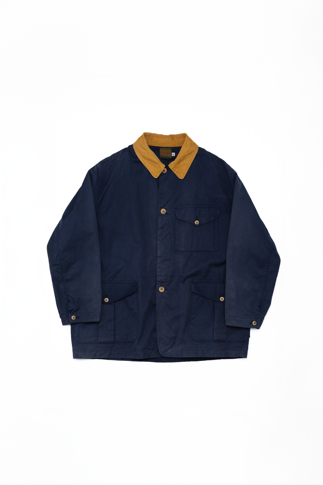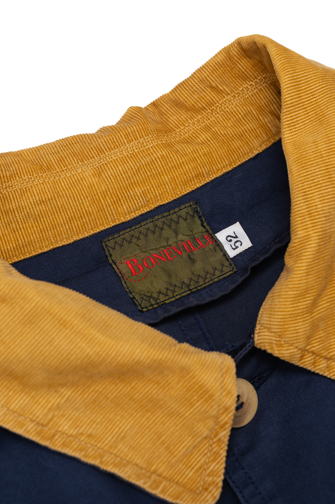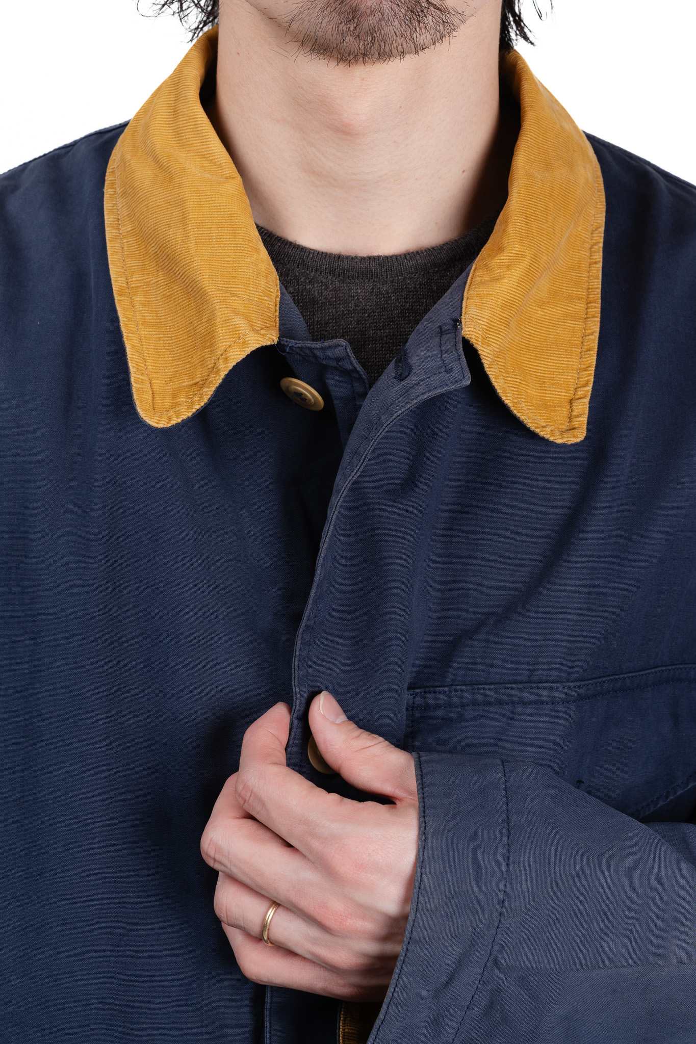 深く沈み込むようなネイビーのボディに対して、襟元にはマスタードイエローの太畝コーデュロイが大胆に切り替えられています。